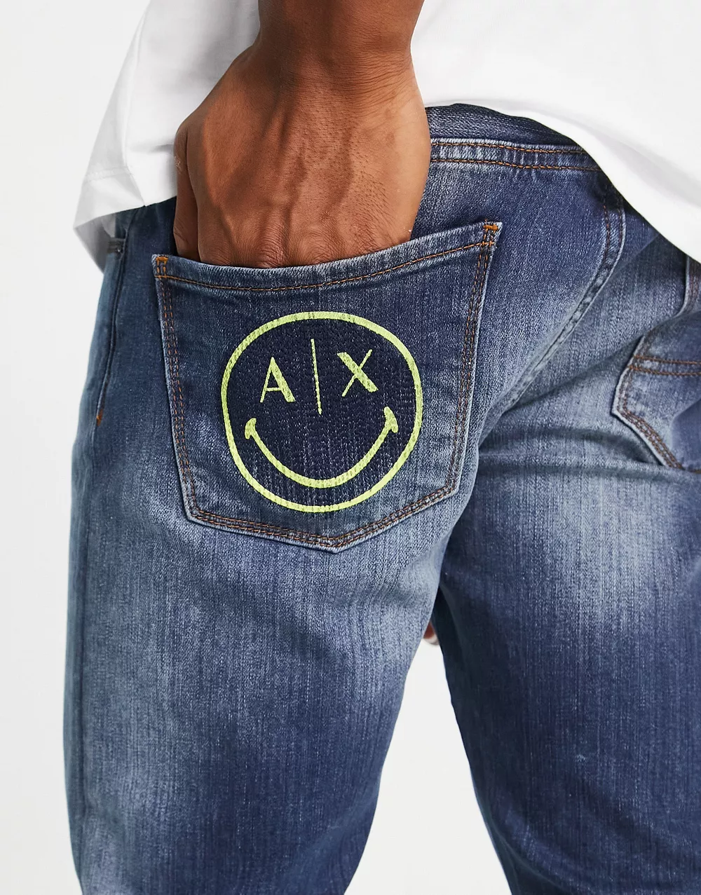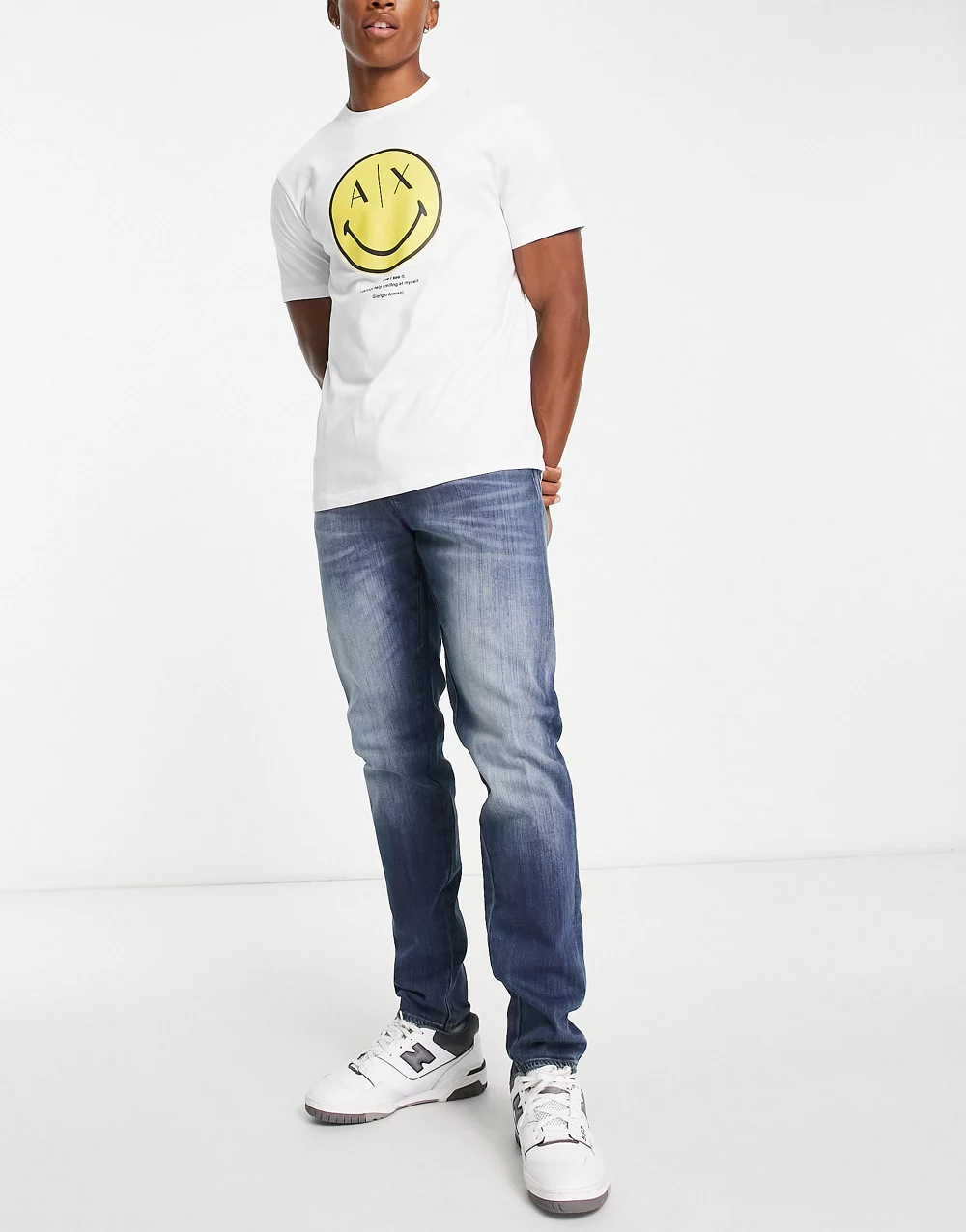 - Armani Exchange x Smiley Face skinny leg jeans in mid wash blue