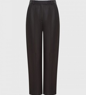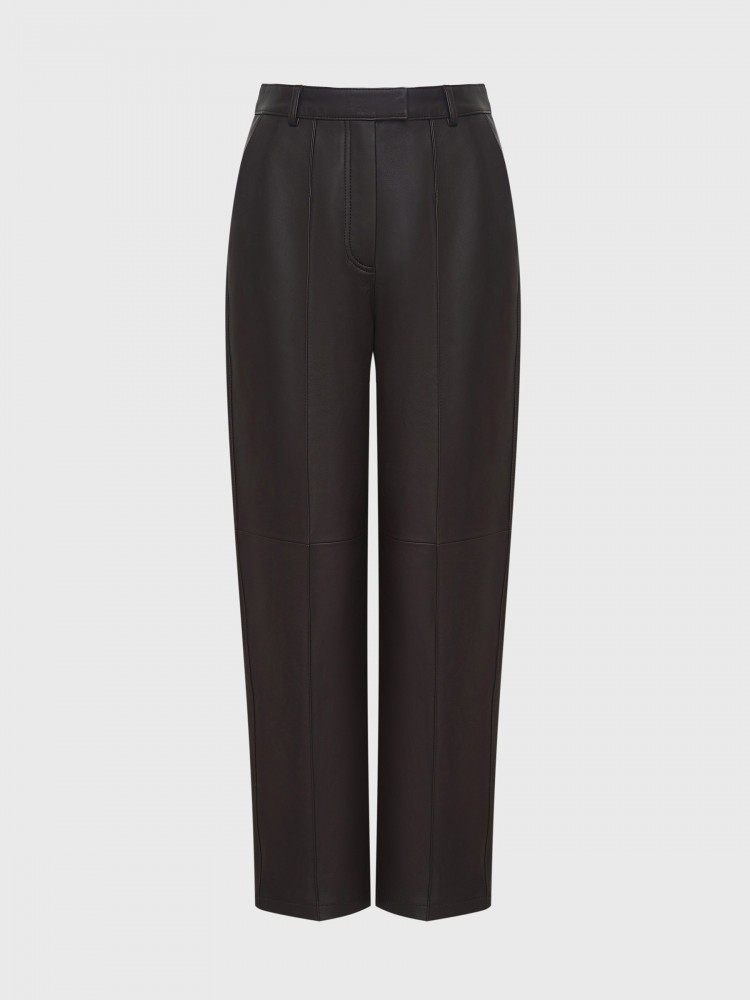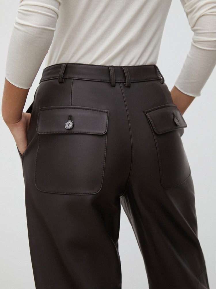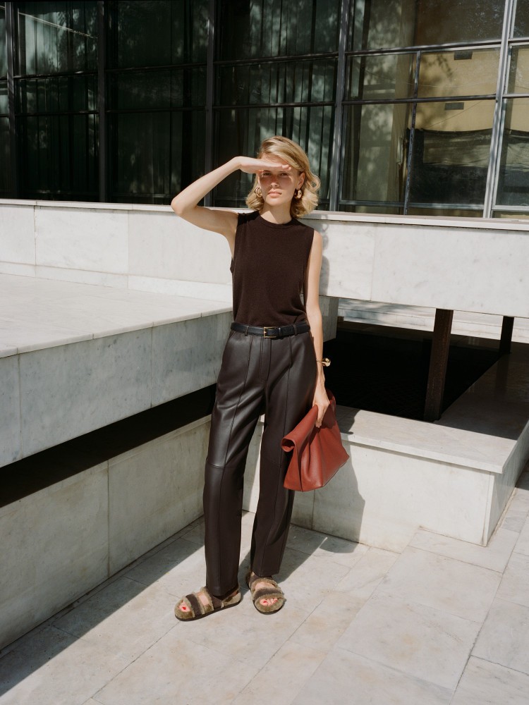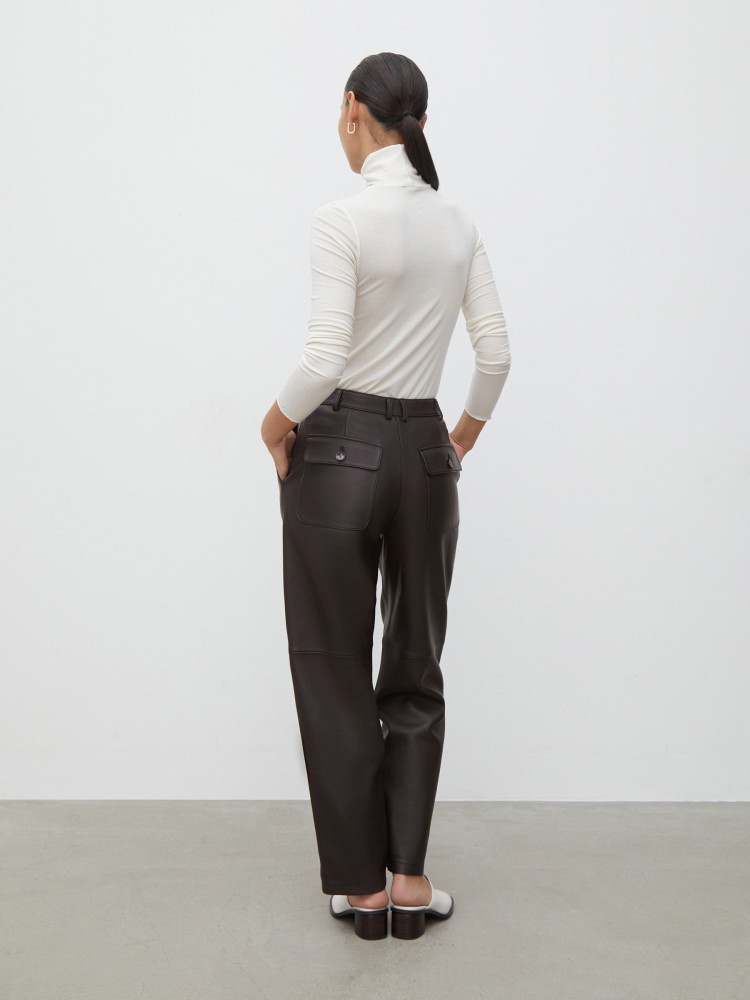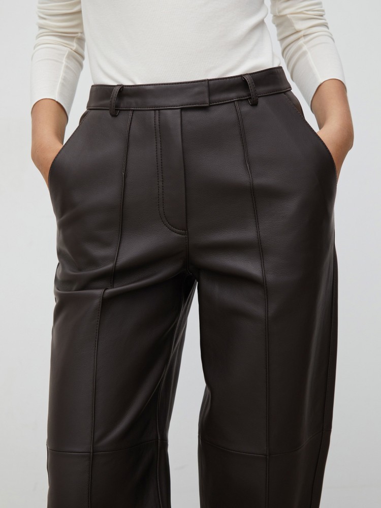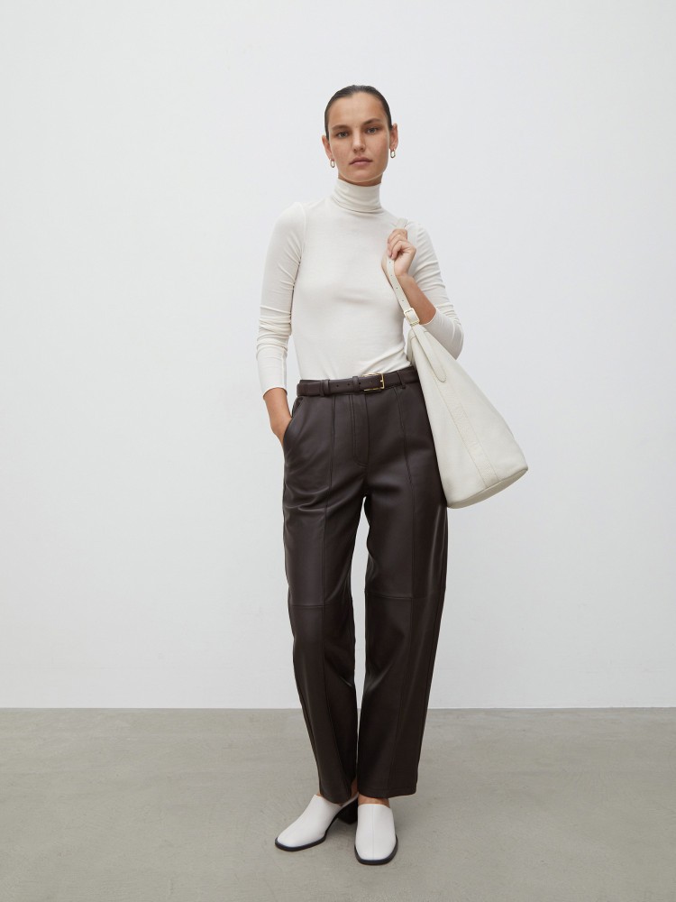 Кожаные брюки-бананы визуально вытягивают силуэт благодаря аккуратным вертикальным защипам. Для модели выбрали плотную и мягкую натуральную кожу — матовую, гладкую, устойчивую к растяжению. При выборе размера убедитесь, что брюки свободно сидят в бедрах — это необходимо, чтобы вещь служила вам как можно дольше.