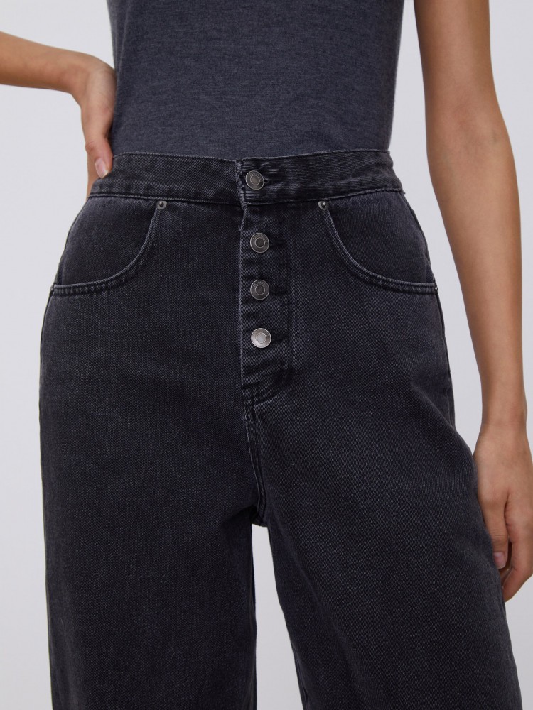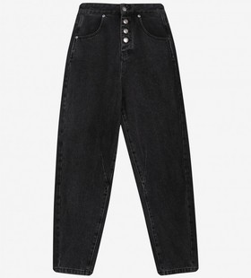 Джинсы на пуговицах. Свободные джинсы с высокой посадкой, объемные в области бедер и слегка зауженные к низу. Застежка на пуговицы, традиционные карманы сзади и два кармана спереди. Особенность джинсов — вытачки, которые придают брючинам необычную форму и делают образ более интересным. Джинсы выполнены из 100% хлопка, мягкого, плотного и долговечного.