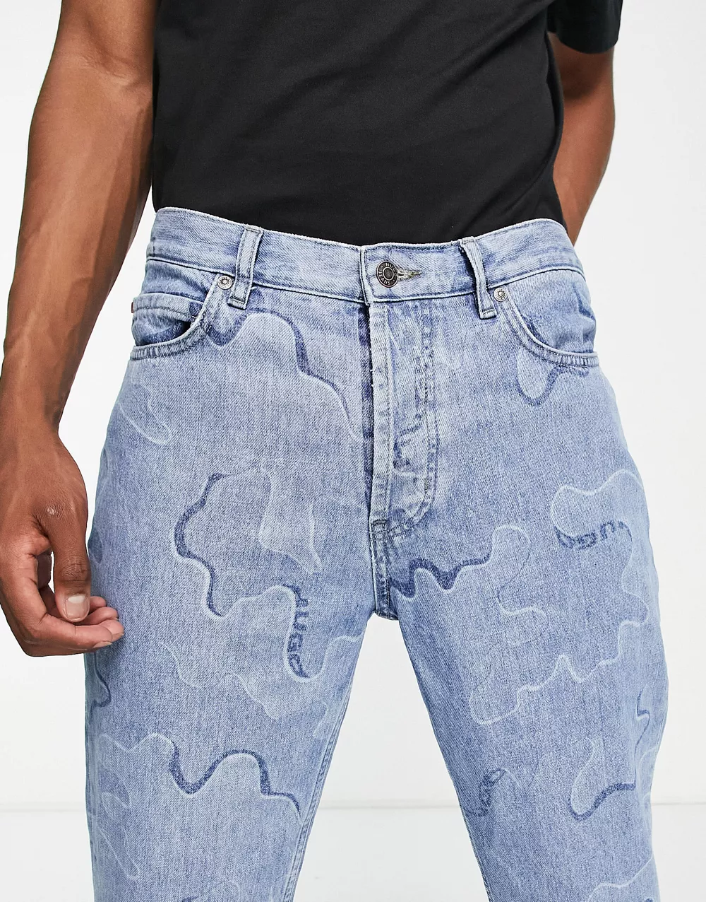 - HUGO 634 tapered fit jeans in bright blue with all over print