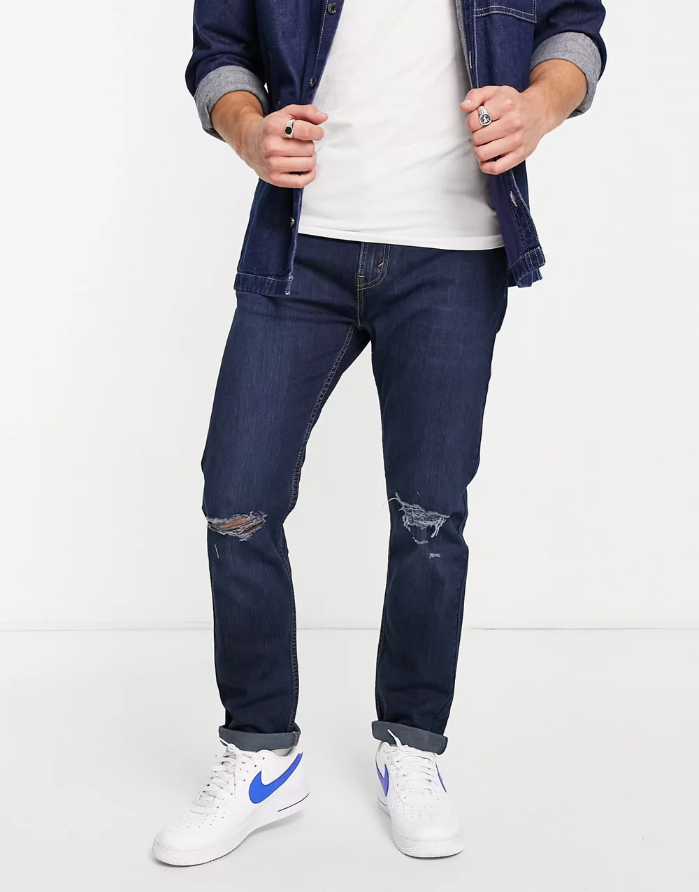 - Levi's 502 tapered fit jeans in dark navy with distressing