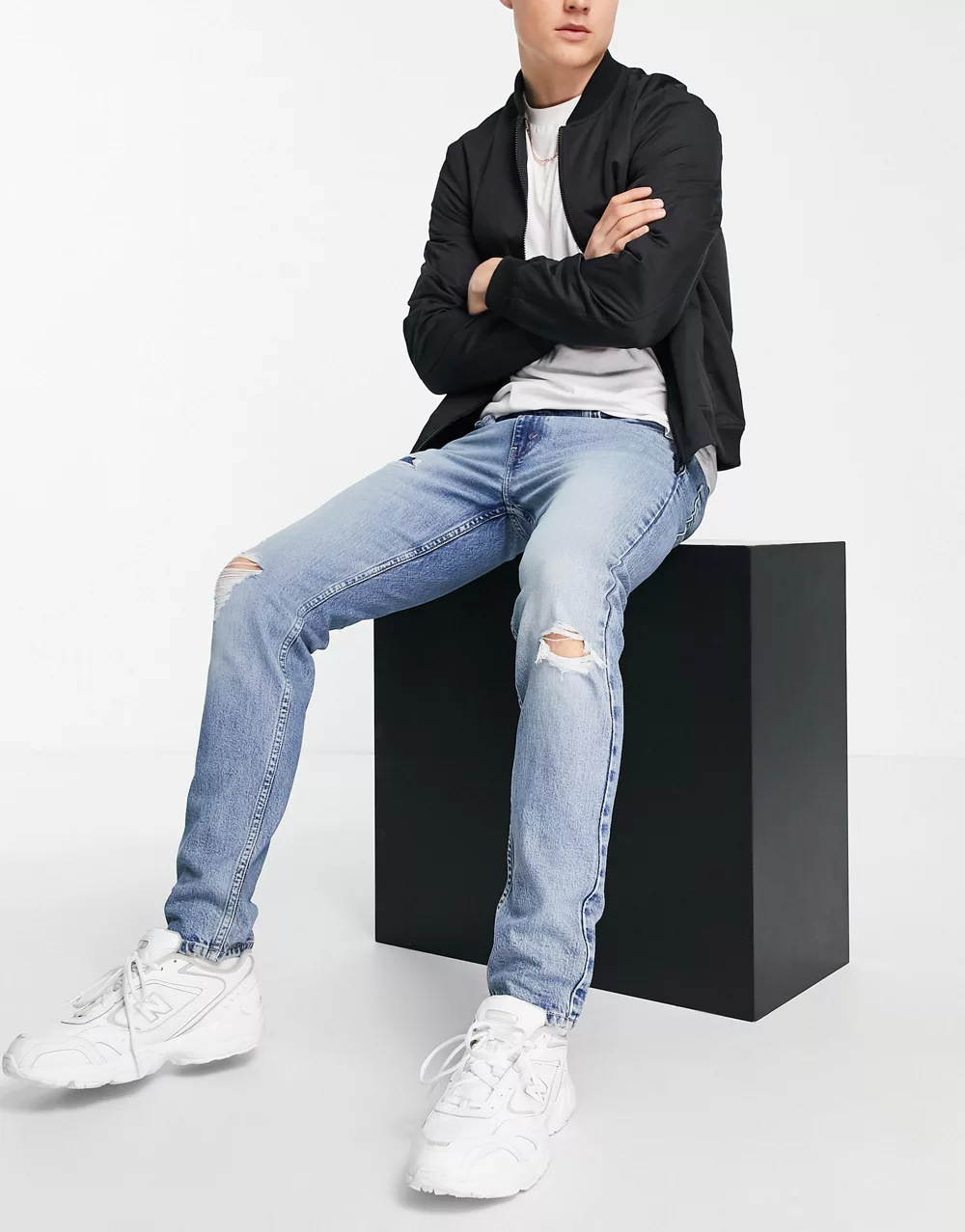 - Levi's 512 slim taper jeans with distressing in light blue wash