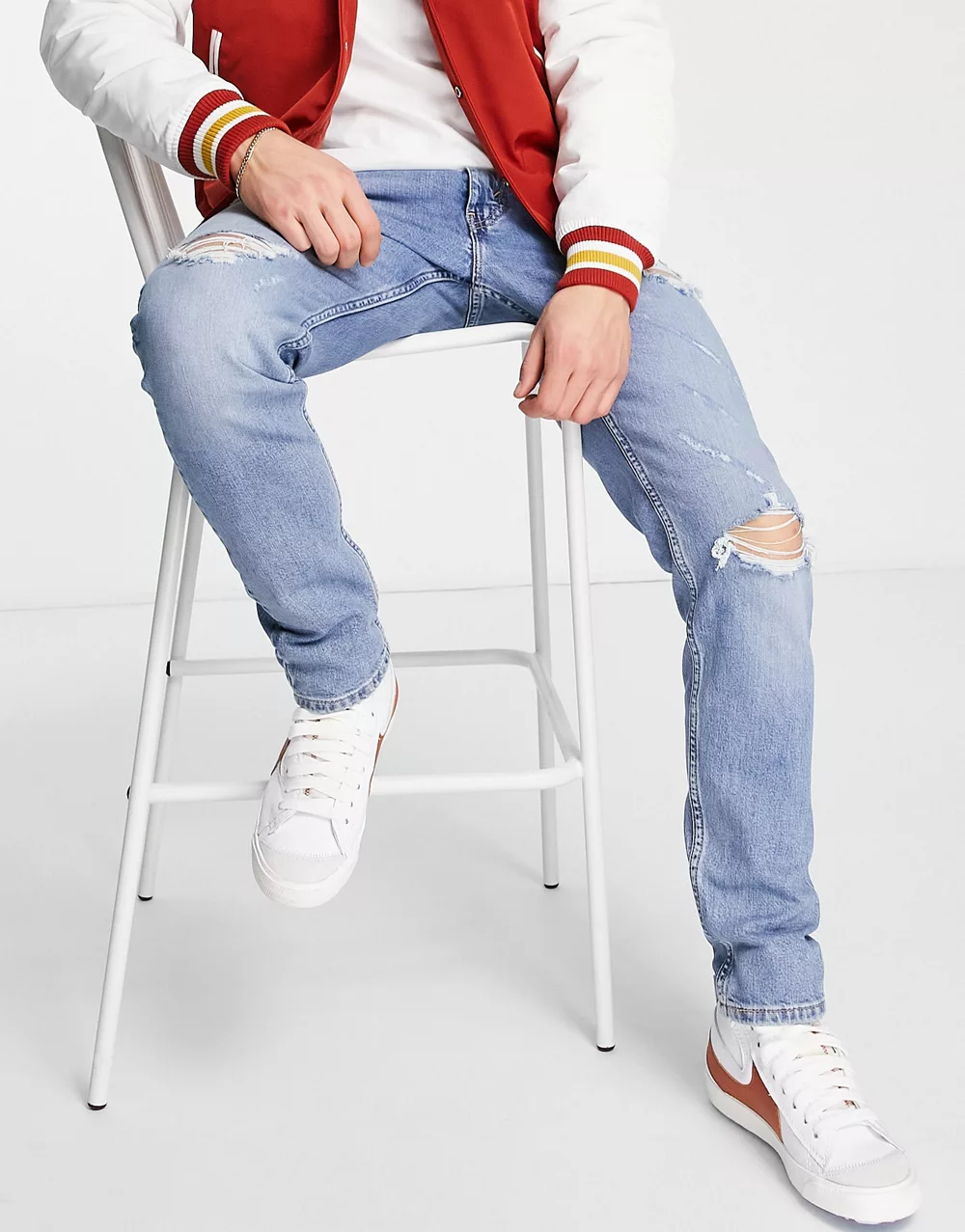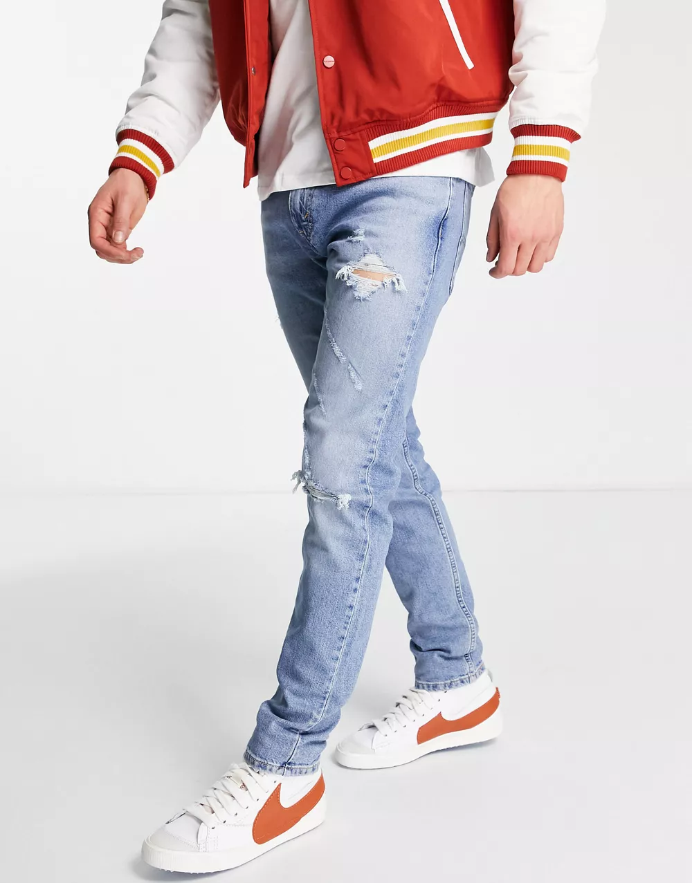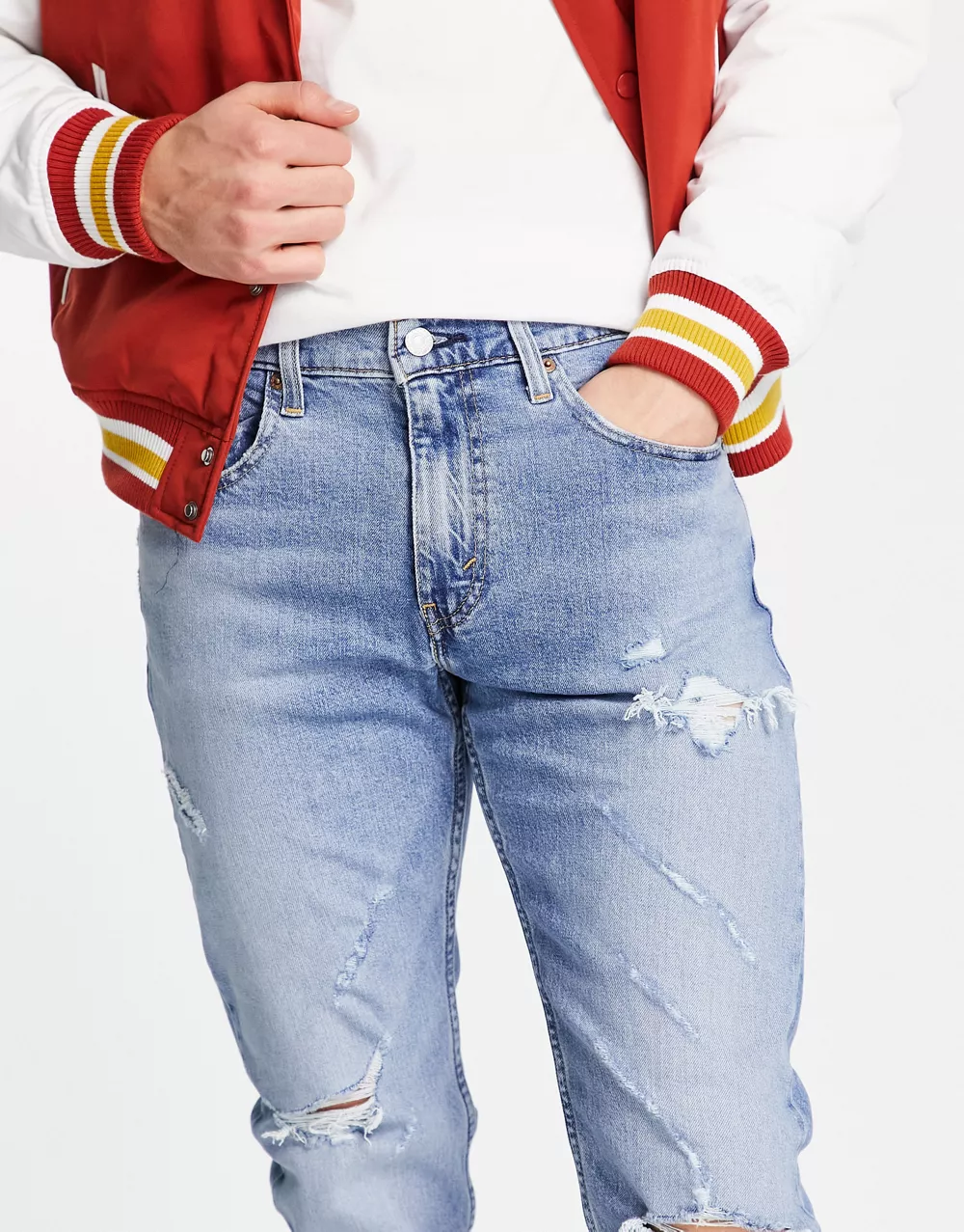 - Levi's 512 slim taper lo ball jeans in light blue wash with rips