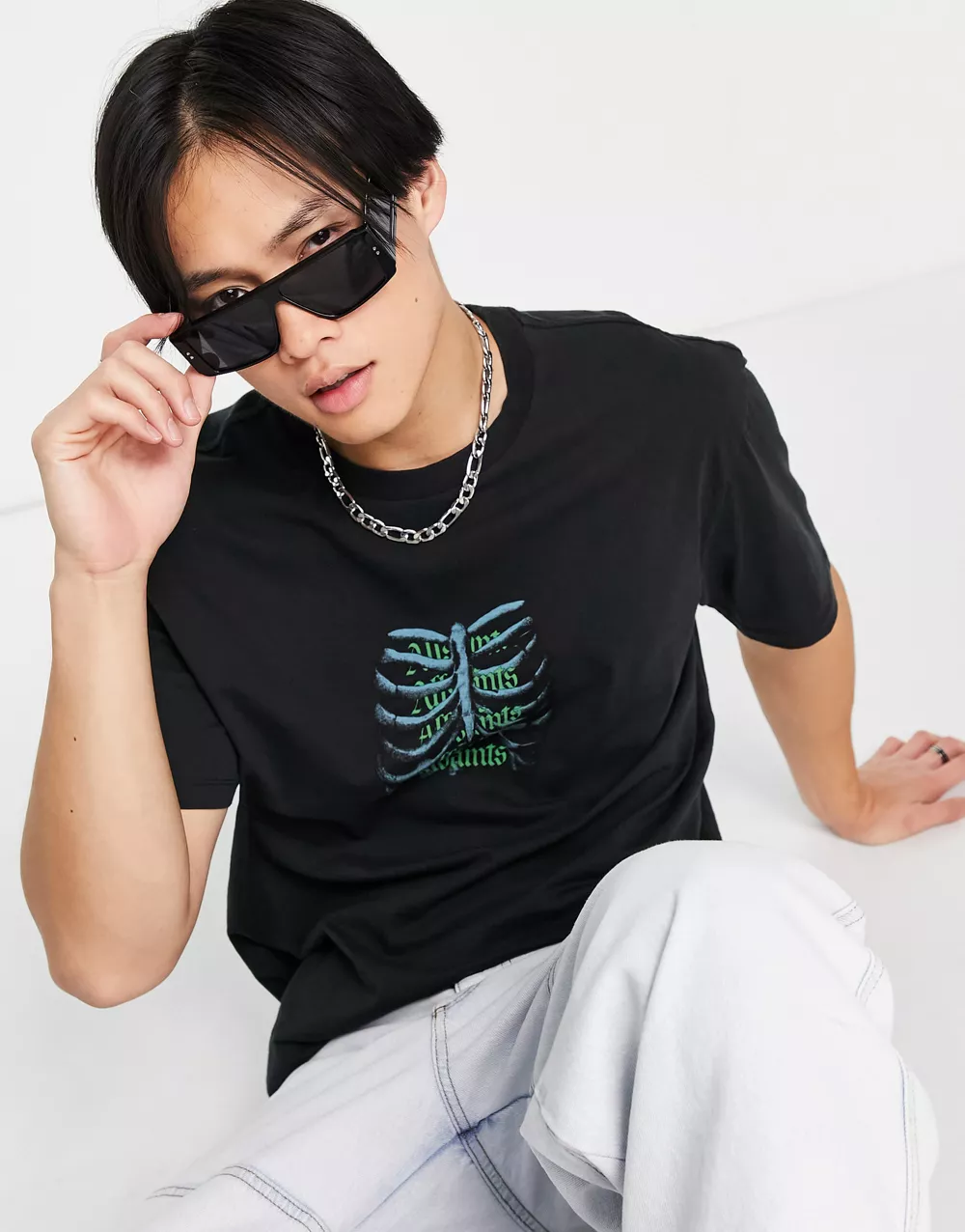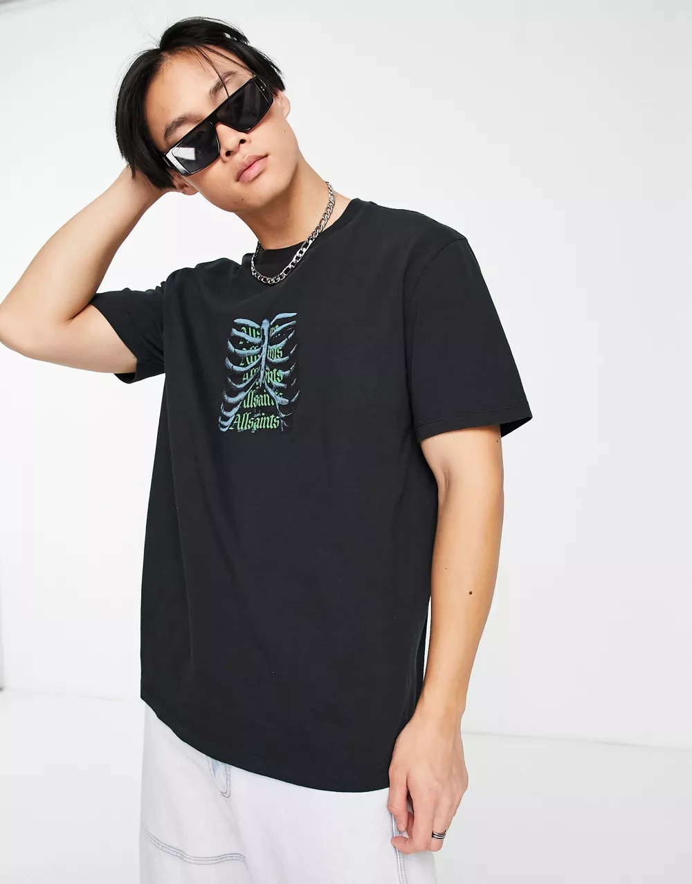 - AllSaints Caged t-shirt in washed black with back print Exclusive to ASOS