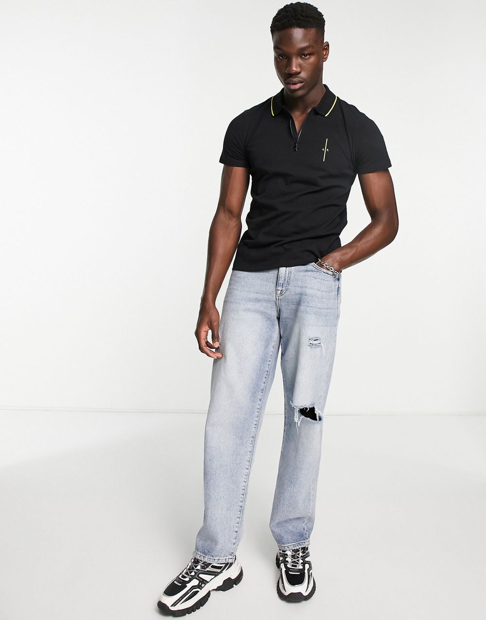 - Armani Exchange zip neck polo with debossed back branding in black