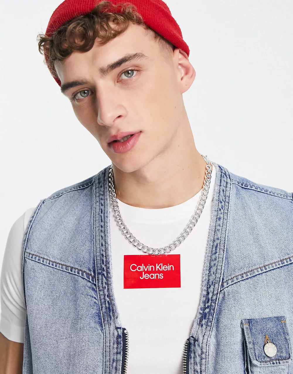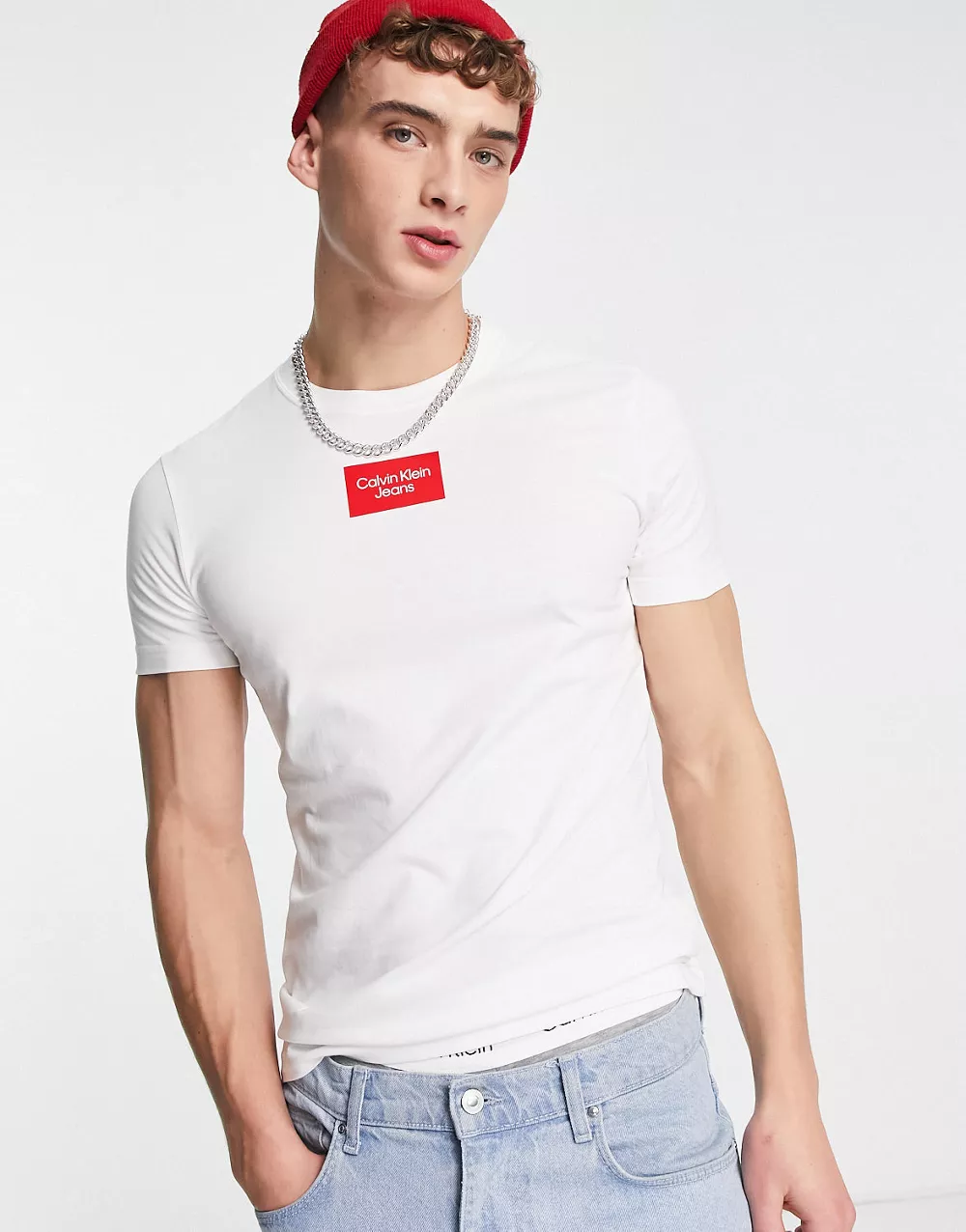 - Calvin Klein Jeans small center box logo slim fit t-shirt in white