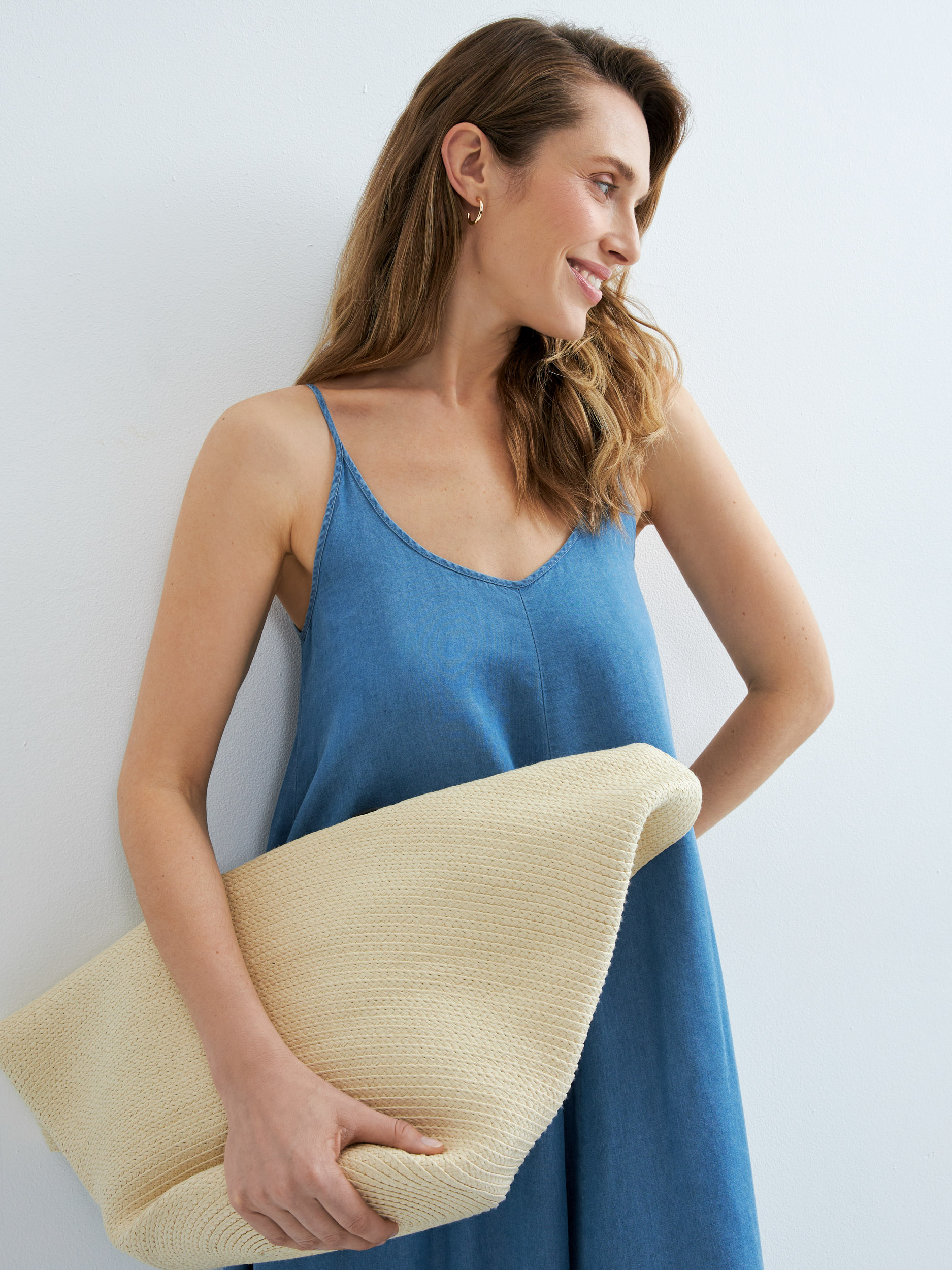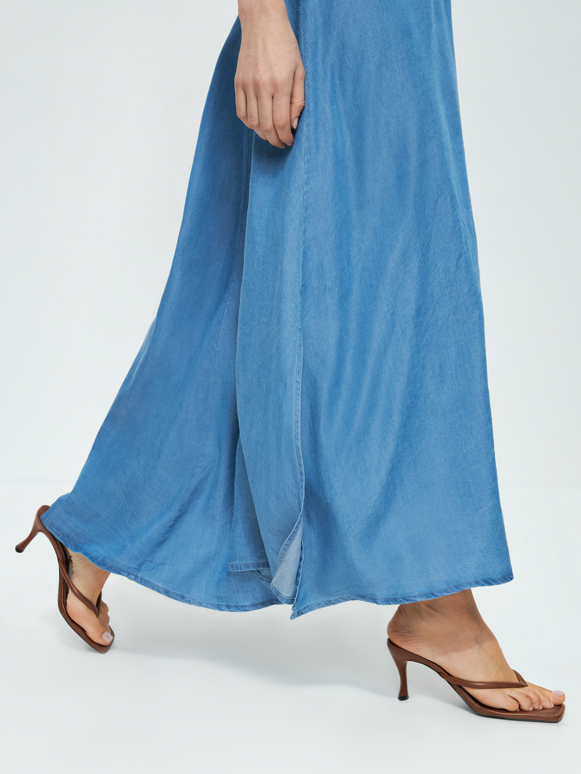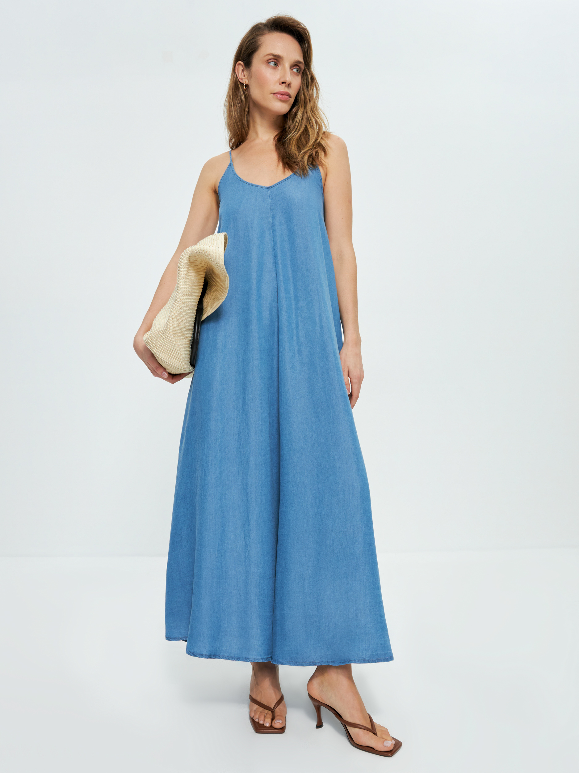 Параметры: Вырез горловины: округлый; открытая спина; Декор: завязки; Застежка: завязки; Силуэт: свободный; Тип рукава: на бретелях; Длина платья/юбки: миди