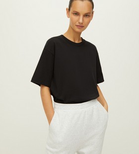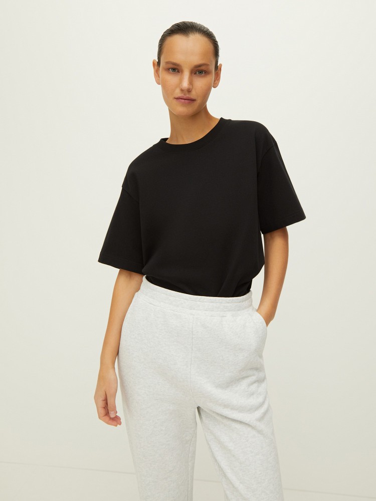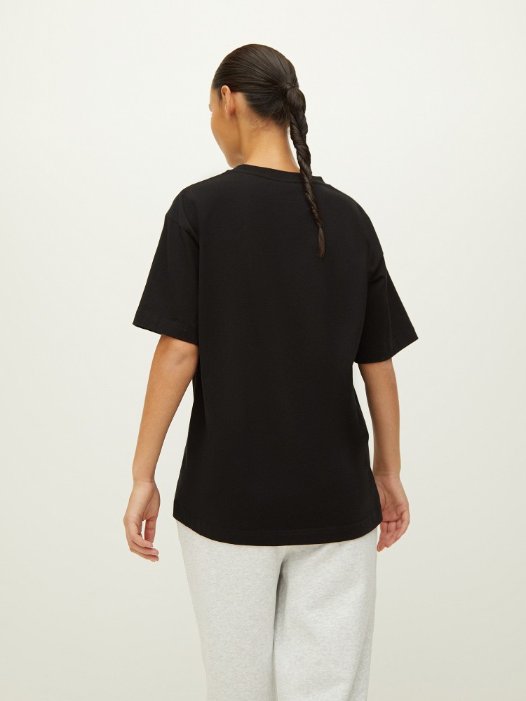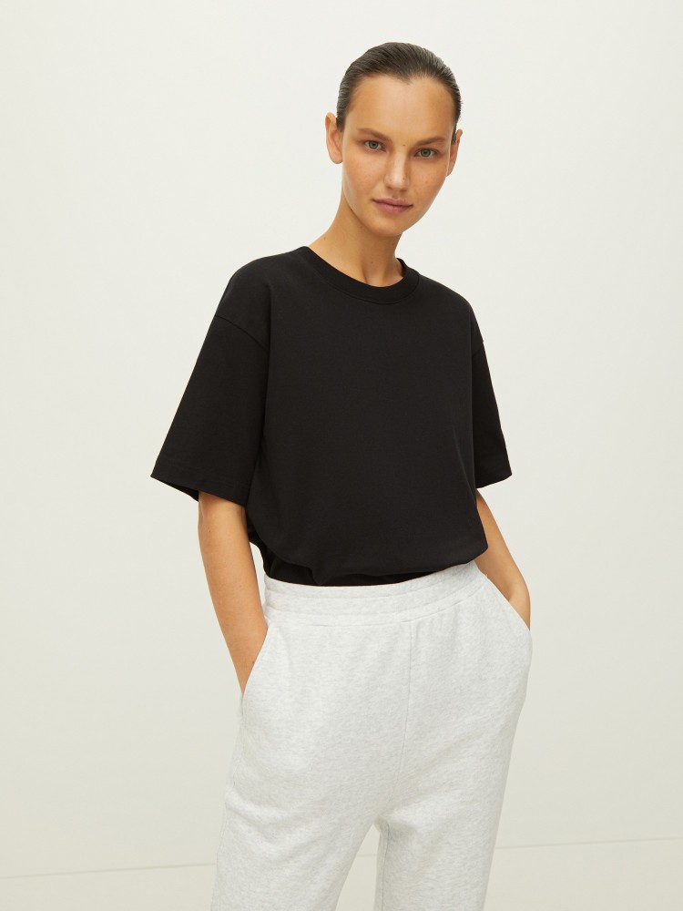 Футболка из плотного хлопка. Актуальный силуэт оверсайз для образов с широкими джинсами и шортами. Матовый гладкий трикотаж отлично держит форму и поддерживает температуру тела.Сделано в Китае.