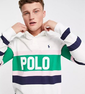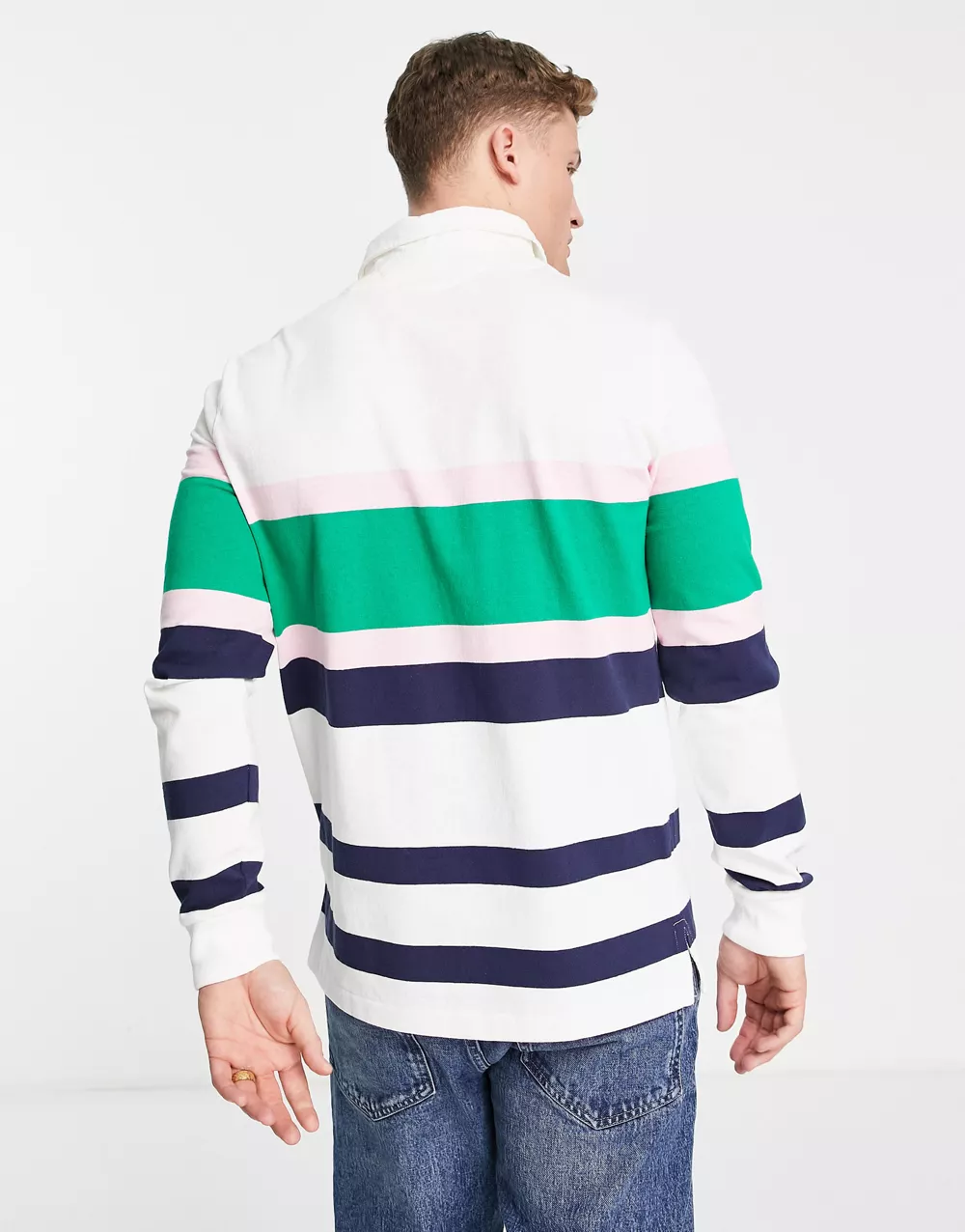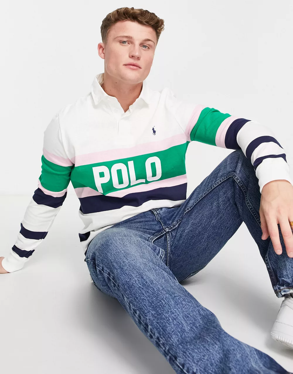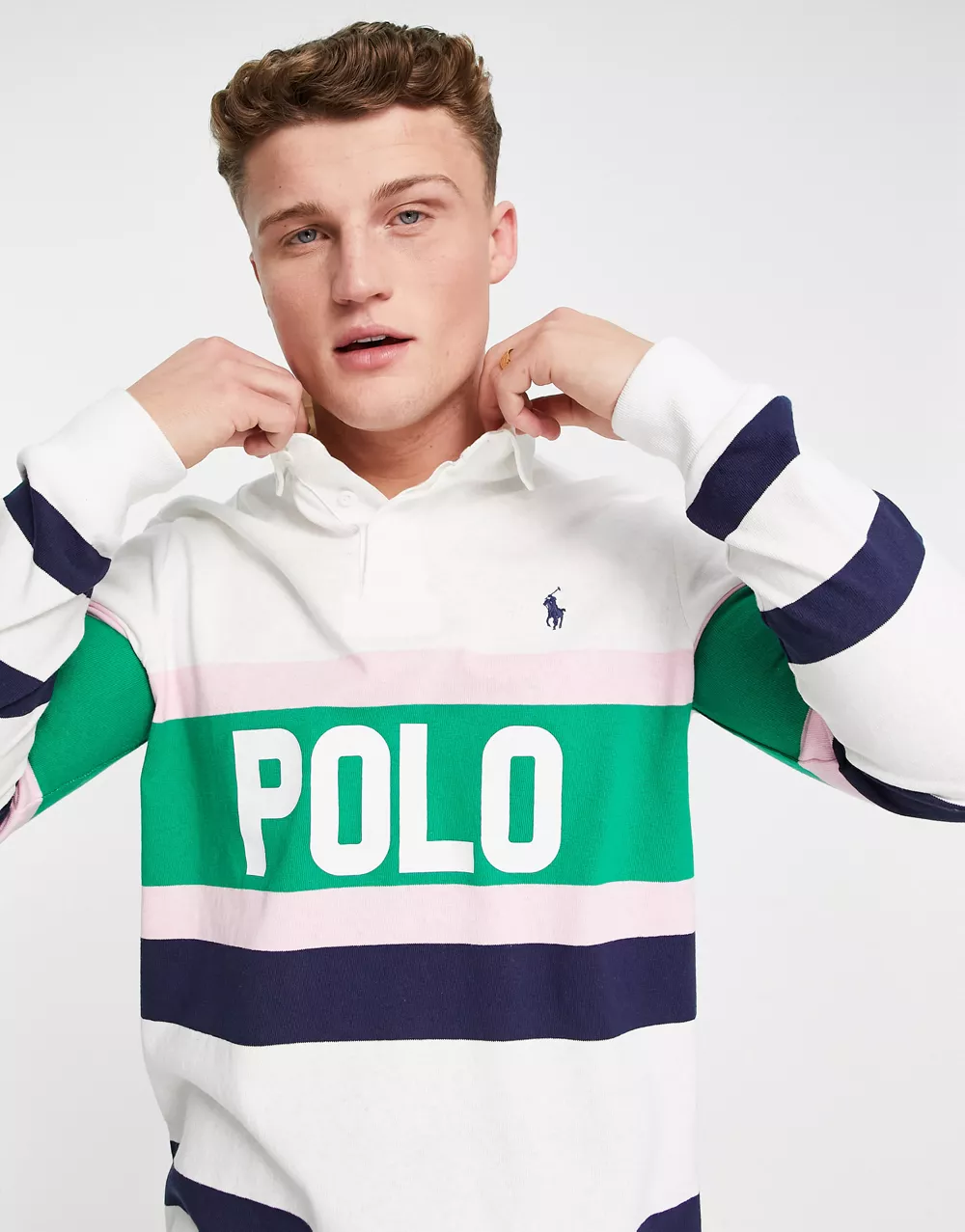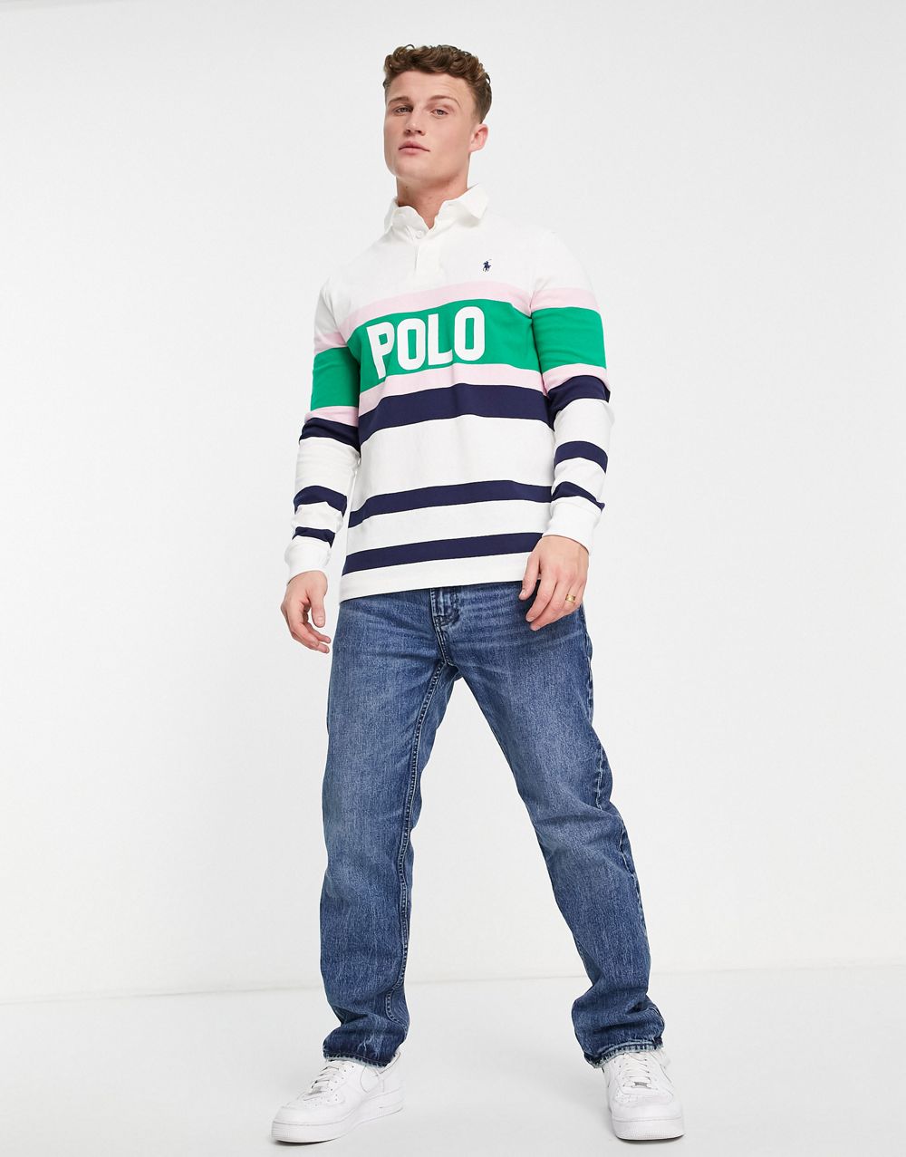 - Polo Ralph Lauren icon and chest logo multi stripe rugby polo in white