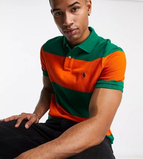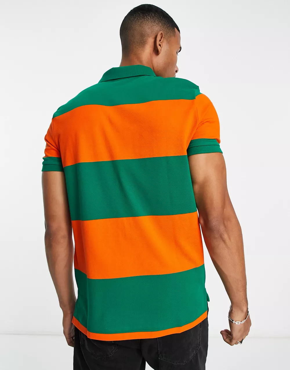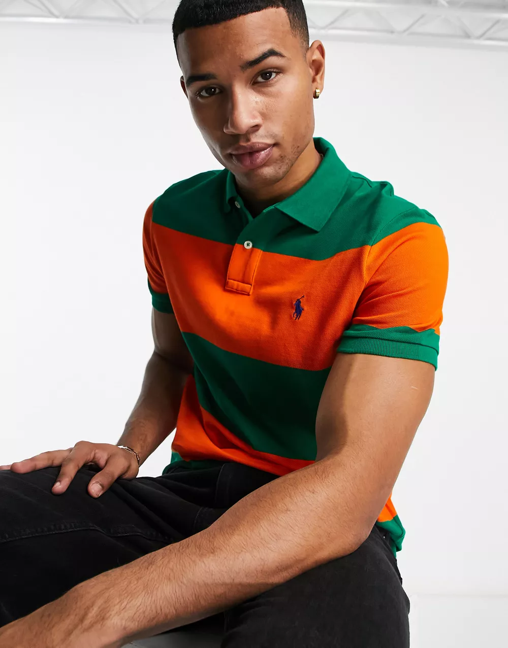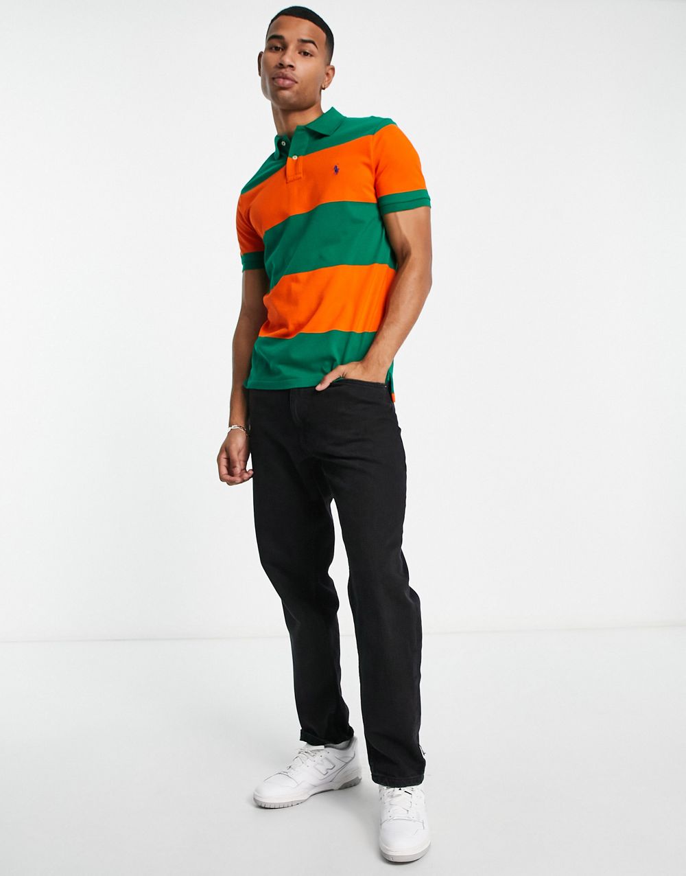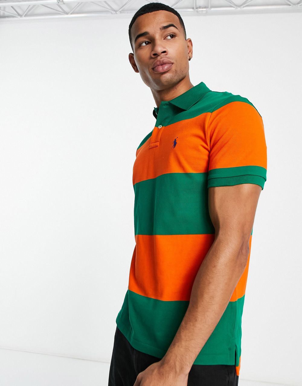 - Polo Ralph Lauren icon logo block stripe pique polo in bright green and orange