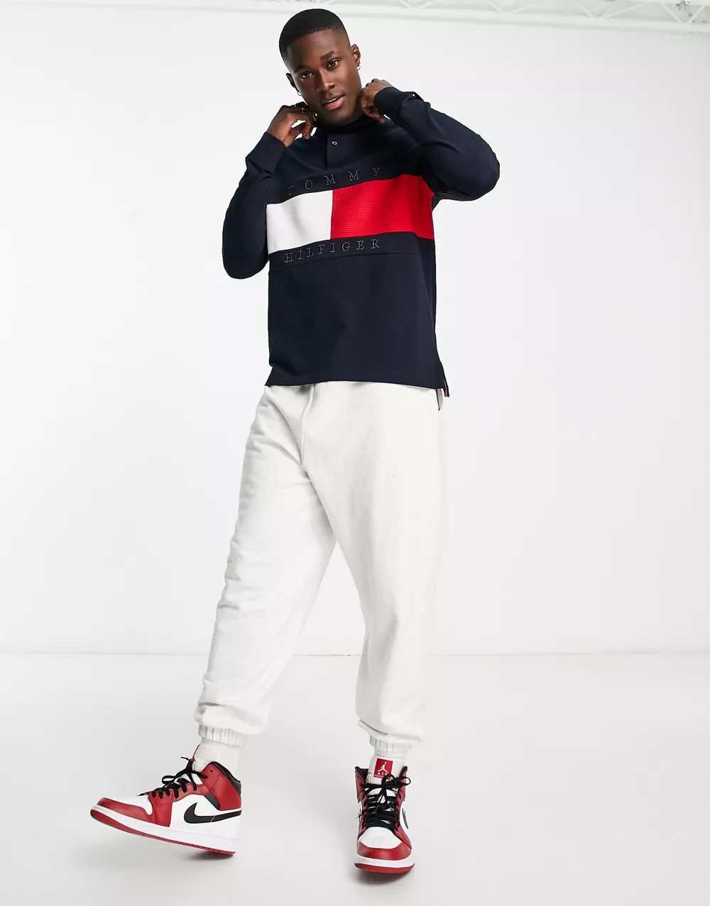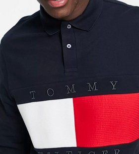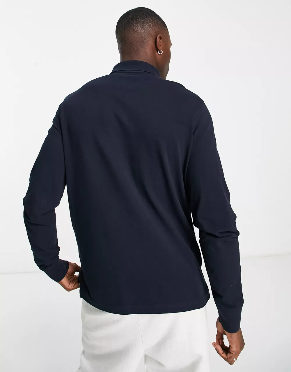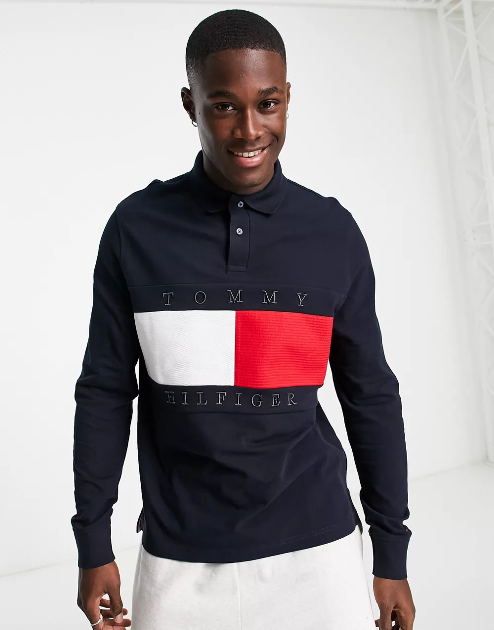 - Tommy Hilfiger large flag structure long sleeve cotton pique polo in navy