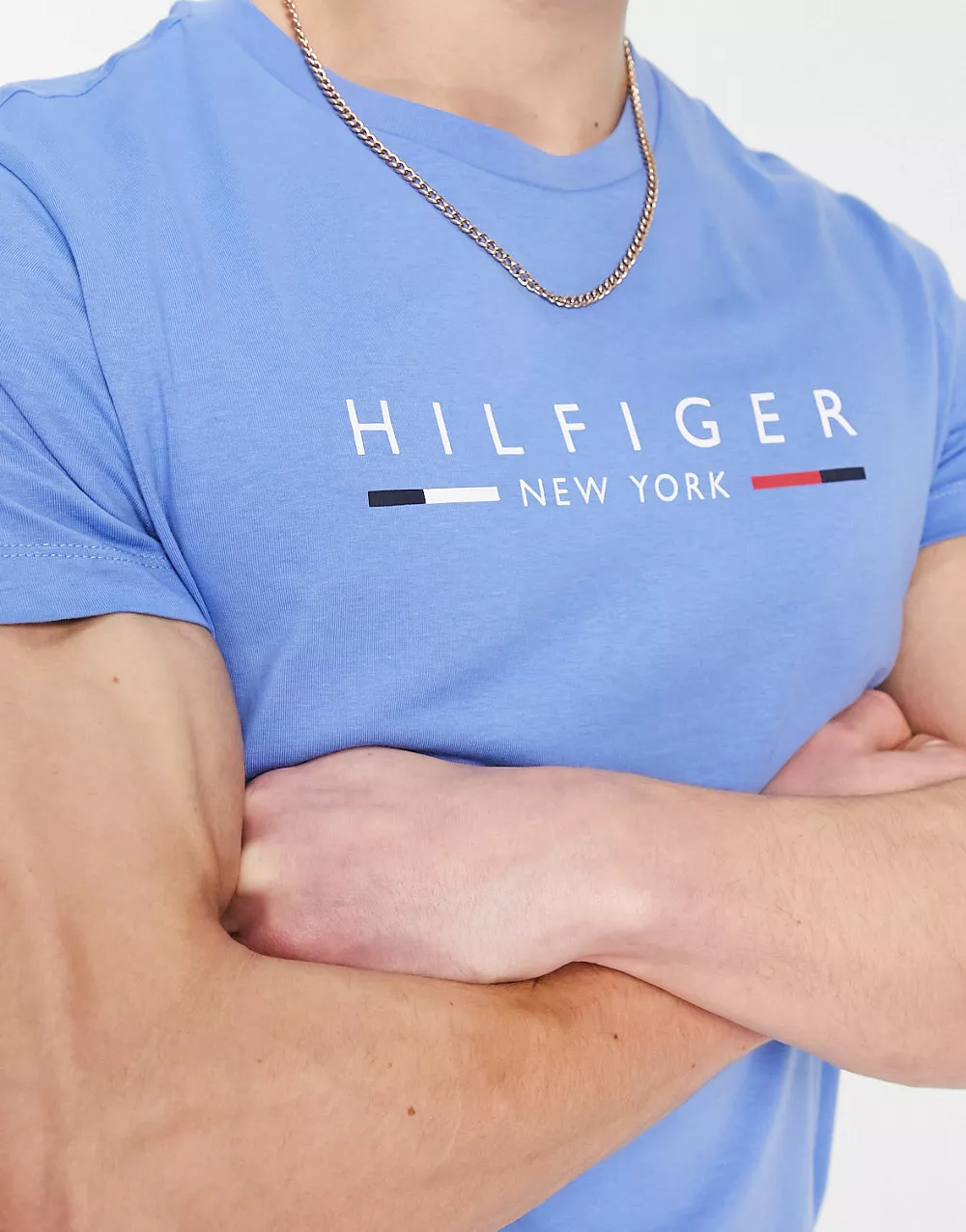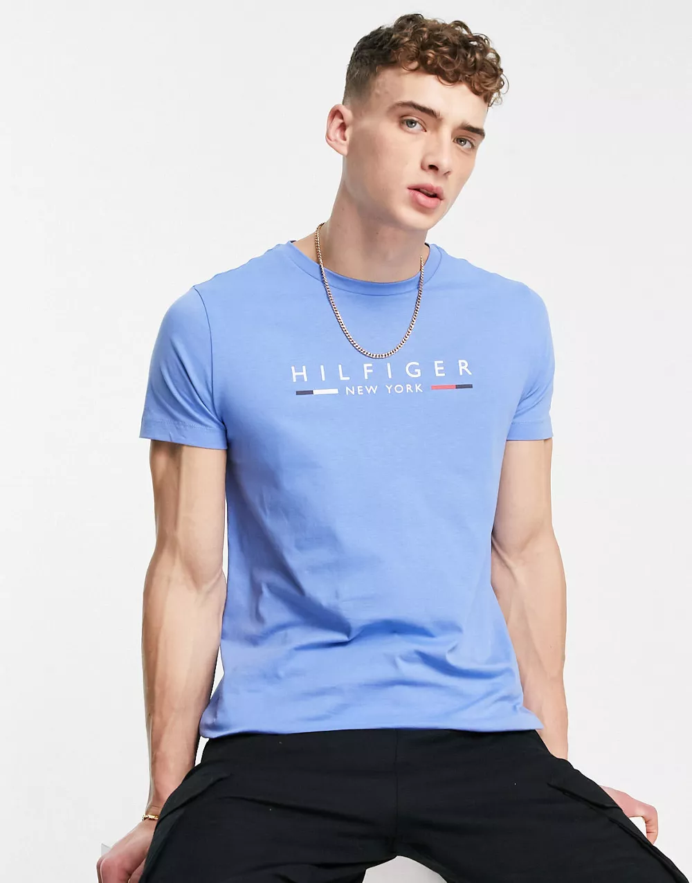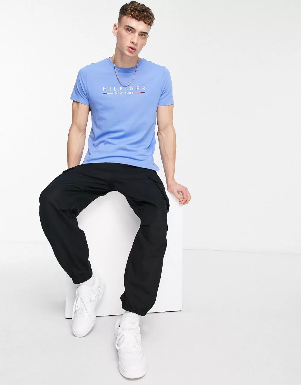 Tommy Jeans central flag vertical stripe skater fit t-shirt in bright blue