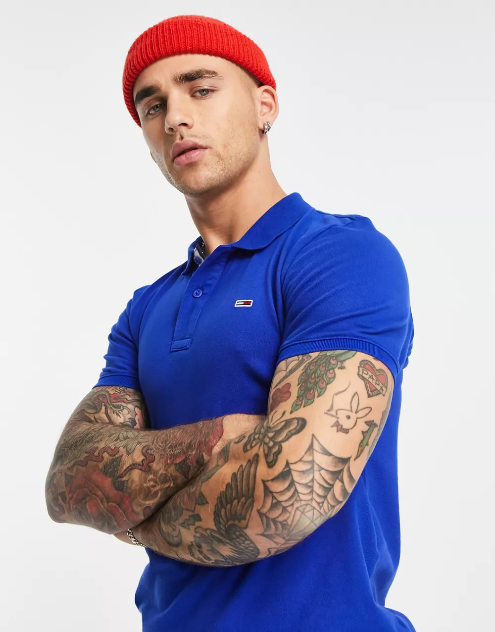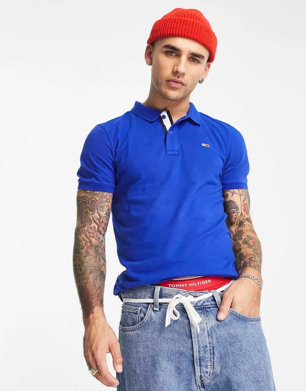 - Tommy Jeans cotton flag logo stretch polo shirt in blue