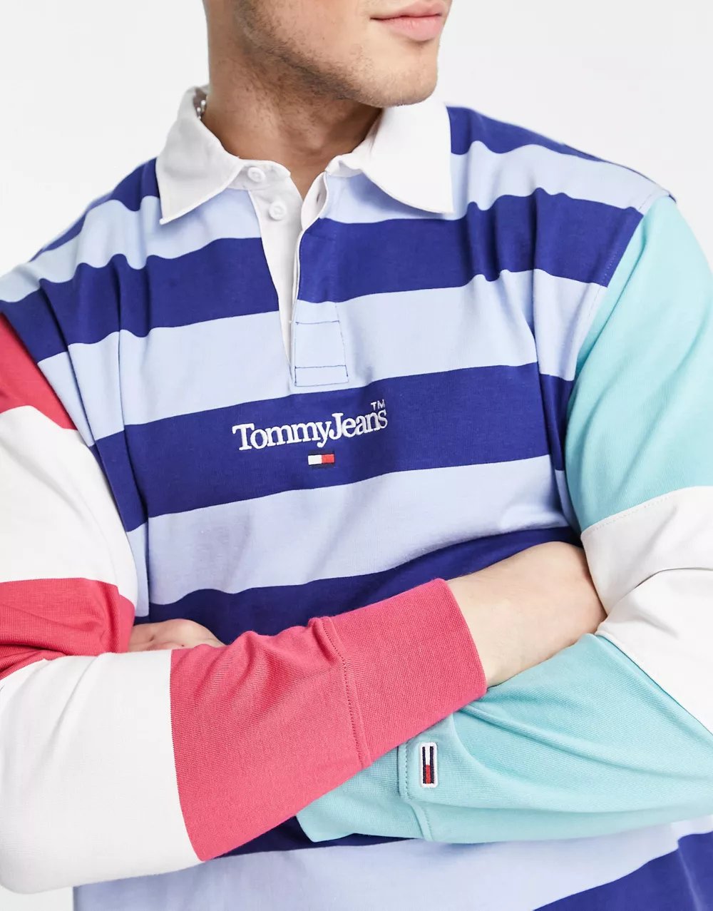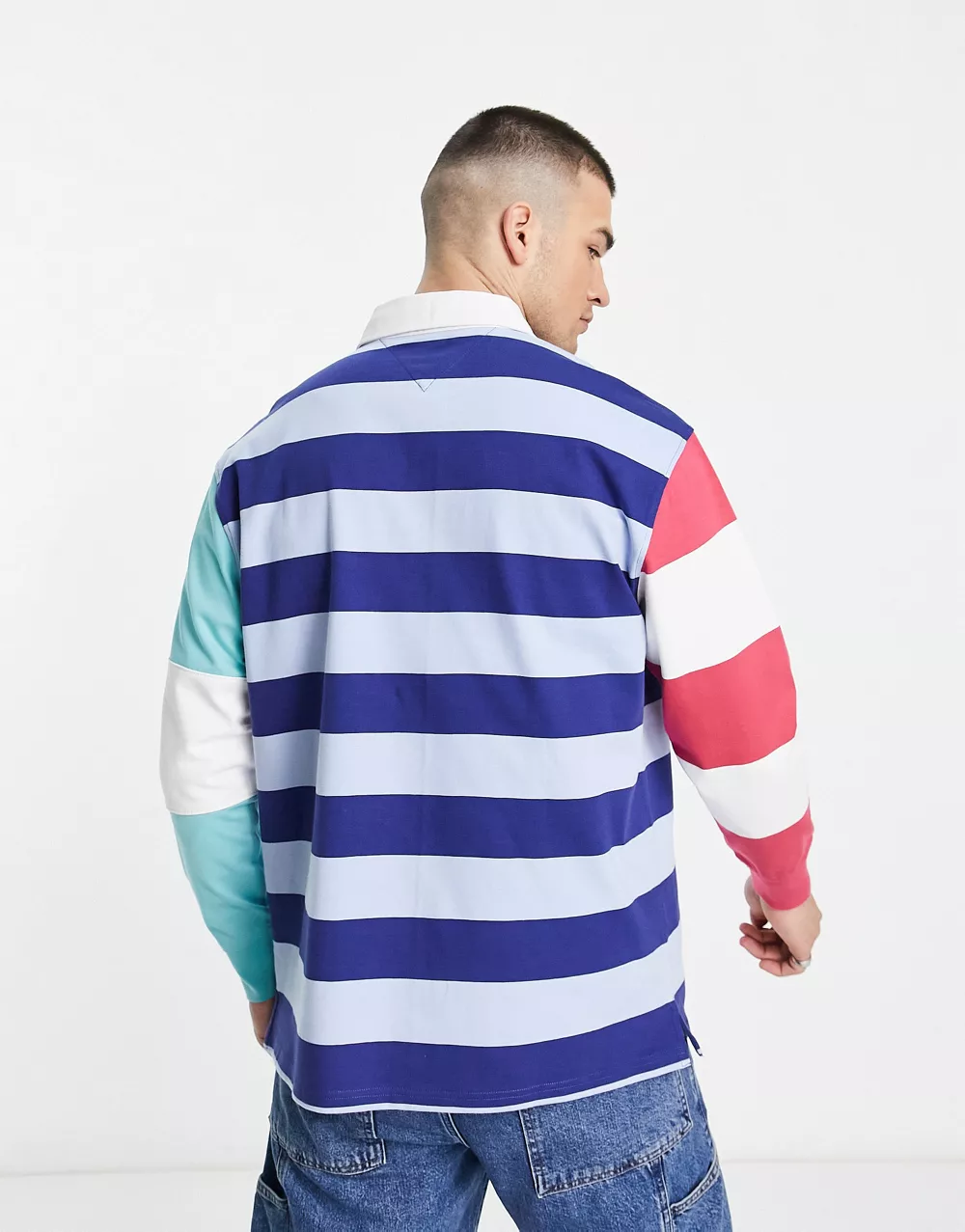 - Tommy Jeans novel stripe colourblock skater fit rugby polo in blue