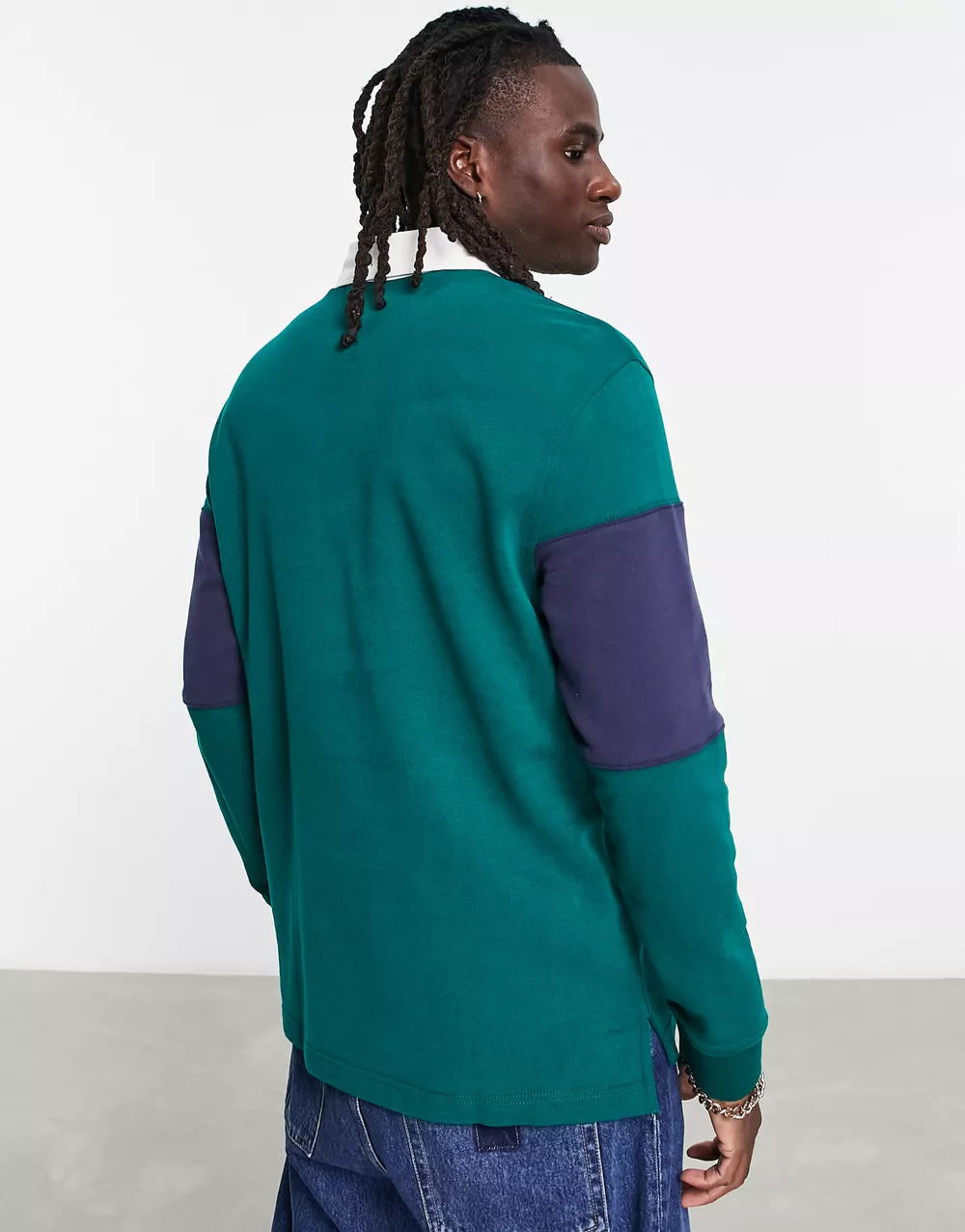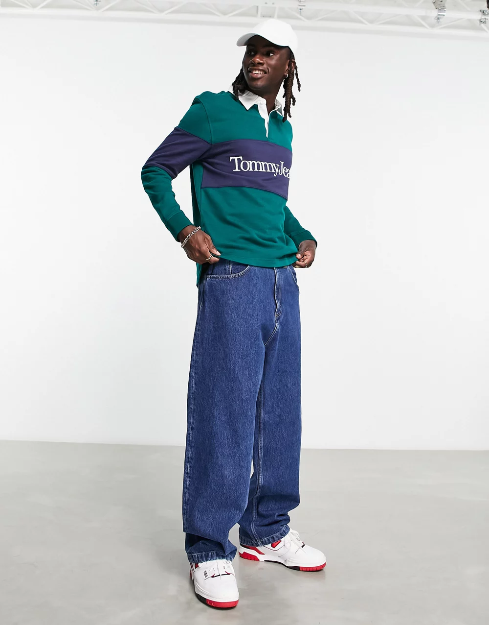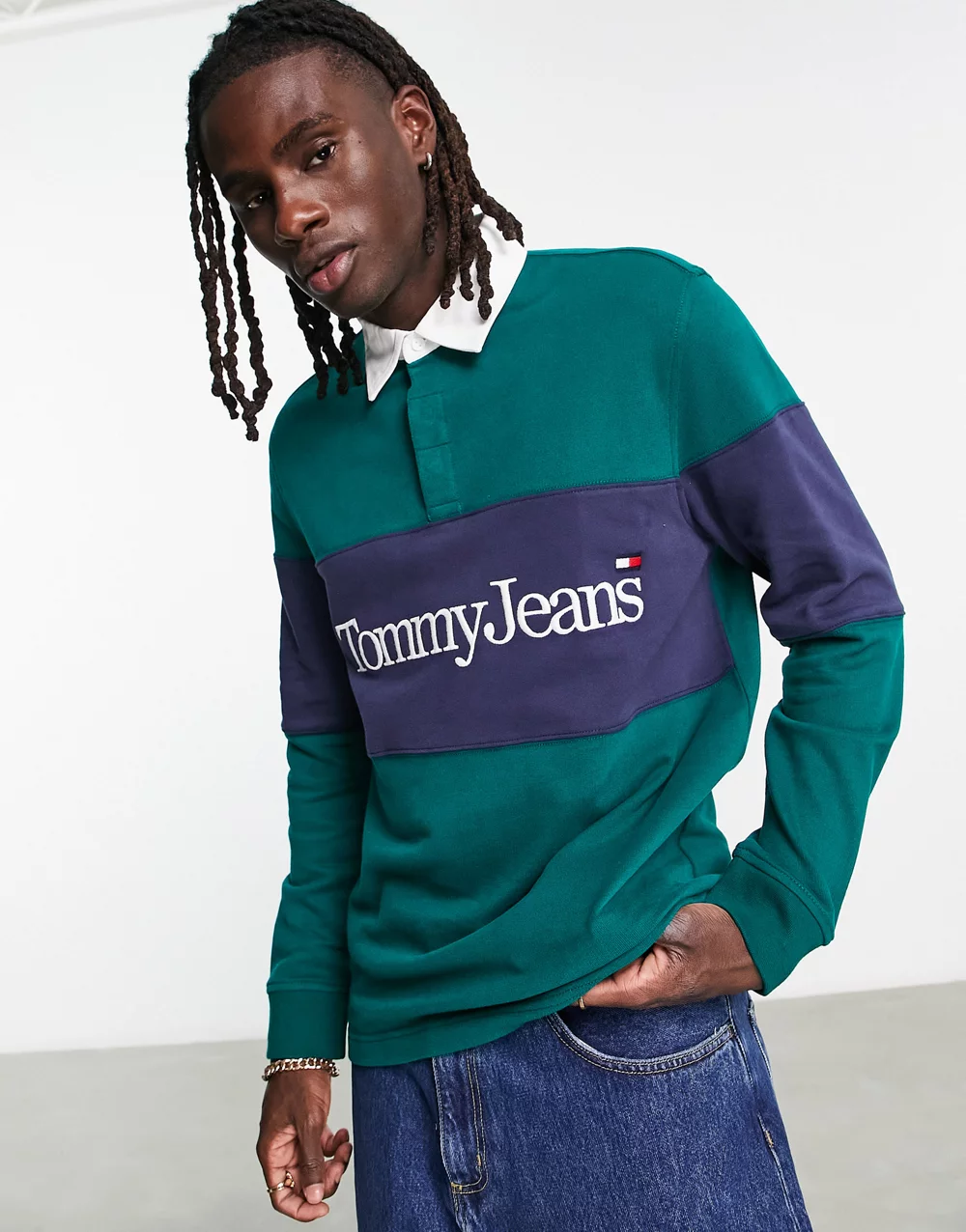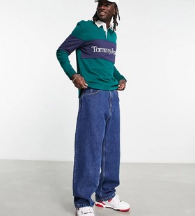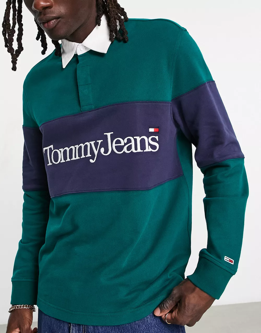 - Tommy Jeans relaxed fit serif linear colourblock rugby polo in dark green