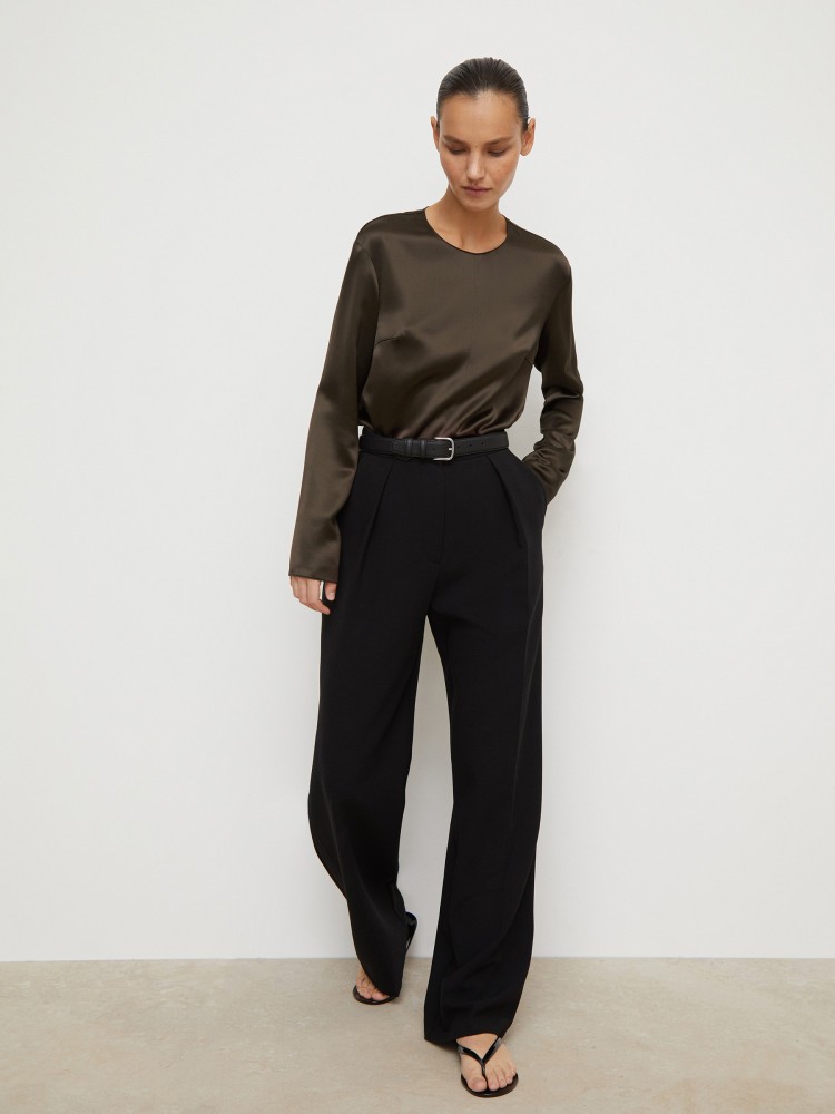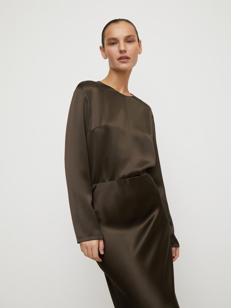 Свободная блуза с мягкой линией плеча выглядит лаконично и просто, но совсем не буднично. Для модели выбрали плотный и пластичный искусственный шелк с креповой текстурой — он переливается на свету и сочетается с любыми фактурными материалами, от кожи до денима. Застежка на потайную молнию на спине. Без подкладки.Сделано в России.