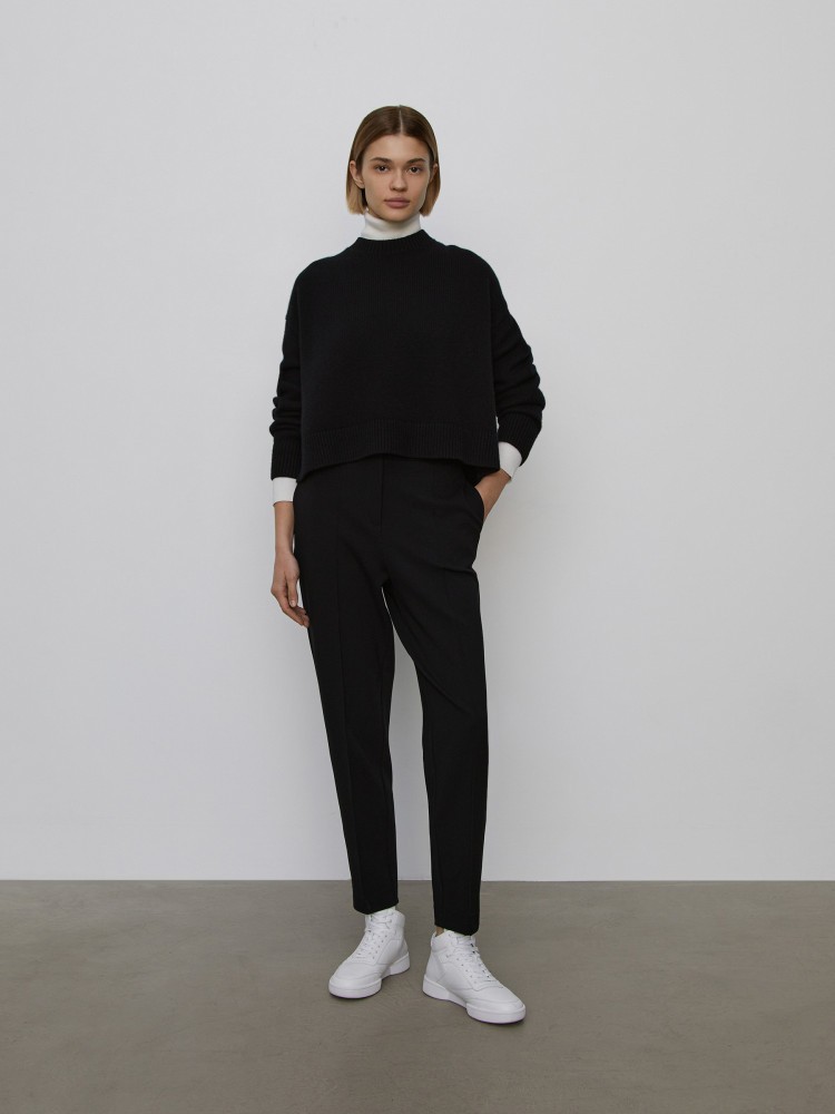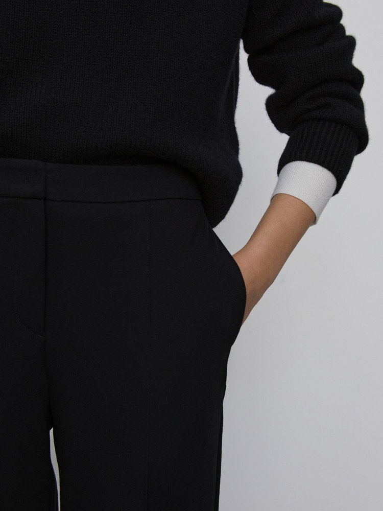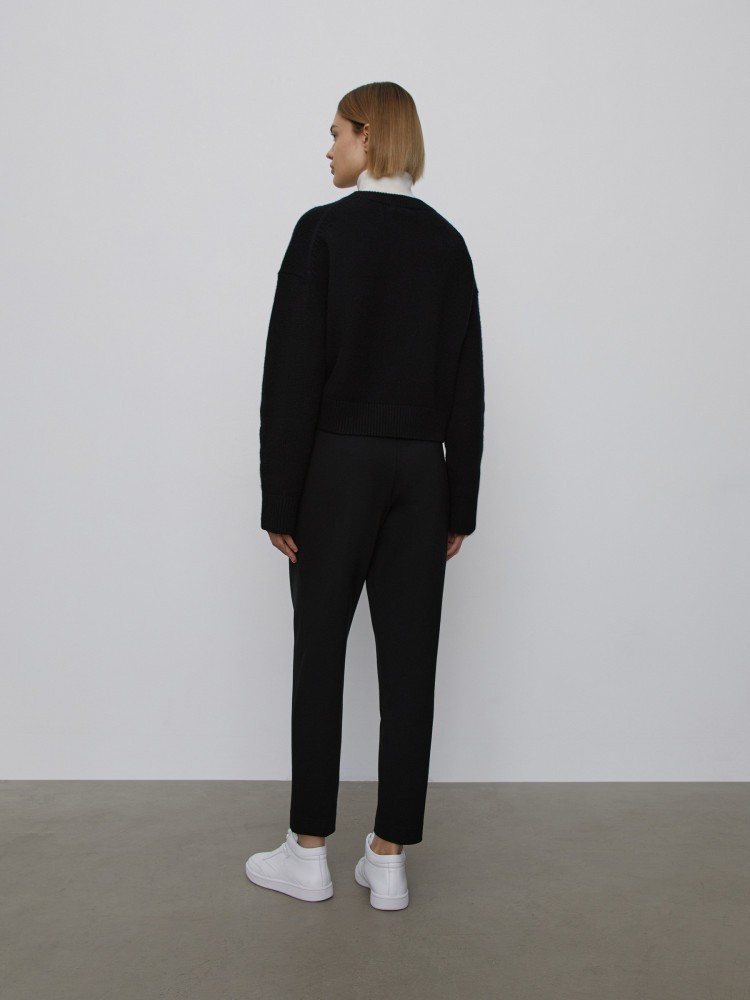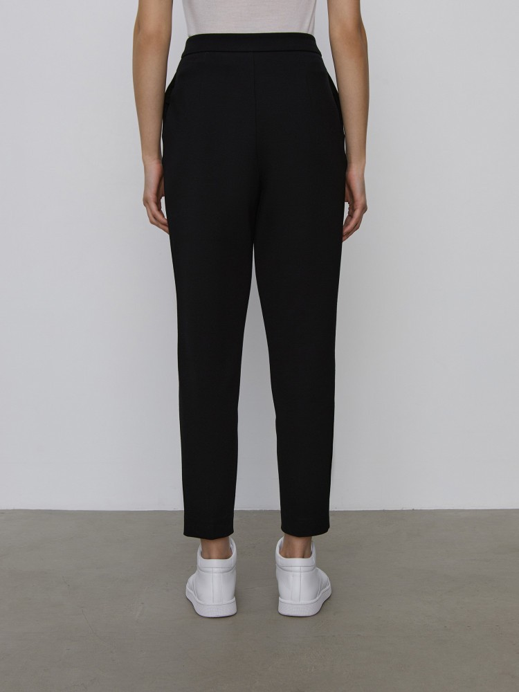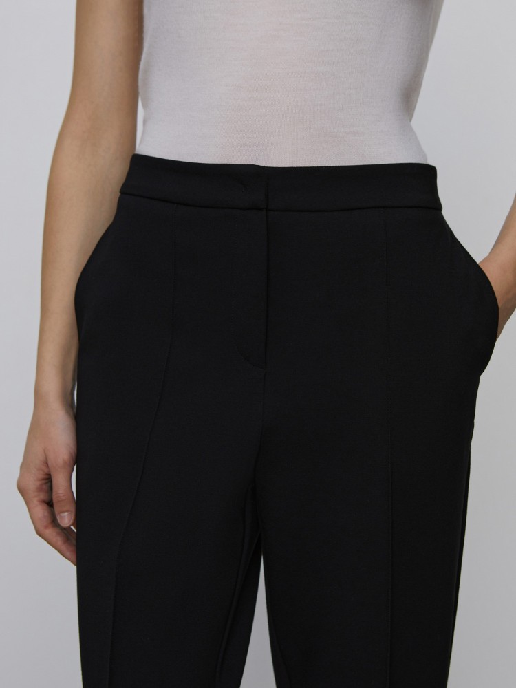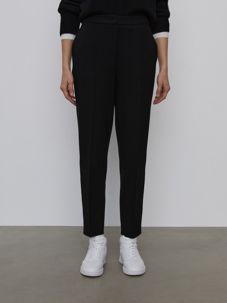 Прямые брюки с аккуратными стрелками, которые визуально корректируют силуэт. Эластичный плотный трикотаж не собирается в складки и не вытягивается на уровне колен. Застежка на молнию и крючок.Сделано в России.