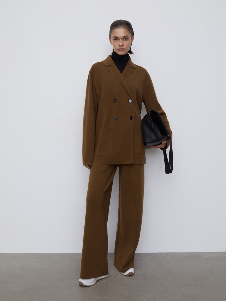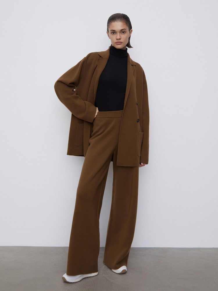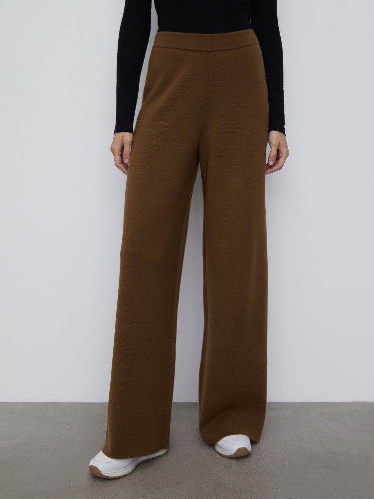 Широкие вязаные брюки сделали максимально лаконичными — без карманов и гульфика, с эластичным поясом. За практичность и комфорт отвечает плотный, похожий на текстиль, трикотаж из хлопка и шерсти мериноса. Благодаря специальной обработке шерстяной нити придали гладкость и прочность, поэтому брюки не скатываются и сохраняют форму.Сделано в Китае.