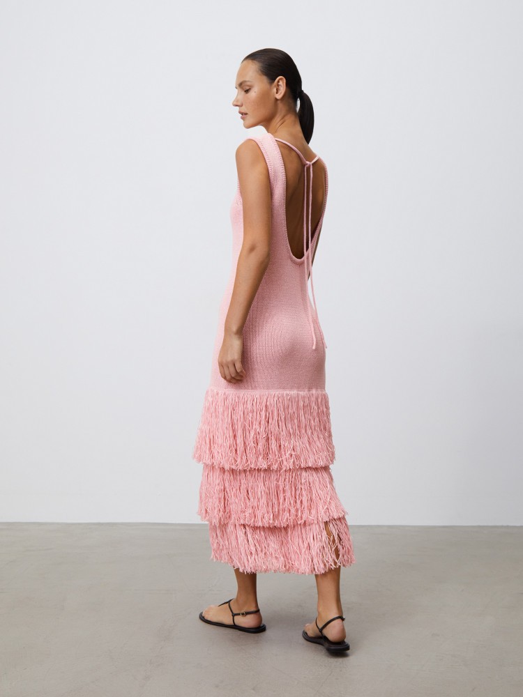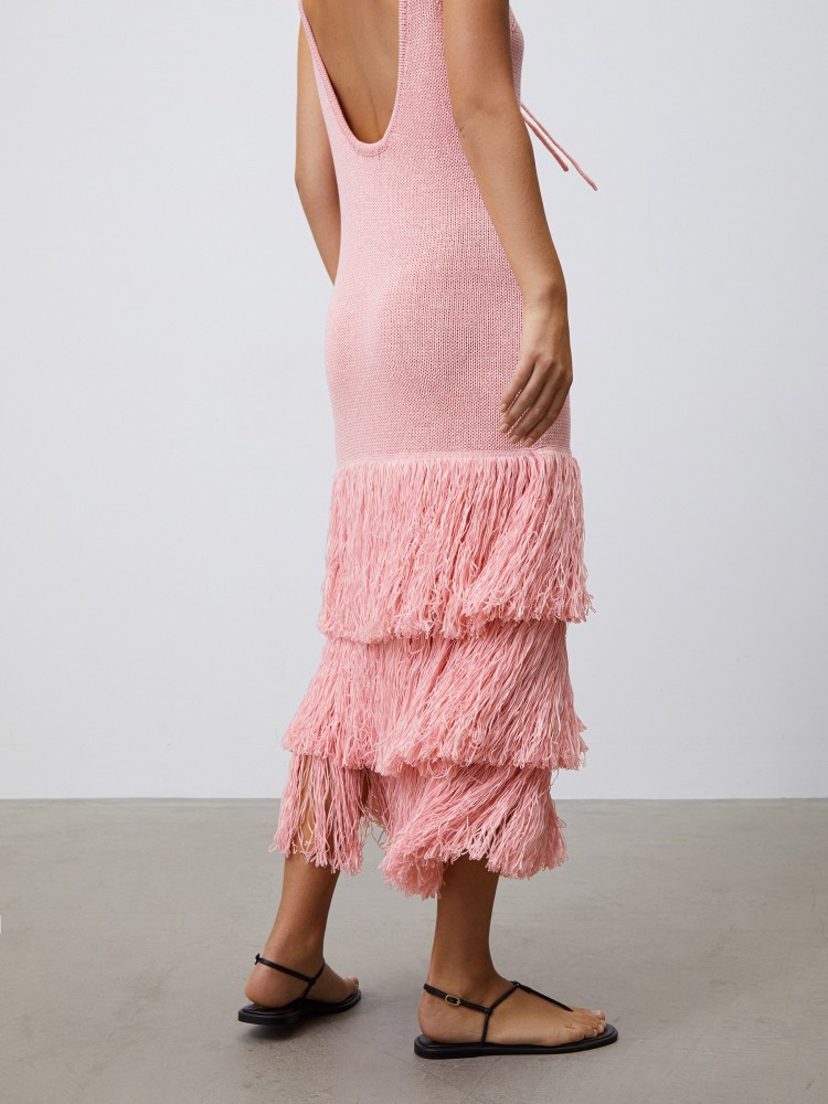Вечернее платье с глубоким вырезом на спине и ярусной бахромой из тонких нитей — образ, который выделит вас среди других. Тяжелый плотный трикотаж комфортно облегает силуэт, а дышащие волокна льна и хлопка сохраняют оптимальную температуру кожи.Платье может вытягиваться под собственным весом. Пожалуйста, храните его на полке.Сделано в Китае.