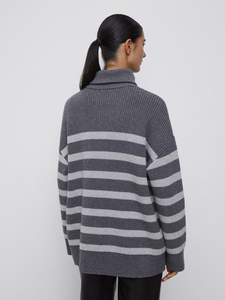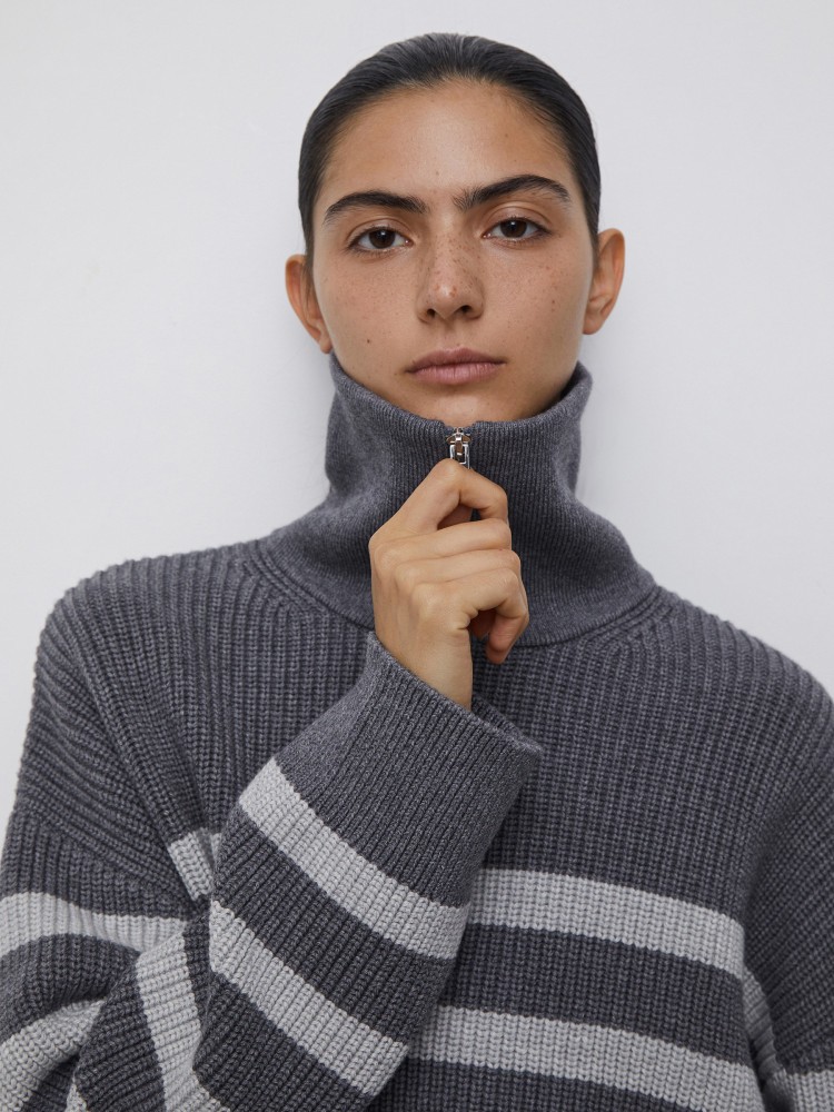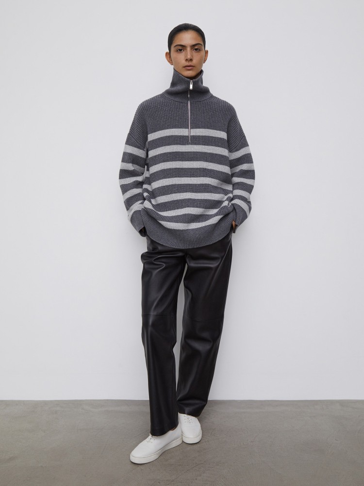 Свитер оверсайз напоминает одежду из мужского гардероба: удлиненный, тяжелый, с воротником на металлической молнии. Шерсть мериноса отвечает за тепло, а хлопок помогает свитеру держать форму. Модель связали в 4 нити воздушным переплетением, поэтому при трении могут появляться пилли: пожалуйста, удалите их с помощью машинки по уходу за шерстью.Сделано в Китае.