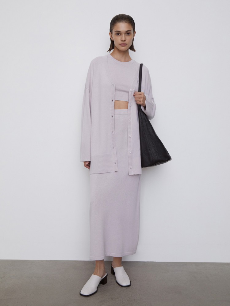 Юбка из тонкого и пластичного трикотажа комфортно облегает силуэт, а широкий эластичный пояс позволяет посадить ее точно по фигуре. Для модели выбрали мягкую и гладкую пряжу из шерсти мериноса с добавлением нежных волокон кашемира.Сделано в Китае.