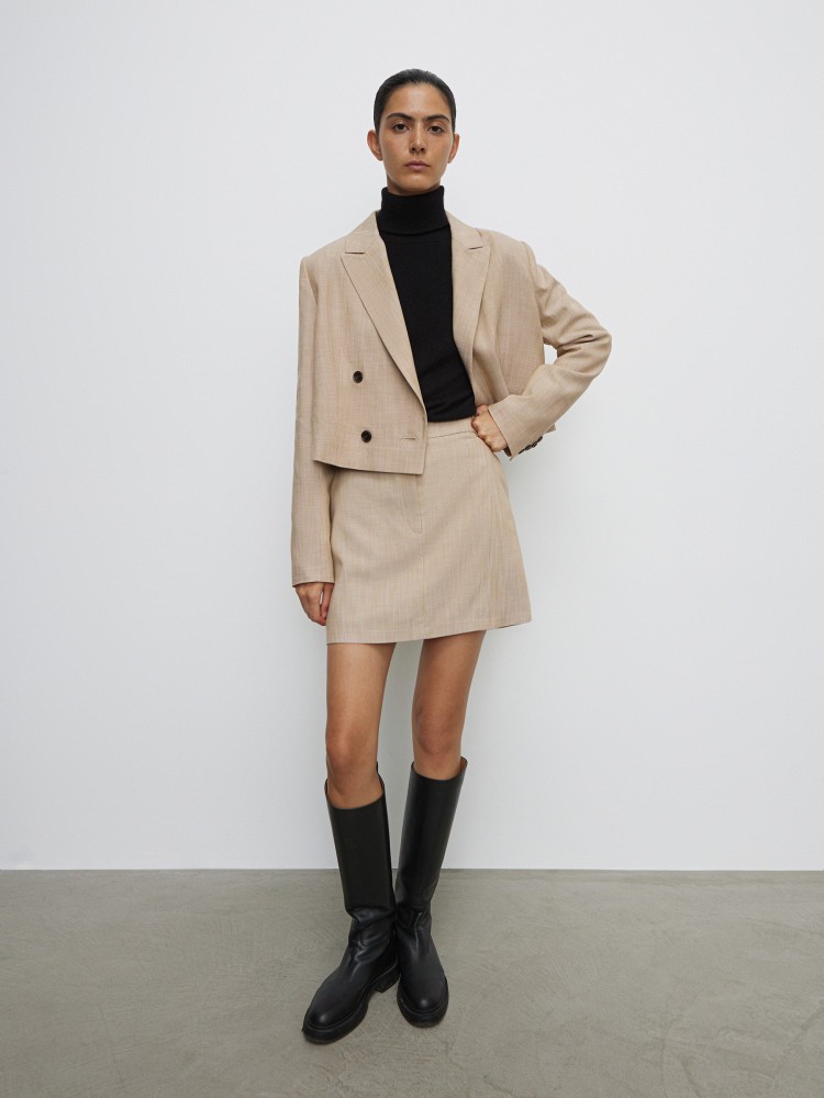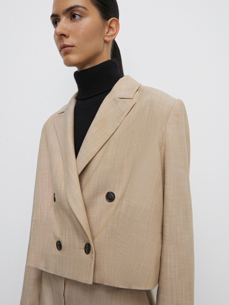 Укороченный жакет с небольшим объемом в плечах — лучшая пара к юбкам и брюкам с высокой посадкой. Модель выполнена из португальской костюмной ткани на основе дышащей вискозы. Благодаря особой технологии материал имеет неоднородную текстуру, которая придает ему визуальное сходство со льном. На подкладке.Сделано в России.