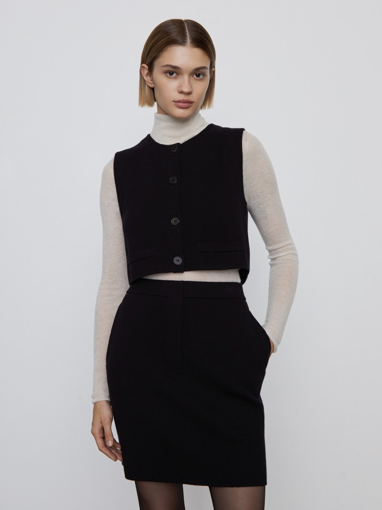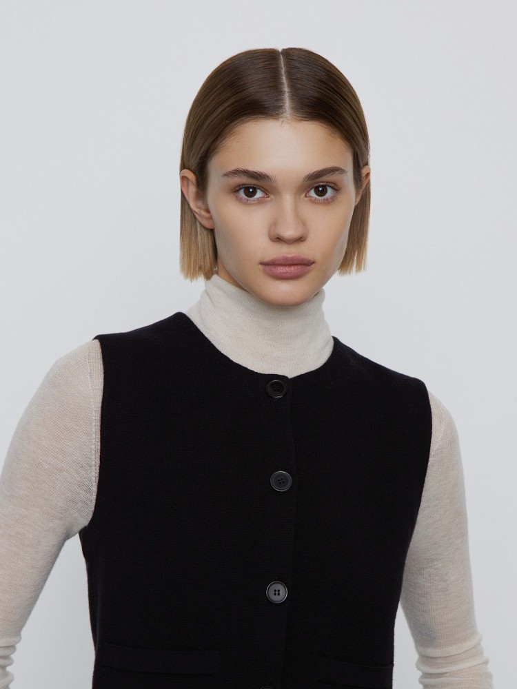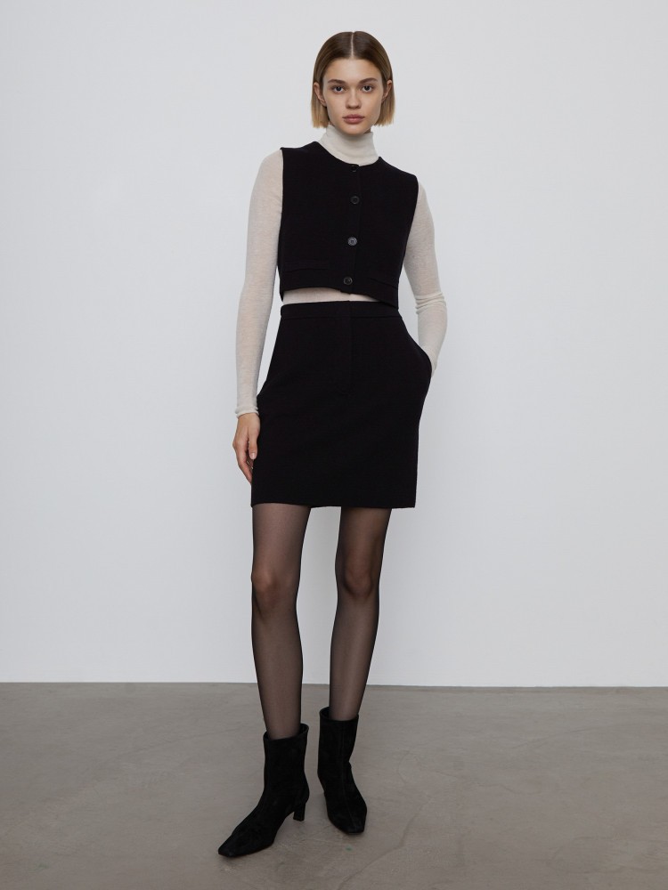 Вязаный жилет — укороченный и минималистичный, с широкими проймами, благодаря которым можно носить его не только как топ, но и как часть образов с рубашками или трикотажем. Для модели выбрали легкую пряжу из хлопка и шерсти мериноса: с помощью технологий мерсеризации с нити убрали ворс, из-за чего трикотаж визуально и наощупь напоминает плотную и мягкую костюмную ткань.Сделано в Китае.
