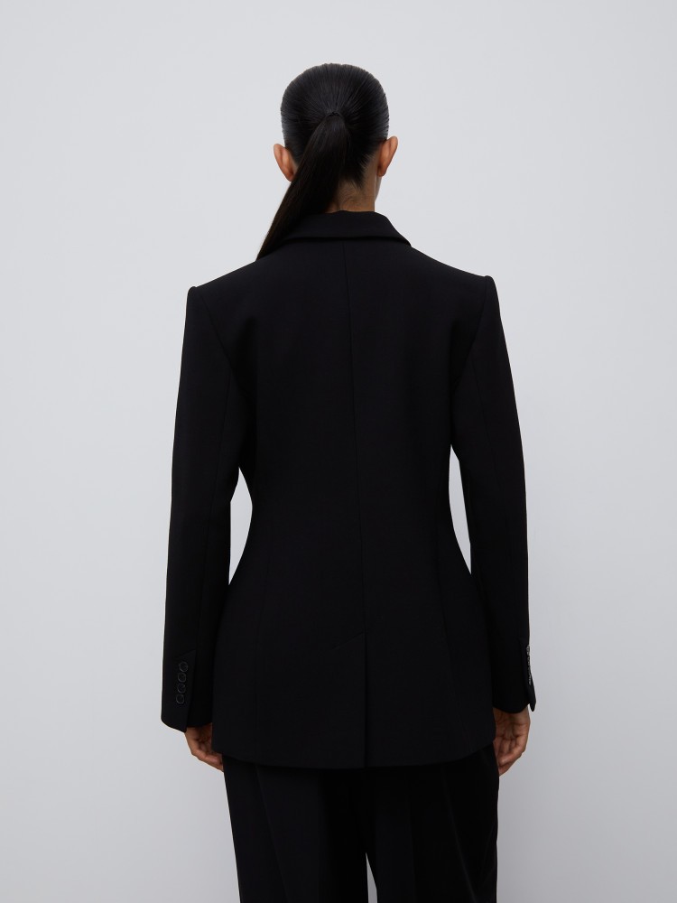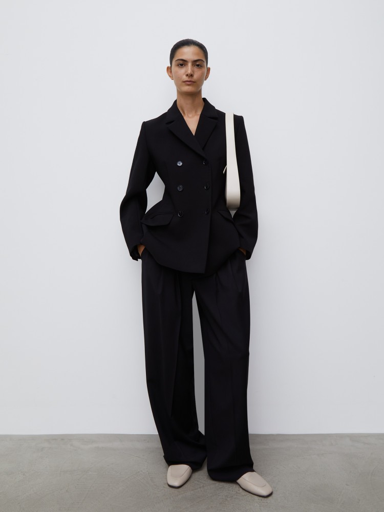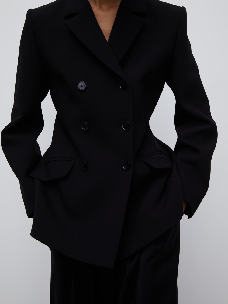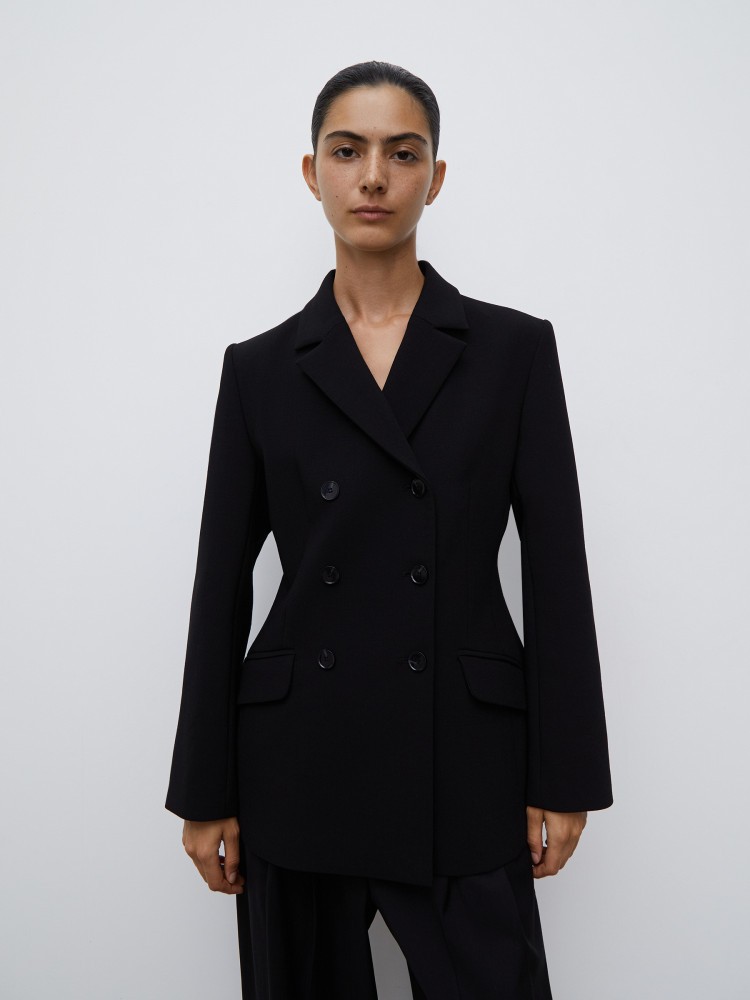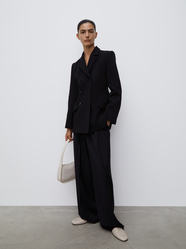 Двубортный жакет — яркая модель, которую можно интегрировать и в casual, и в вечерние образы благодаря приталенному силуэту. Для жакета выбрали плотную, двухслойную шерсть с небольшой фактурой: искусственные волокна делают материал более долговечным и слегка эластичным, что важно для комфортной посадки.Сделано в России.