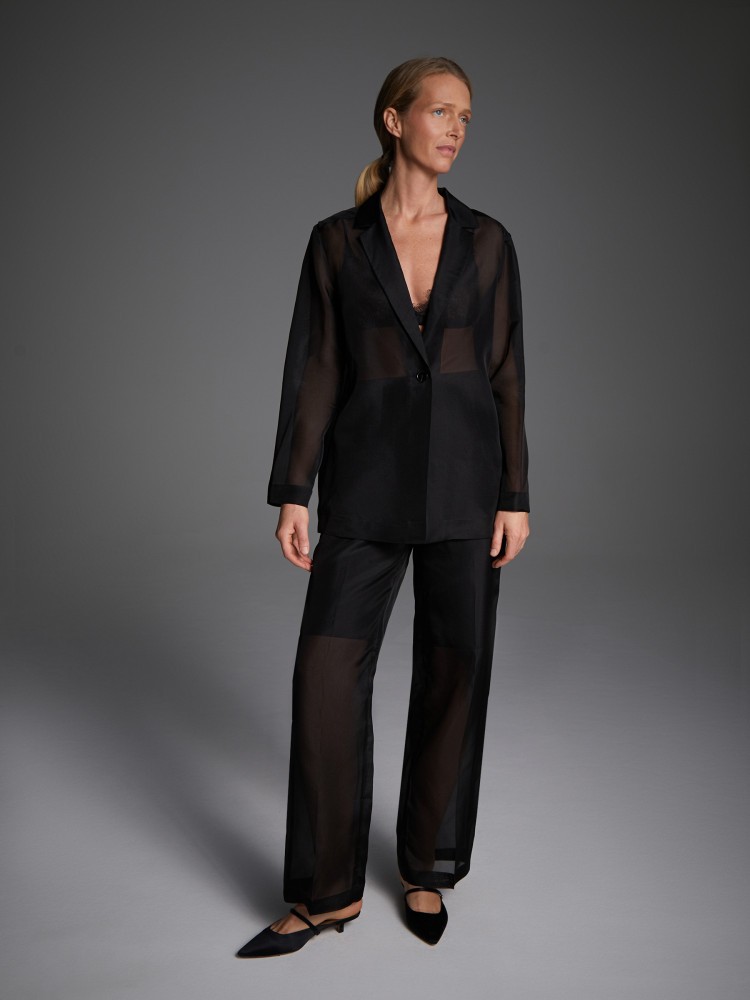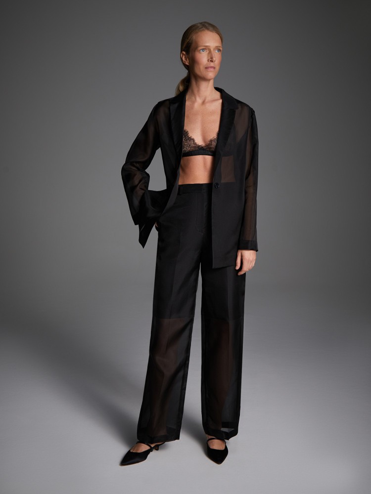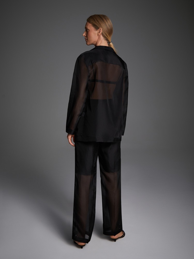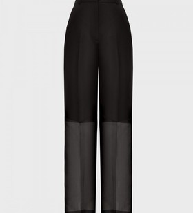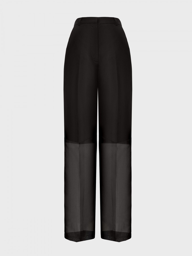 Прямые брюки из прозрачной ткани дополнены нижними шортами из 100% хлопка. Гладкая и непластичная органза соткана из тончайших шелковых нитей, обладает легким блеском и окутывает силуэт, как вуаль.