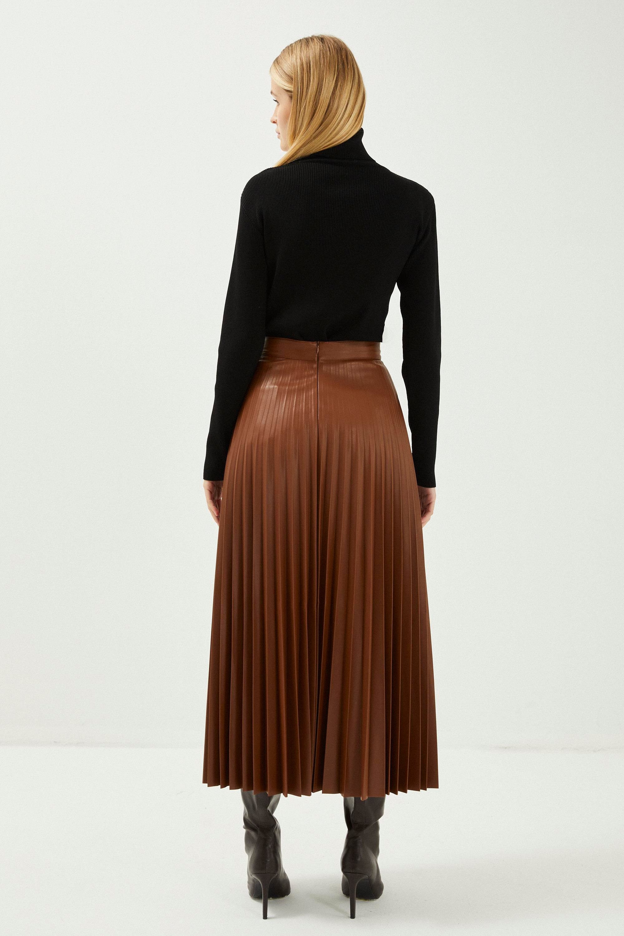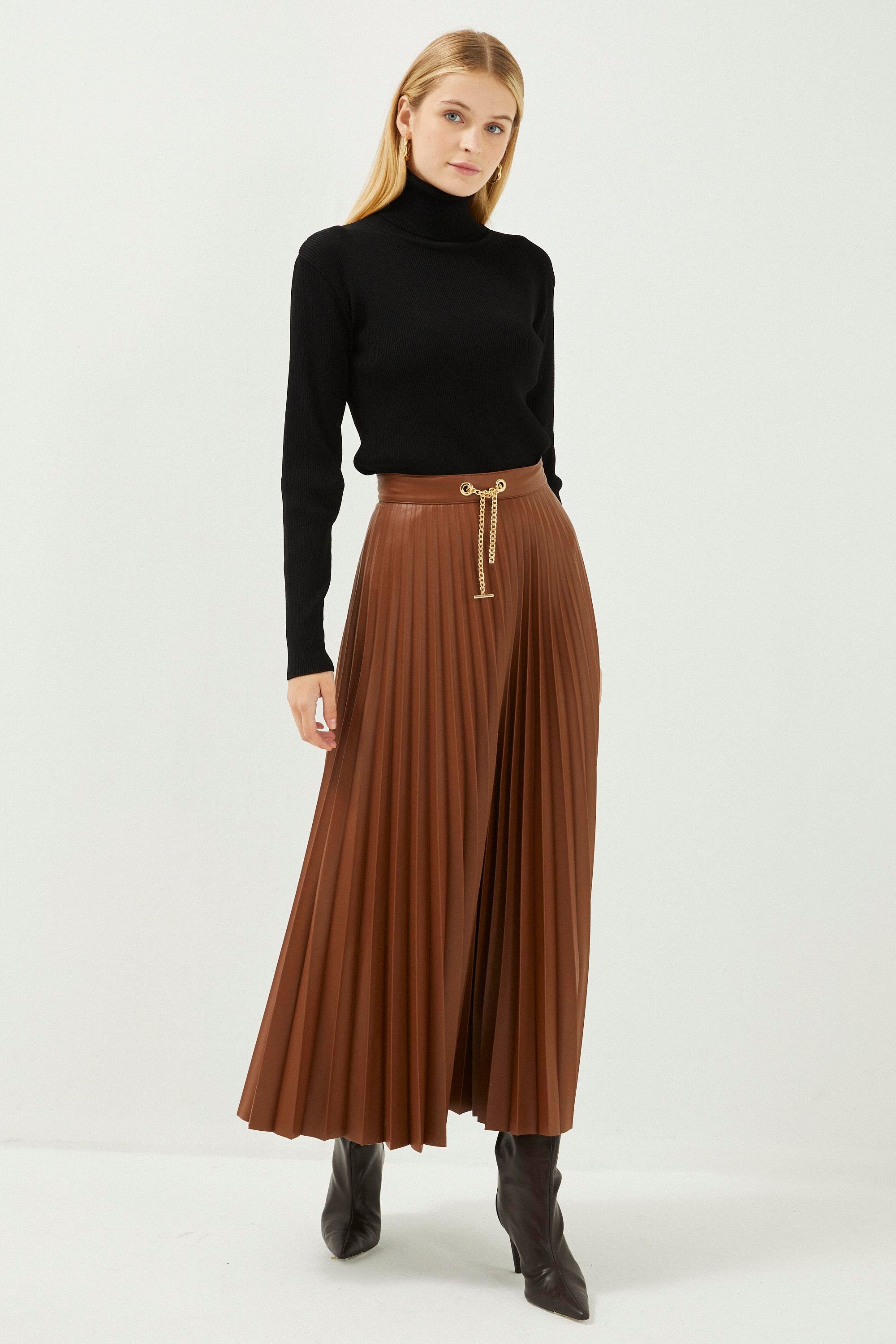Длинная коричневая юбка - это модель юбки, которая достигает пола или почти достигает его. Длинная юбка может быть различных фасонов, но в данном случае она имеет плиссировку - это складки, которые придают юбке объем и движение. Цепочка - это деталь, которая добавляет юбке интересный акцент и может быть использована как элемент декора или функциональный элемент, например, для застегивания юбки.