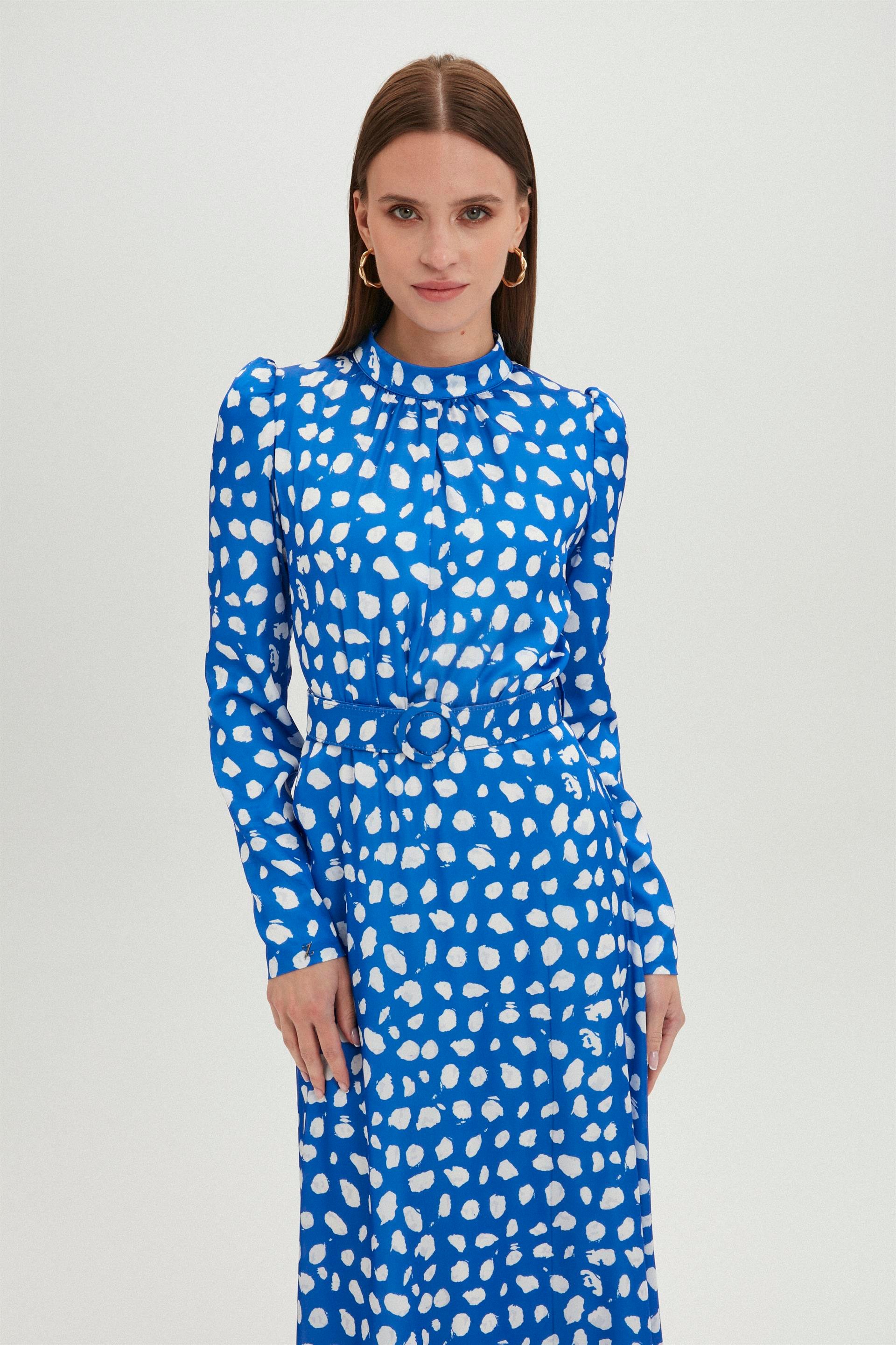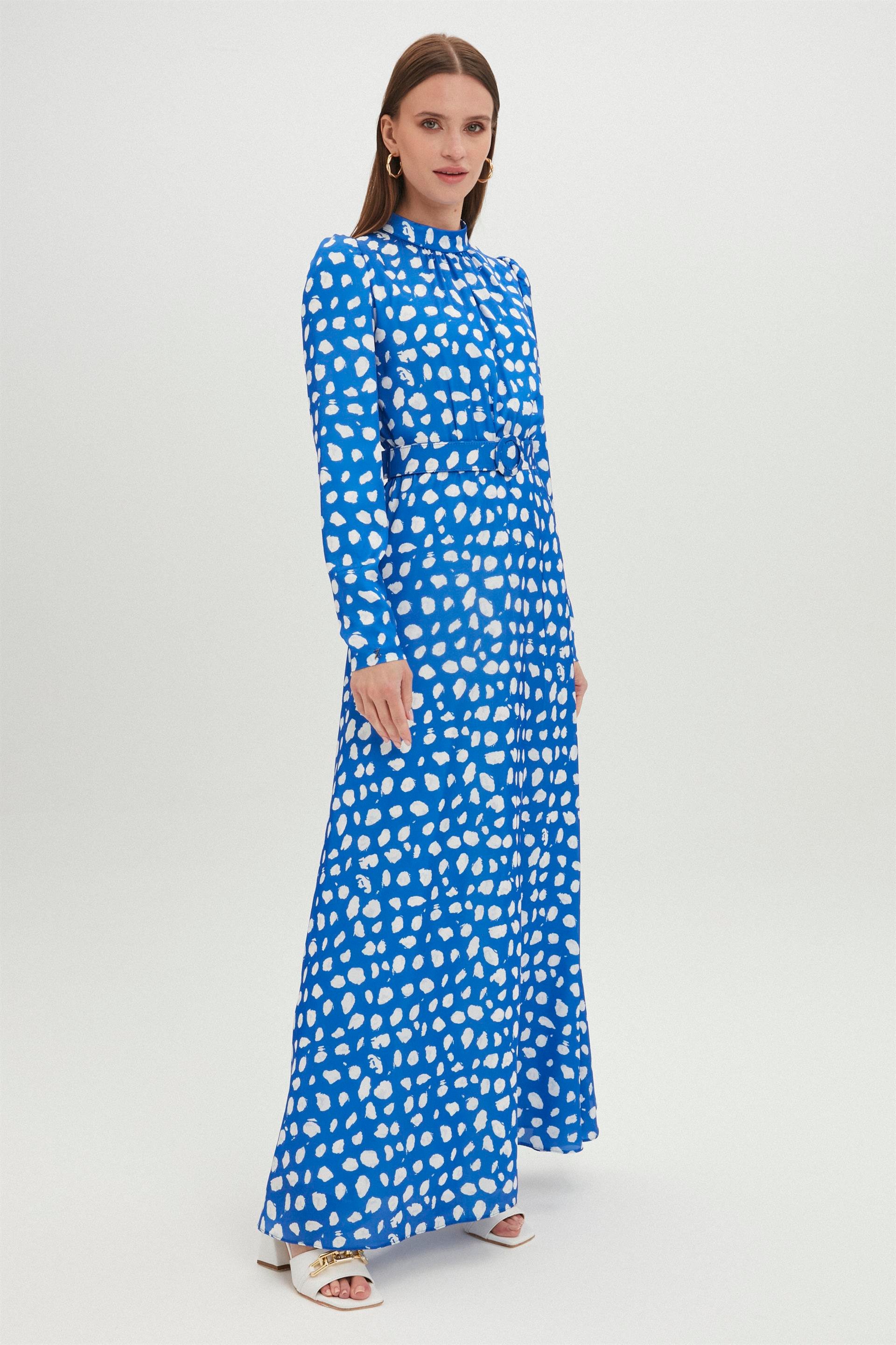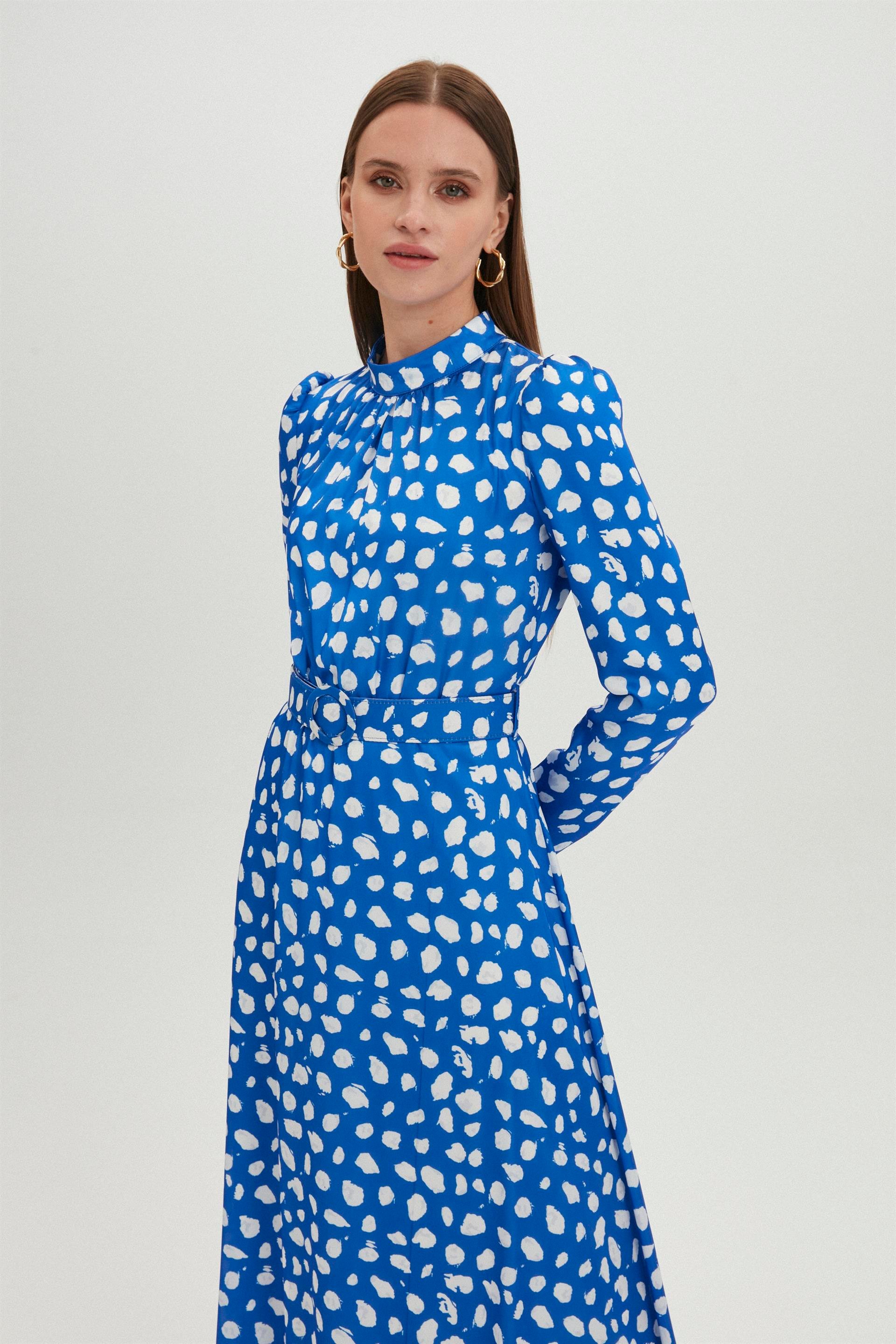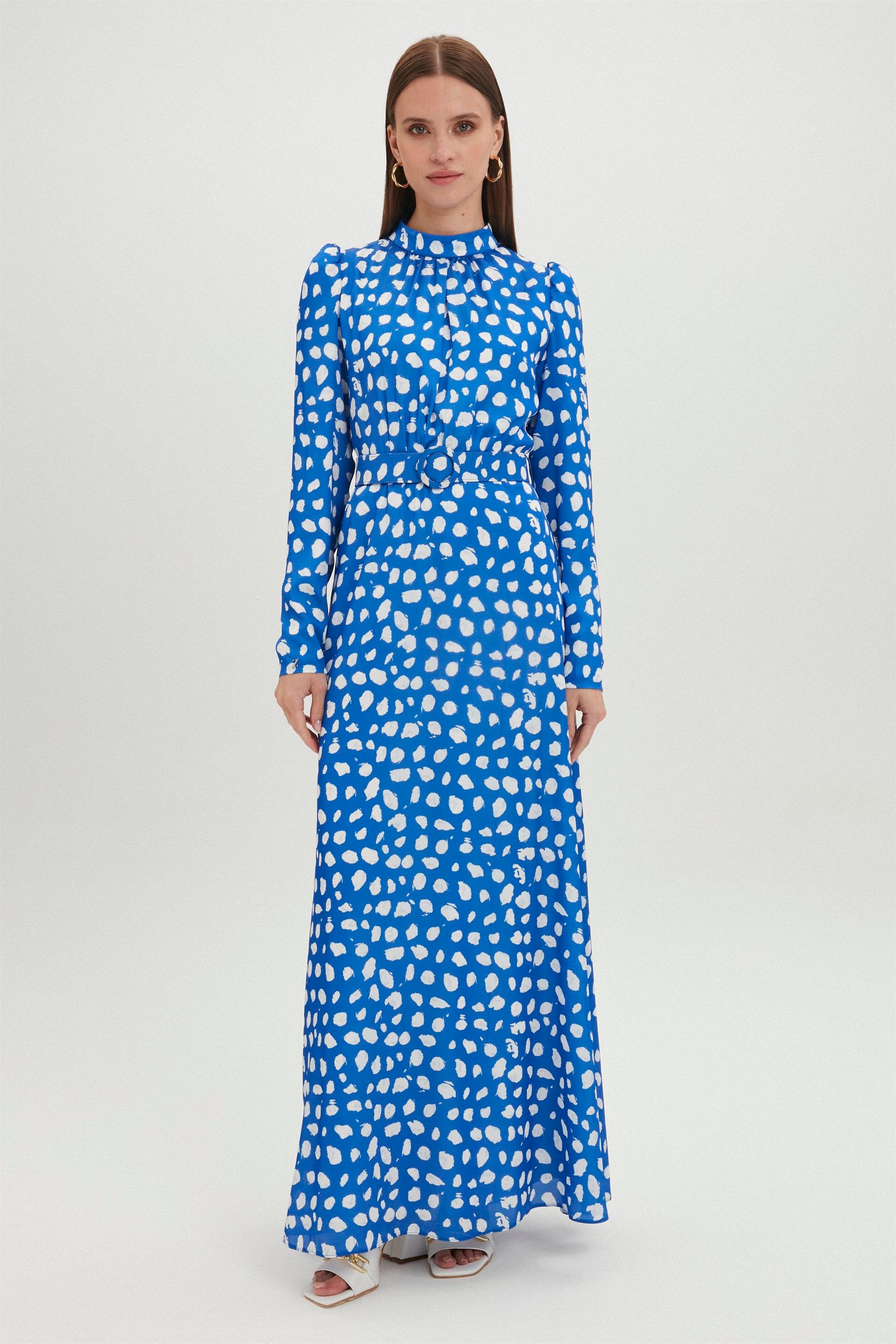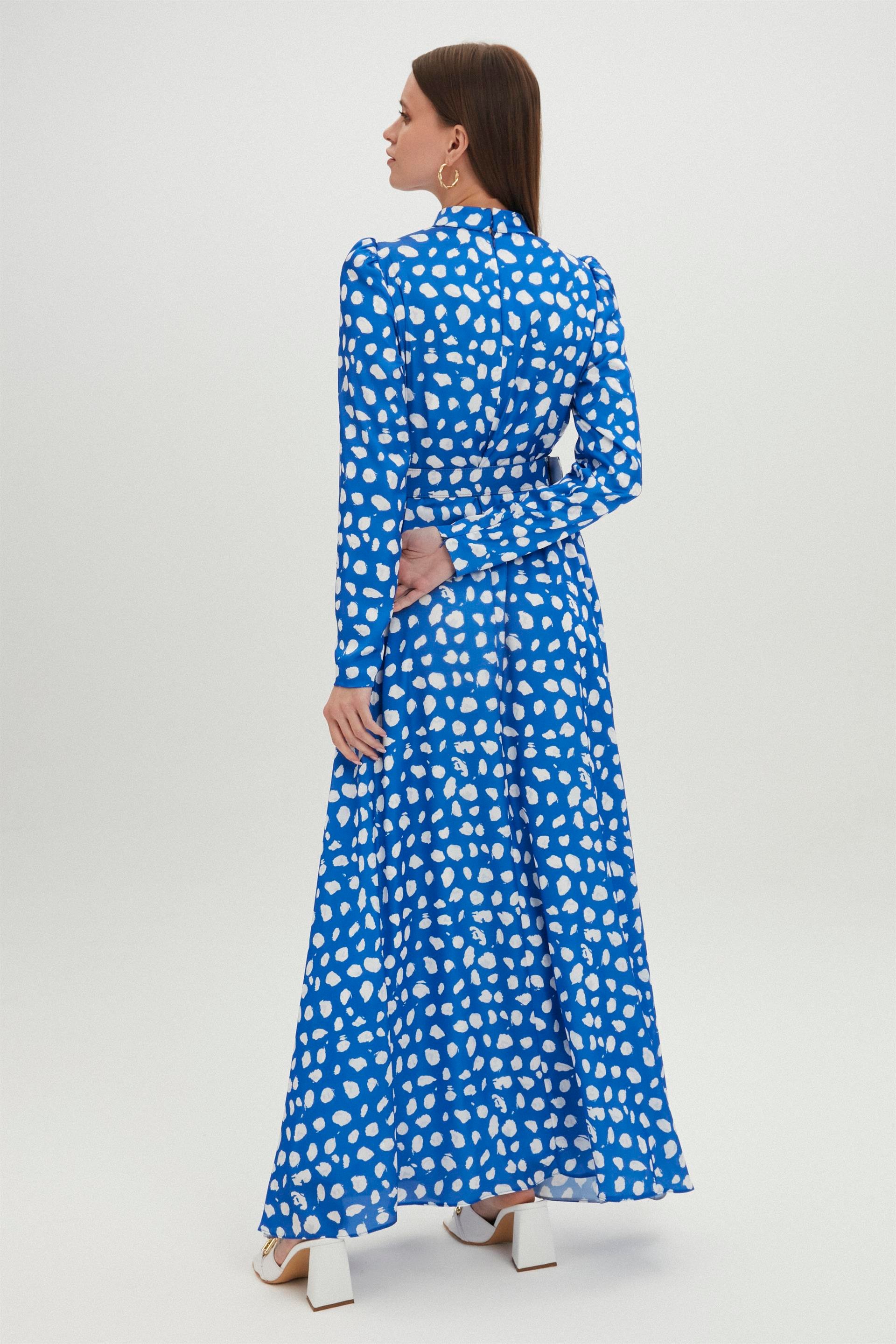 - Длинное синее платье с высоким воротником