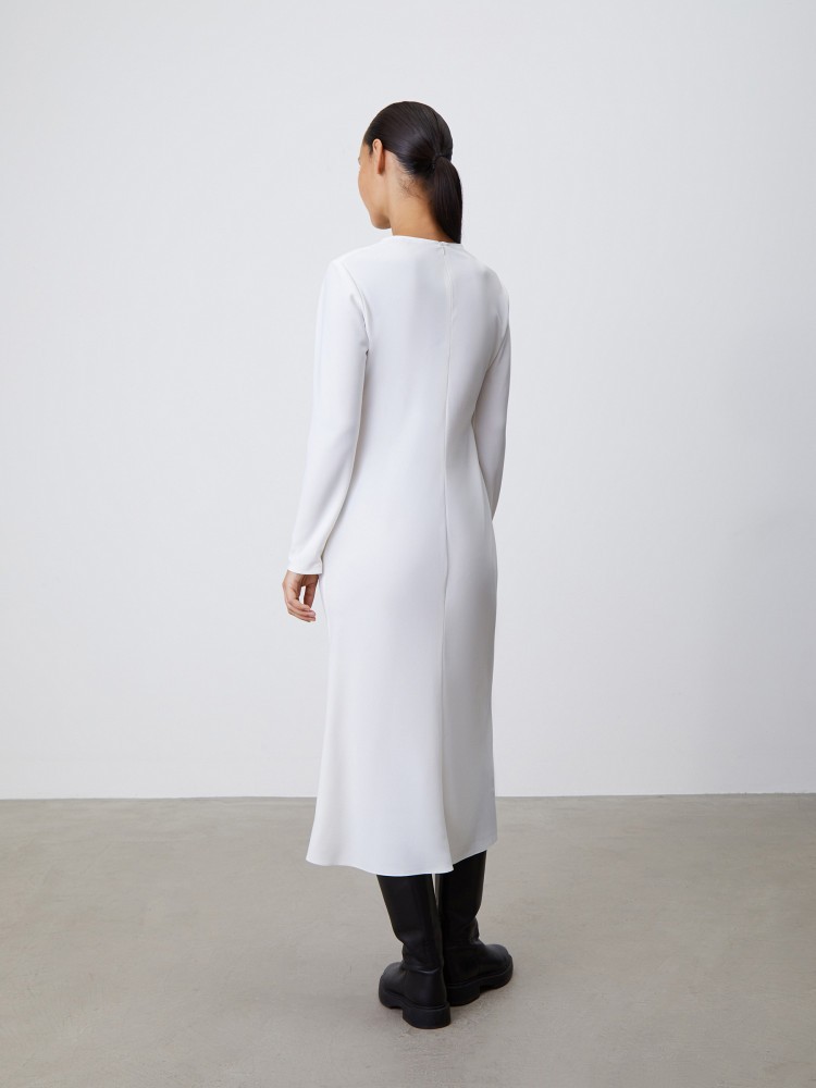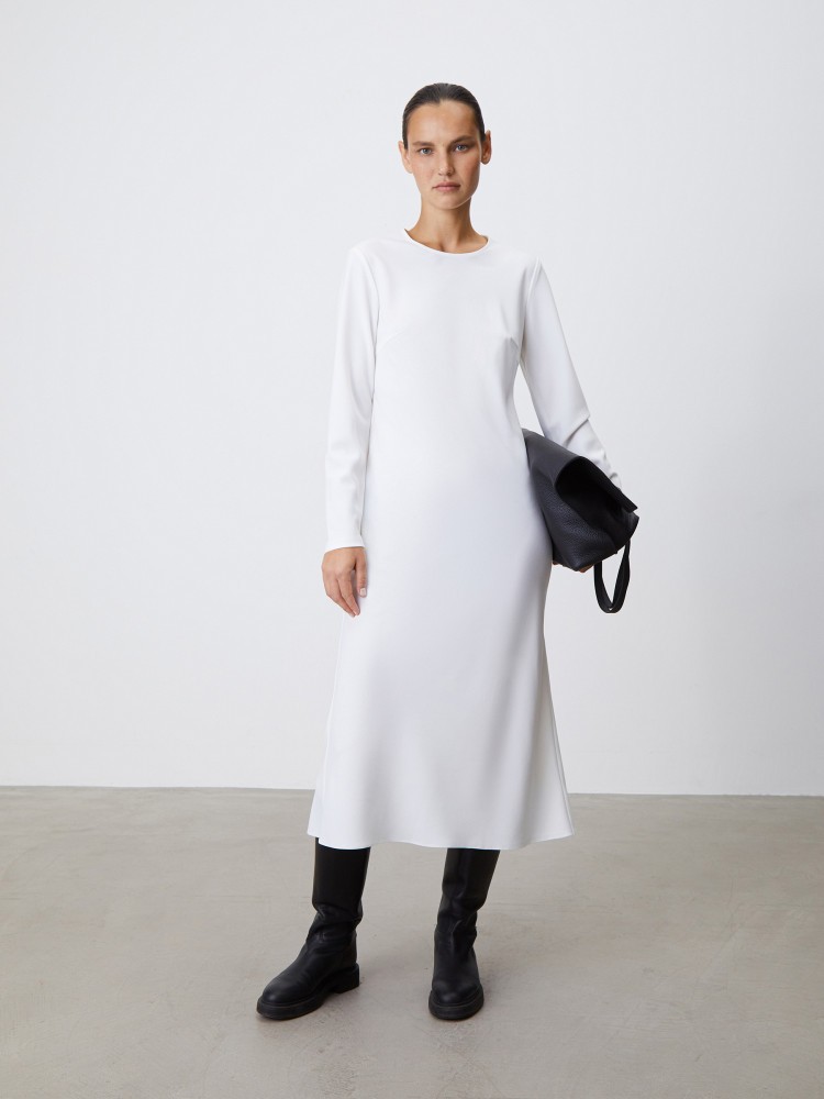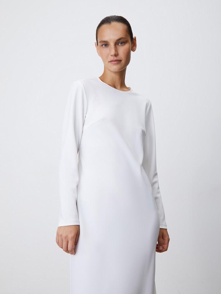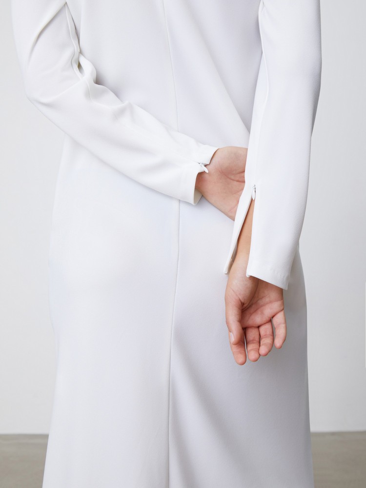 Вечернее платье с длинными узкими рукавами и юбкой годе — основа элегантного образа в классическом стиле. Для модели выбрали мягкую и тонкую плательную ткань, а рукава дополнили молниями: их можно расстегнуть, чтобы открыть красивые запястья. Без подкладки.