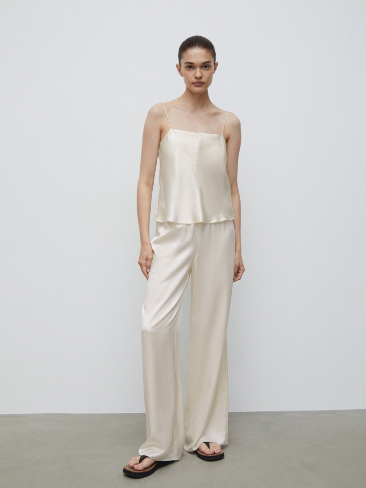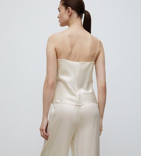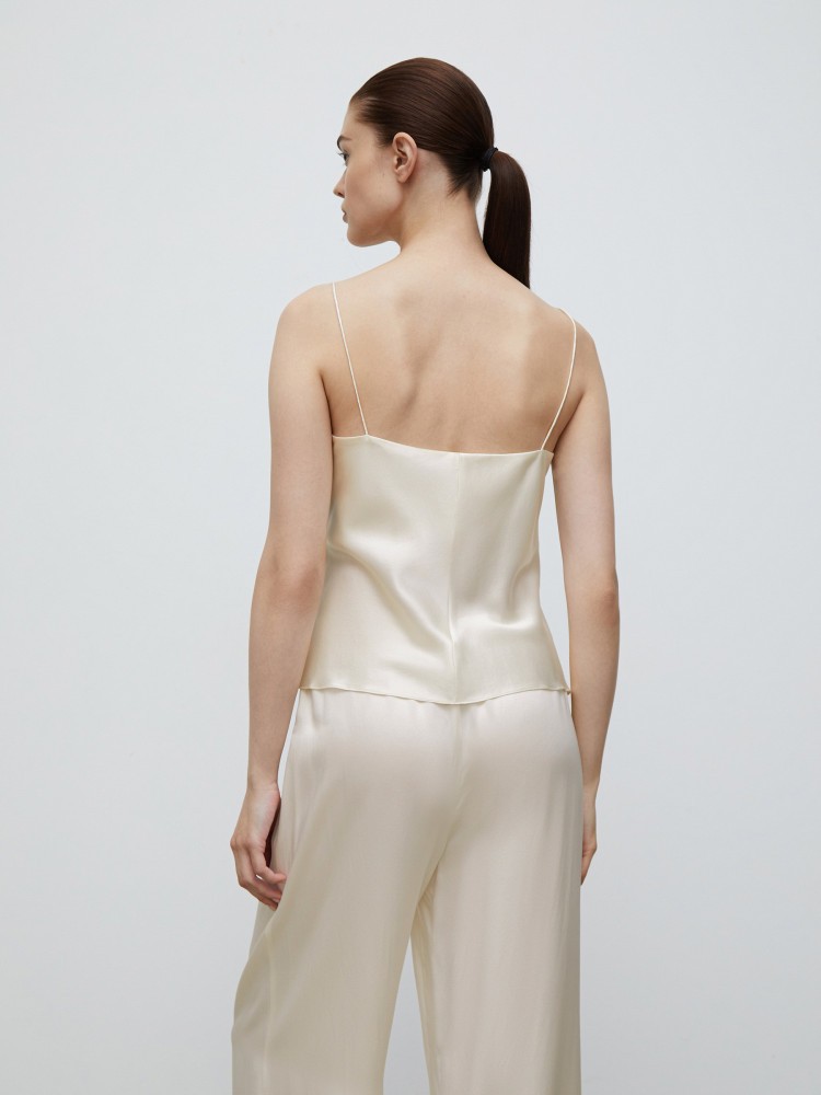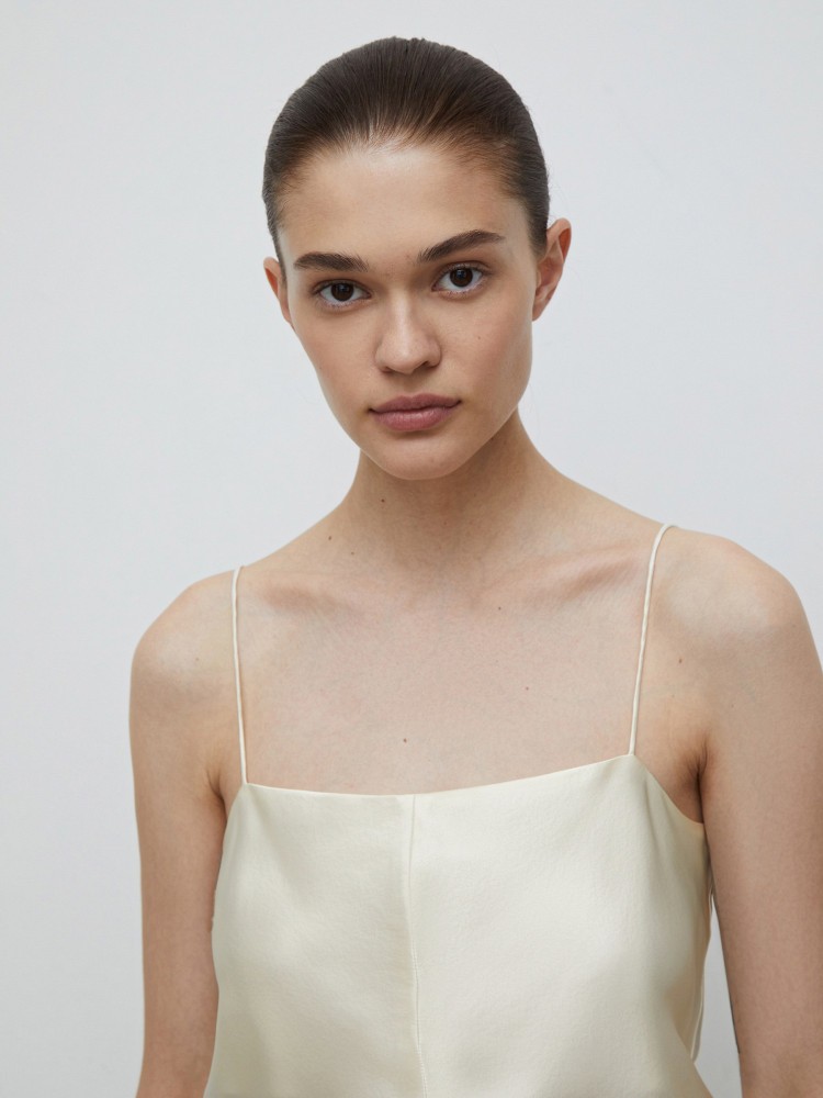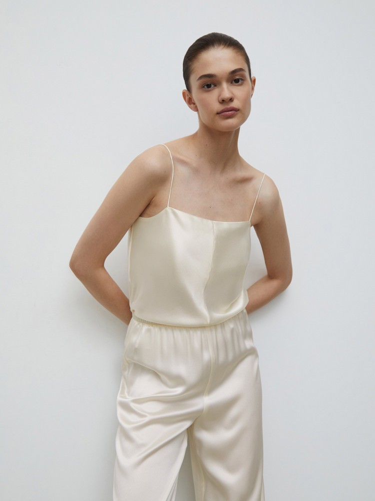 Прямой топ на тонких бретелях поможет собраться на вечеринку за несколько минут. Добавьте светлые джинсы, жакет или кашемировый джемпер, белые кеды, соберите волосы — все, можно выходить. Для модели выбрали натуральный тутовый шелк плотностью 22 mm — ткань отлично дышит и струится по телу, оставляя ощущение прохлады.