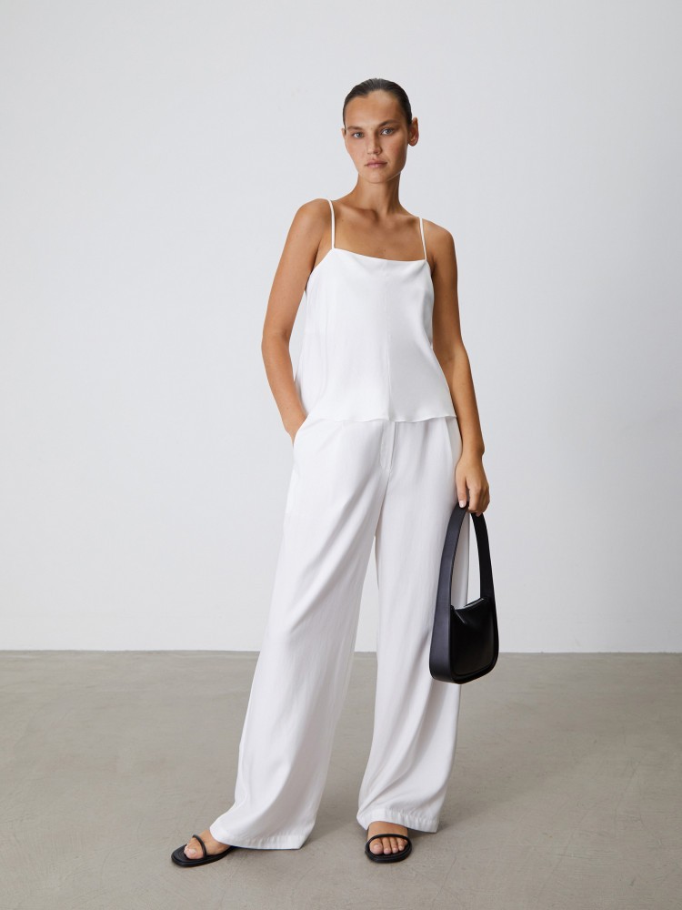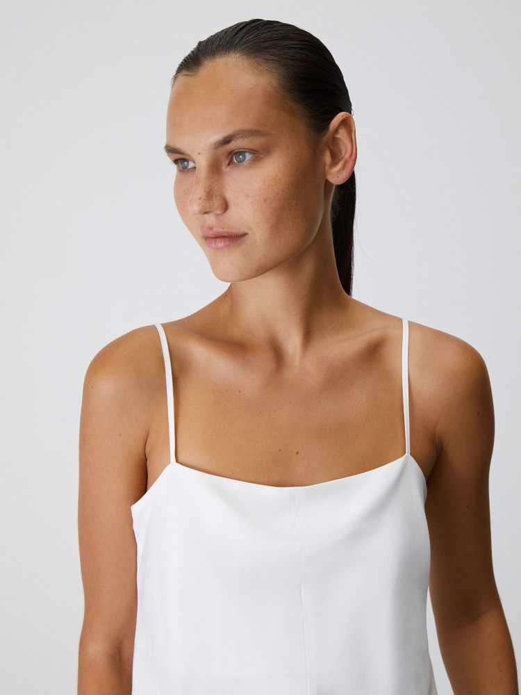 Прямой топ на тонких бретелях поможет собраться на вечеринку за несколько минут. Добавьте светлые джинсы, жакет или кашемировый джемпер, белые кеды, соберите волосы — все, можно выходить. Мягкая и нежная к коже ткань отлично дышит благодаря вискозе, а струящийся шелк добавляет ей едва неброское сияние.