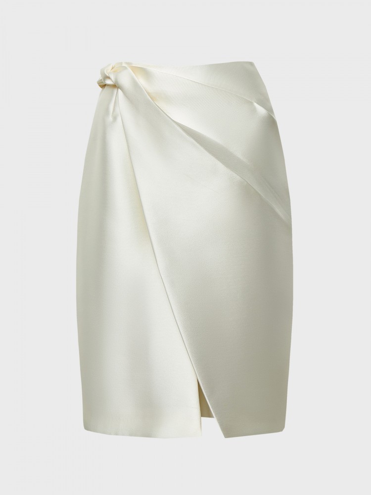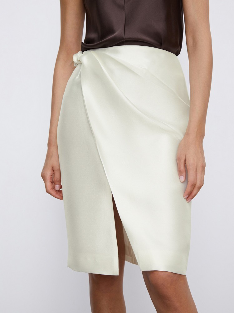 Юбка из блестящей тафты. Сложный крой этой юбки подчеркивает фактуру переливающейся ткани, а смещенный от центра разрез приоткрывается, когда вы сидите нога на ногу. Для модели выбраны тонкая и плотная тафта, которая отлично удерживает форму, и шелковистая подкладка, которая отвечает за ваш комфорт.