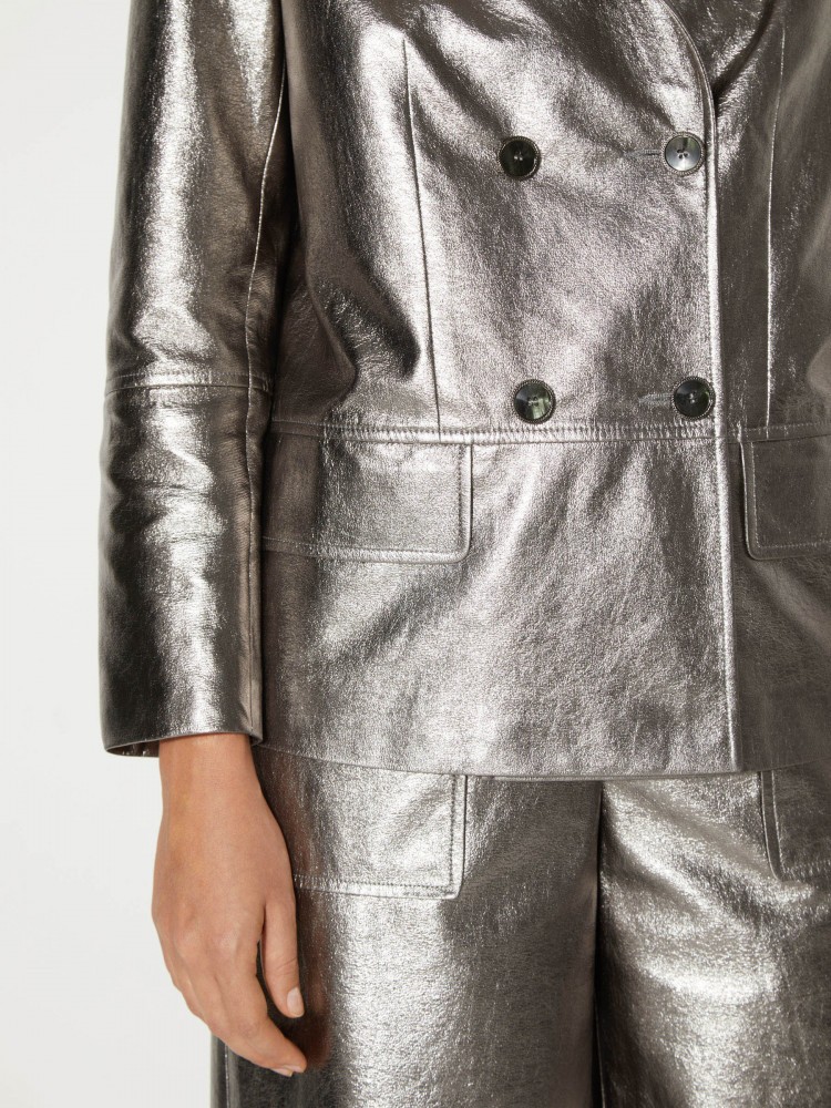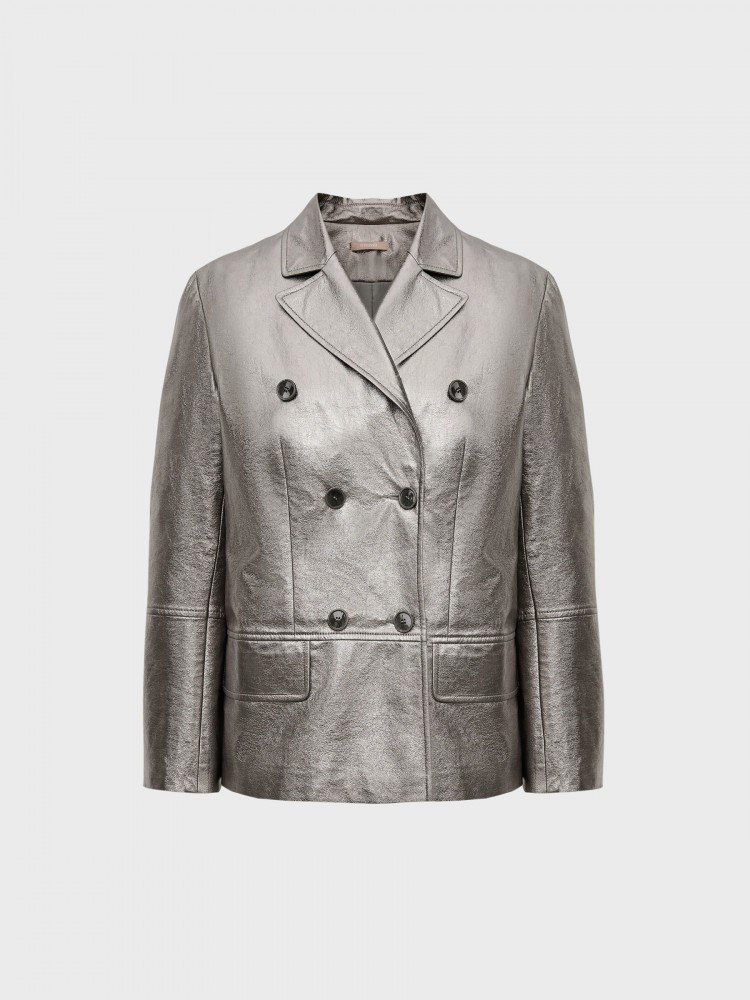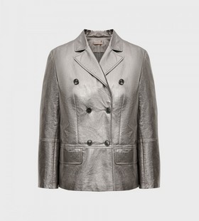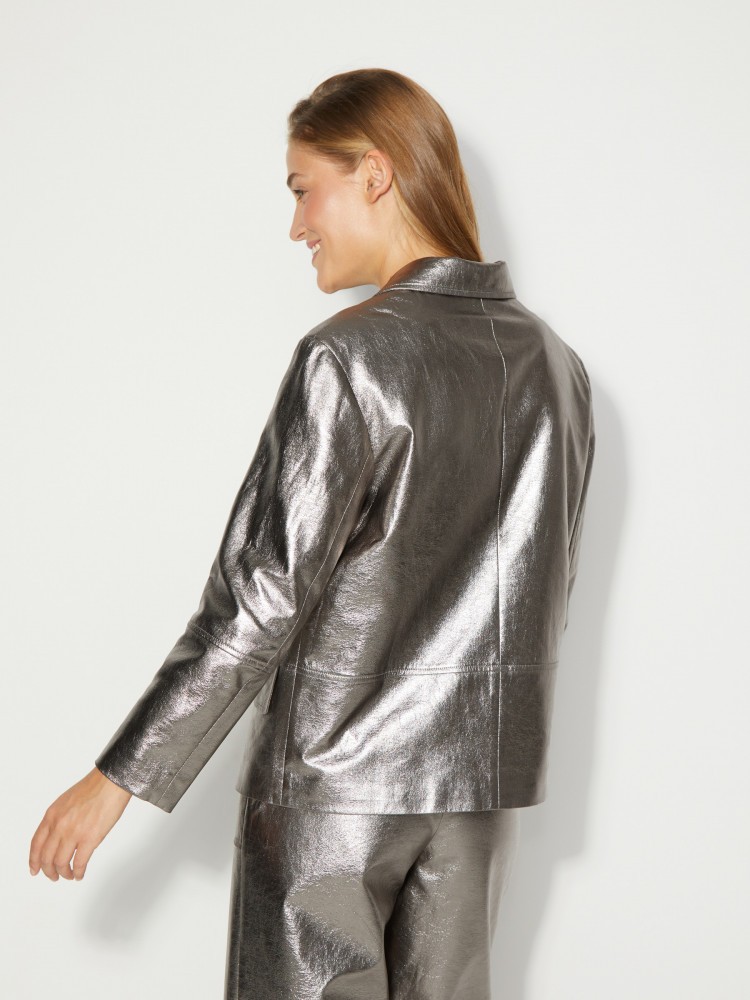 Жакет из искусственной кожи. Объемный двубортный жакет дополнит образы с брюками и юбками из струящихся и блестящих тканей, джинсами и одеждой из кожи. Для модели выбрана искусственная кожа, которая визуально и на ощупь не отличима от шевро — специальное покрытие создает эффект черненого серебра. На подкладке.