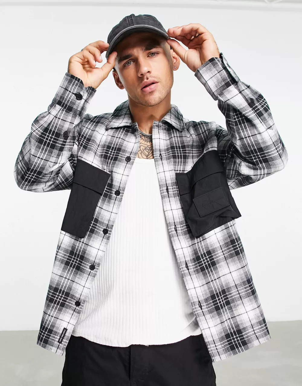 AllSaints Newrose long sleeve check shirt in off white and grey with back print
