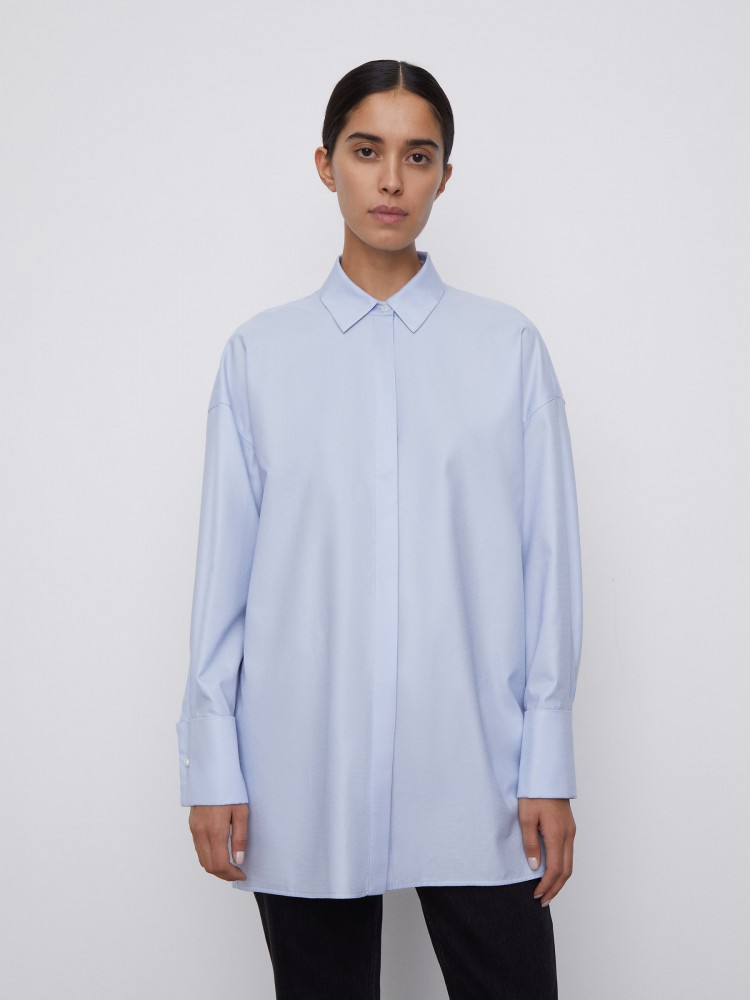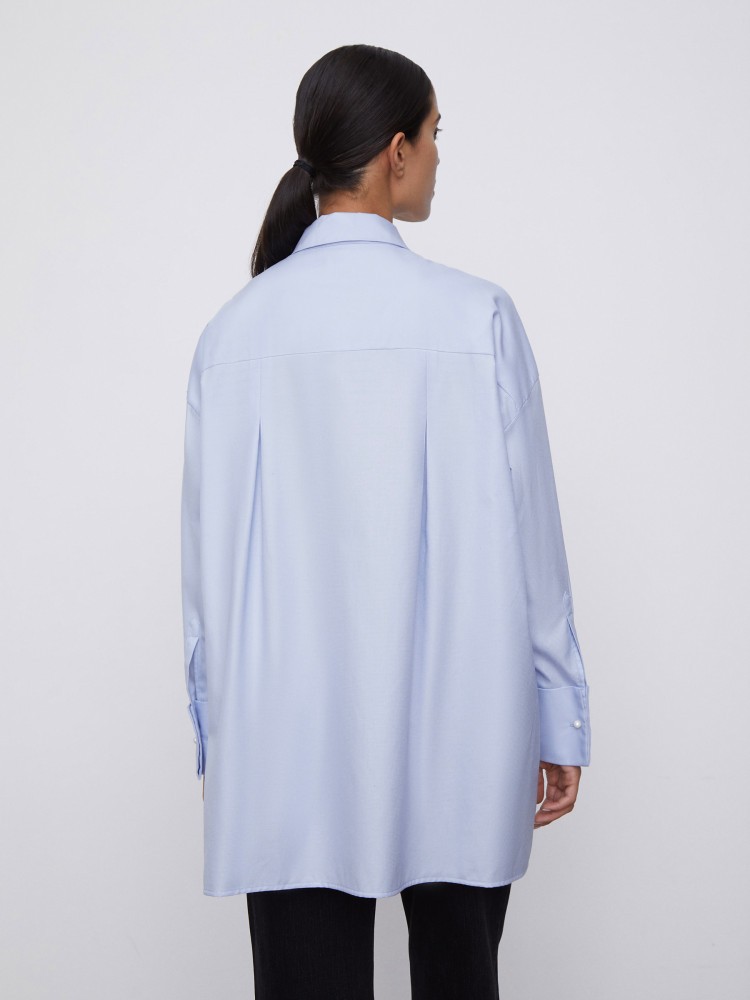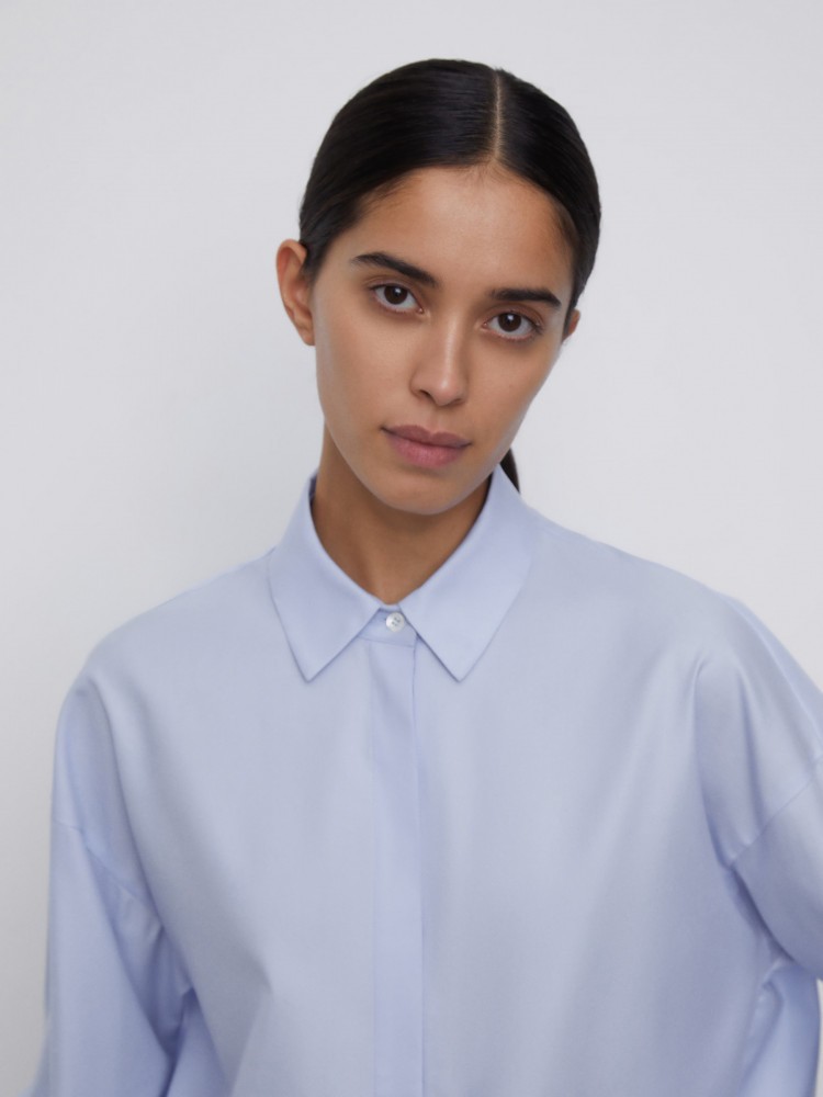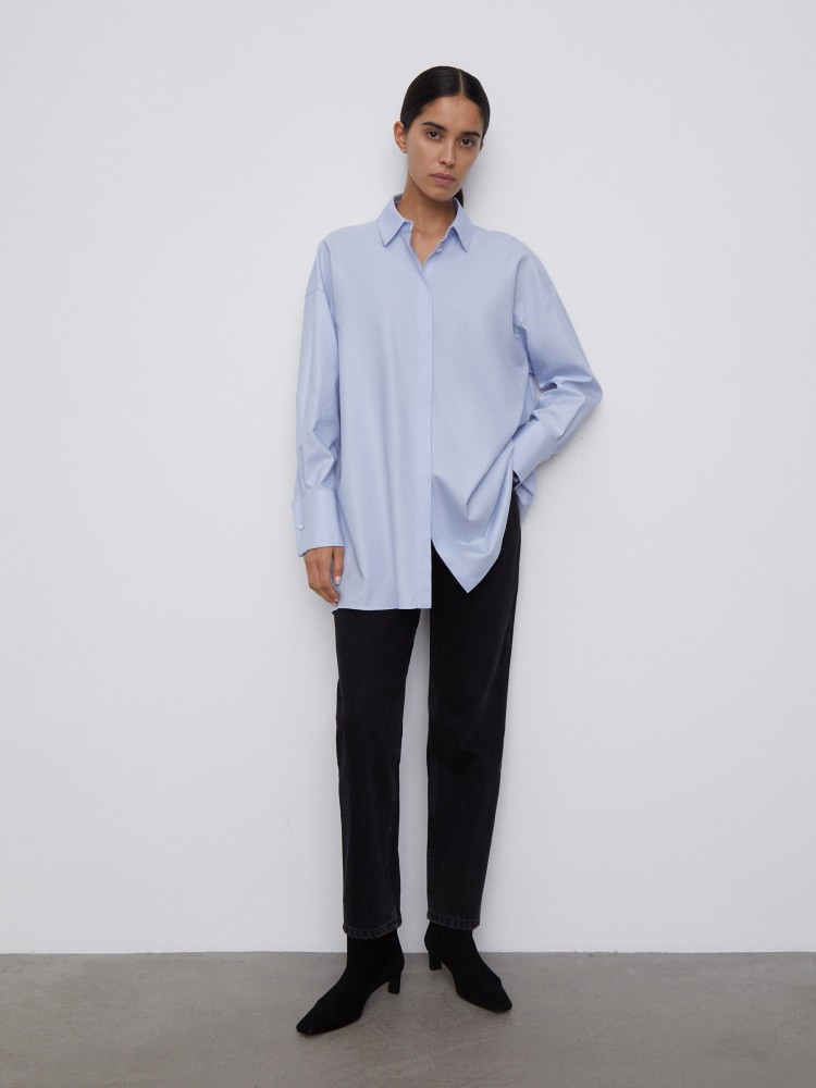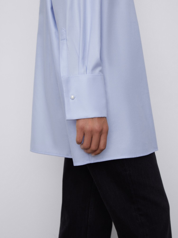 Рубашка оверсайз с широкими манжетами и пуговицами-жемчужинками — модель, которую можно стилизовать и с классическими брюками в офис, и с джинсами на прогулку. Тонкий прочный материал из длинных волокон хлопка не скатывается, сохраняет оттенок и гладкость после многочисленных стирок.Сделано в Беларуси.