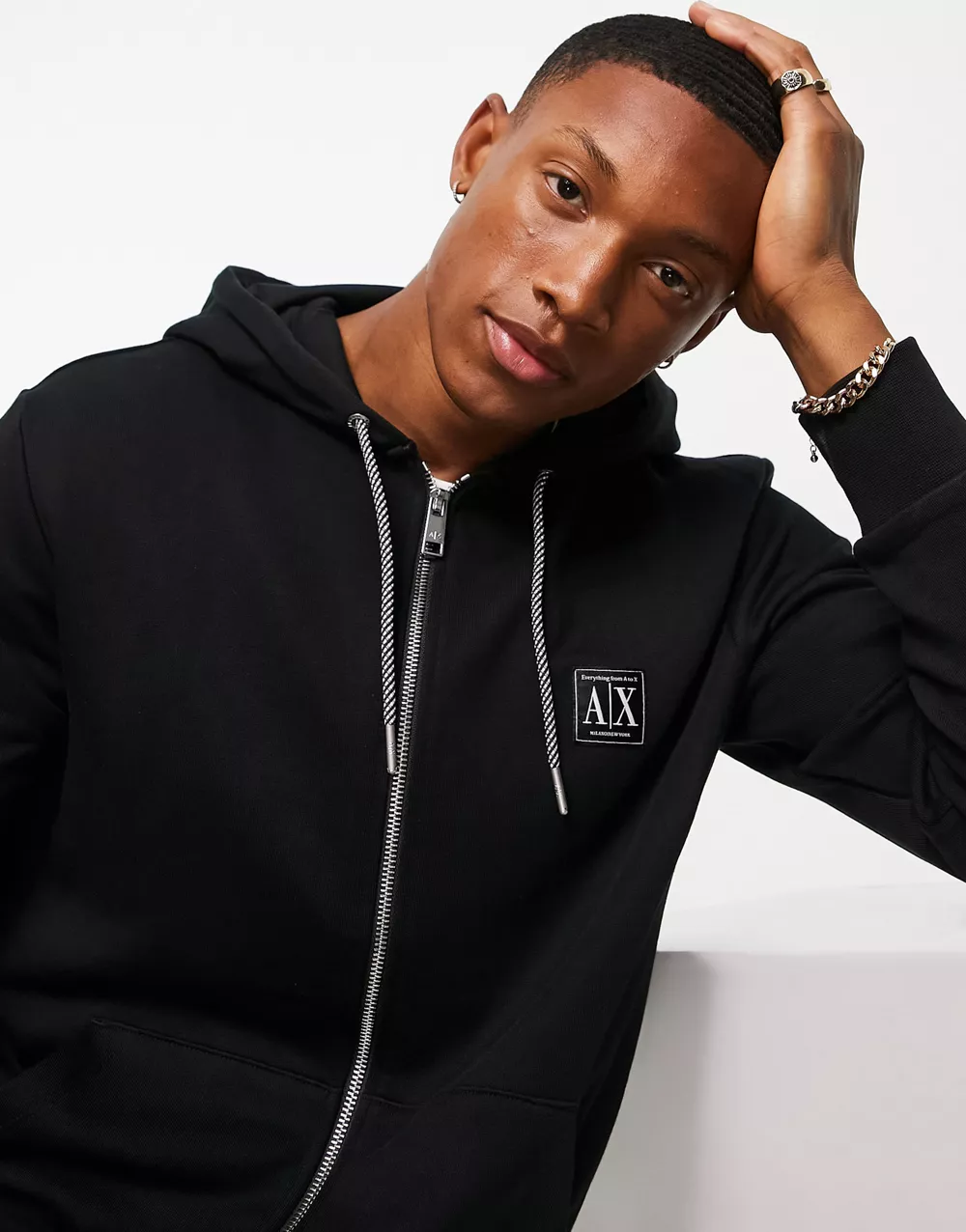 - Armani Exchange small box AX logo print zip through hoodie in black