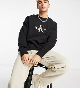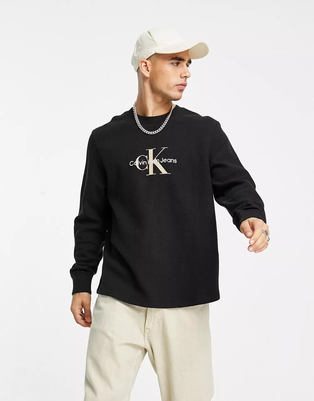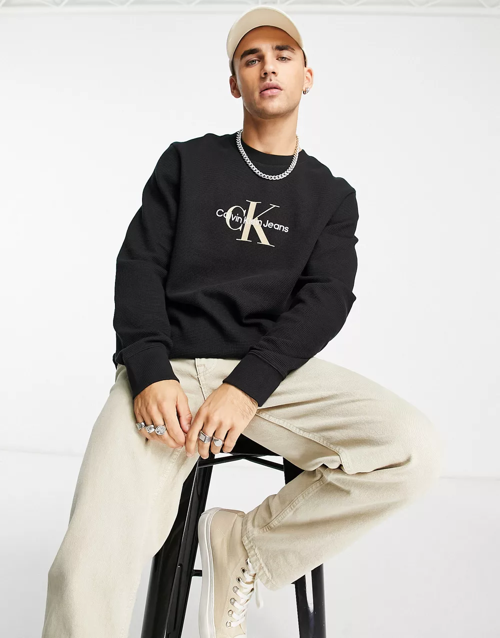 - Calvin Klein Jeans archival monologo waffle relaxed fit sweatshirt in black