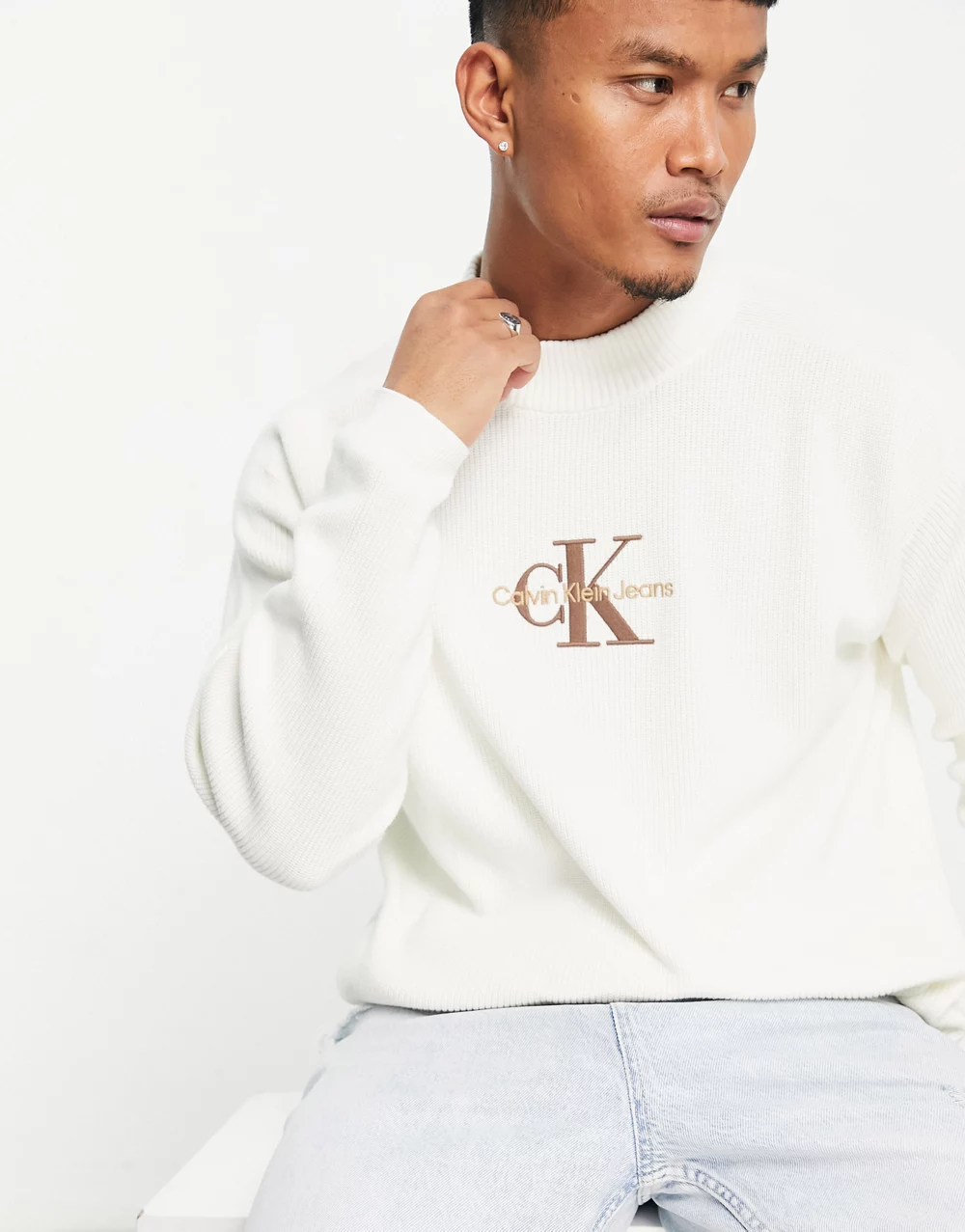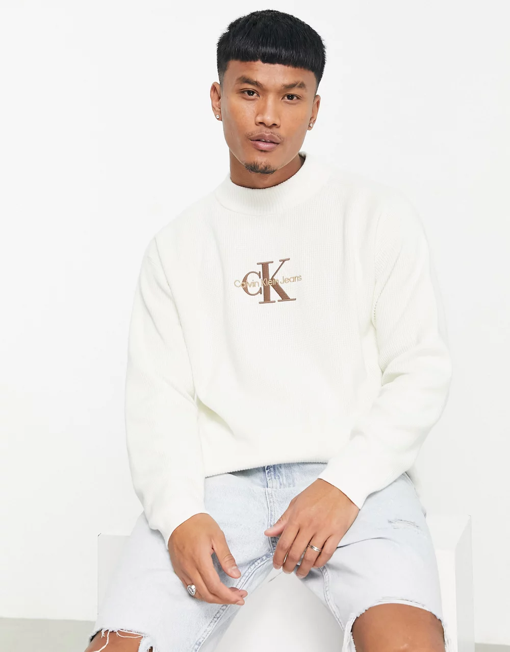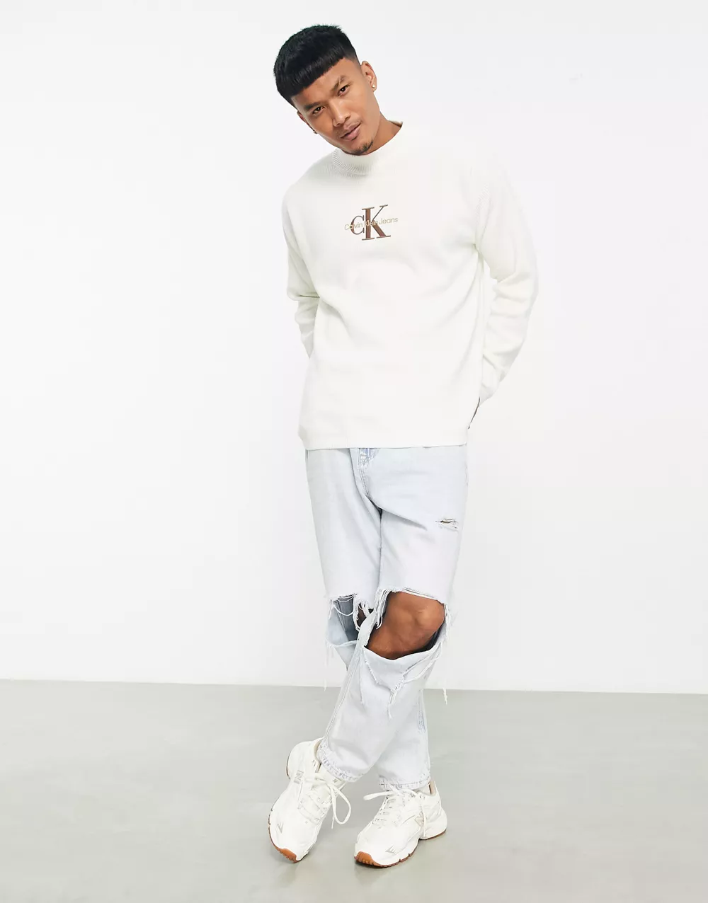 - Calvin Klein Jeans monologo relaxed fit high neck knit jumper in ivory