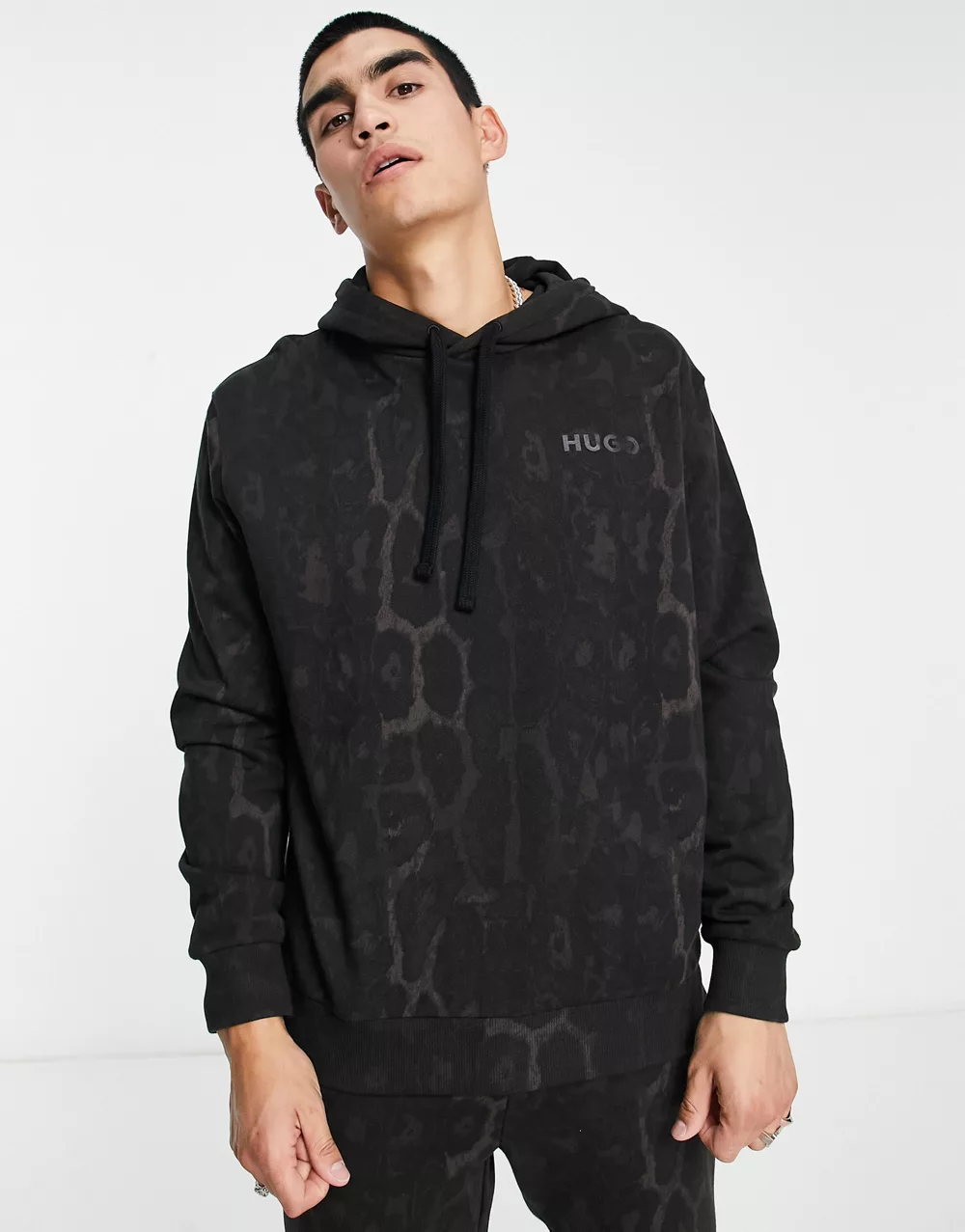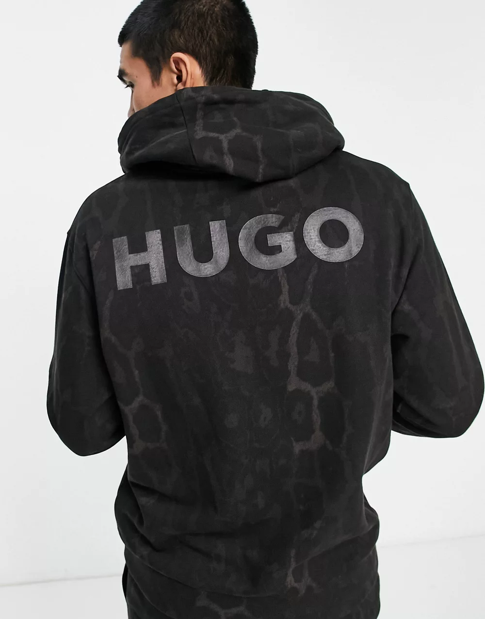 - HUGO Daglion relaxed fit hoodie in black with all over animal print with back logo