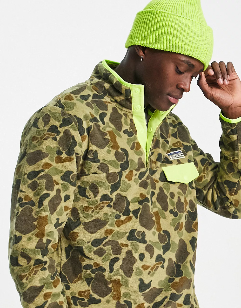 - Polo Ralph Lauren borg contrast pocket camo print half zip sweatshirt in dark green
