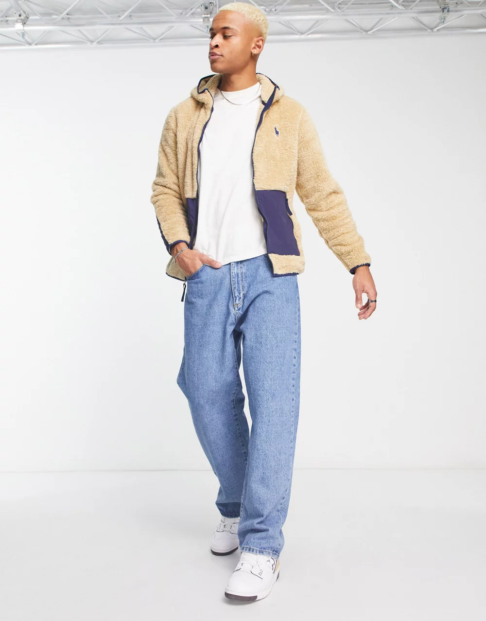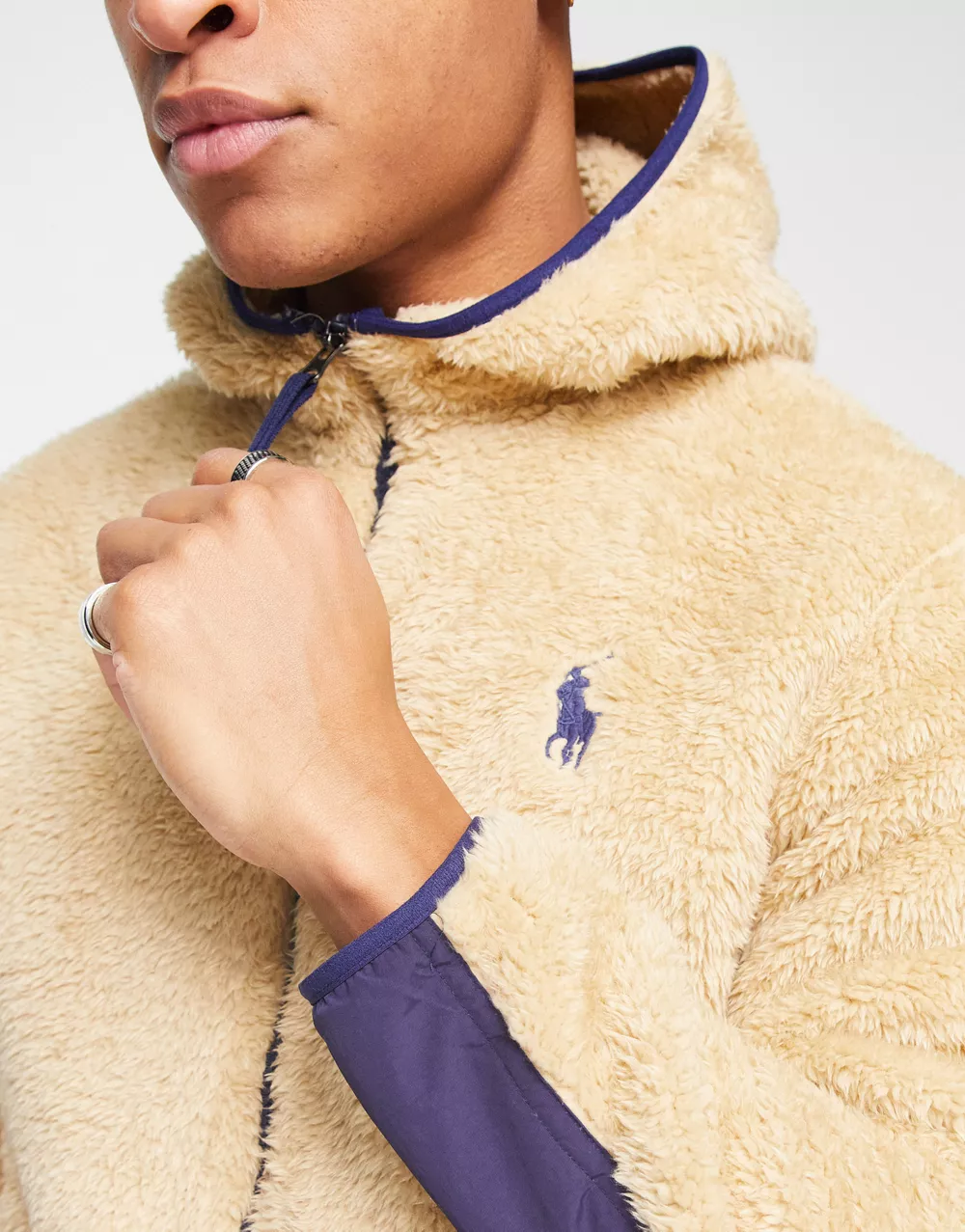 - Polo Ralph Lauren icon logo curly borg colourblock full zip hoodie in sand/navy