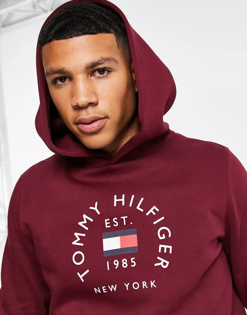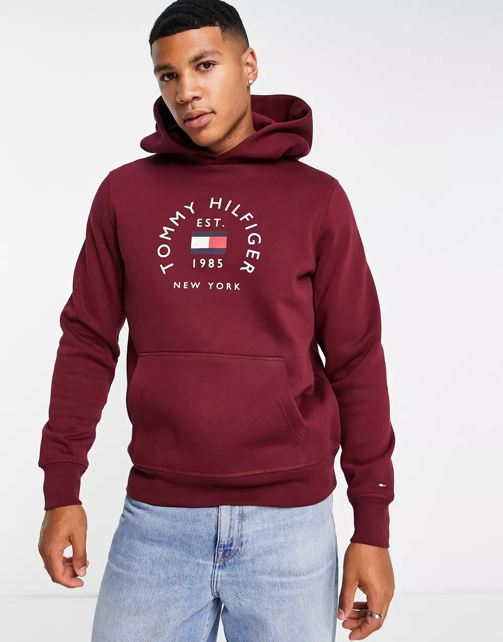 - Tommy Hilfiger flag arch logo cotton blend hoodie in burgundy