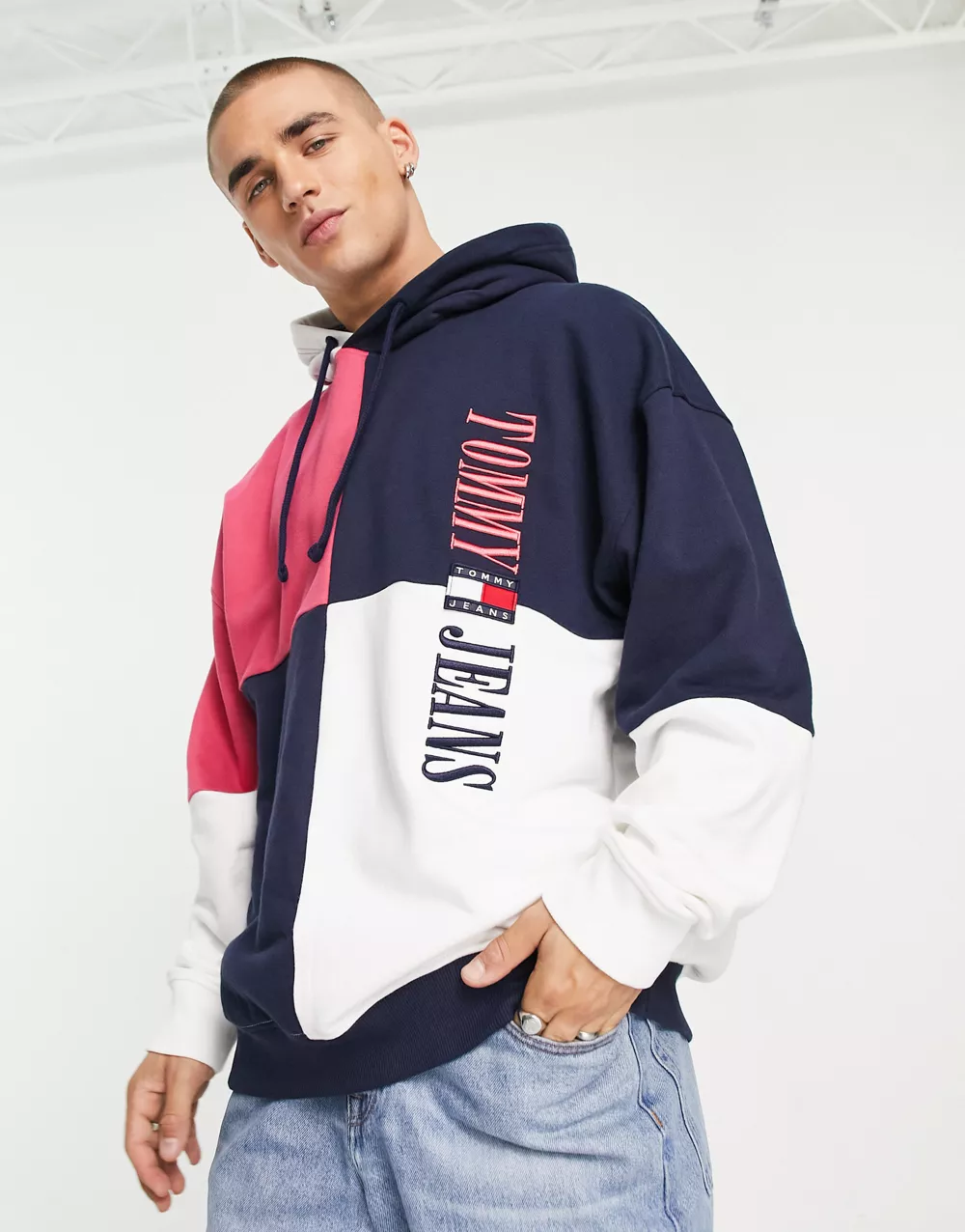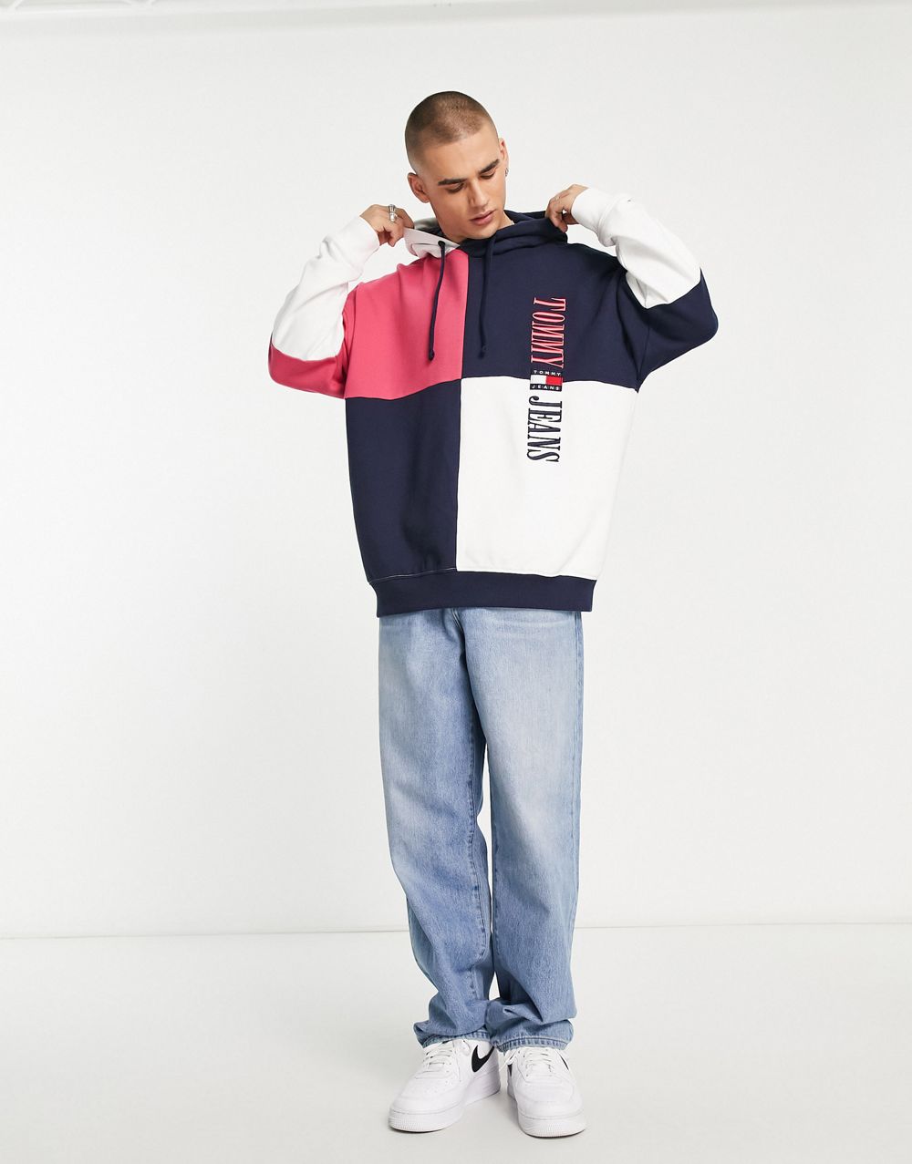 - Tommy Jeans archive logo colourblock hoodie skater fit in navy