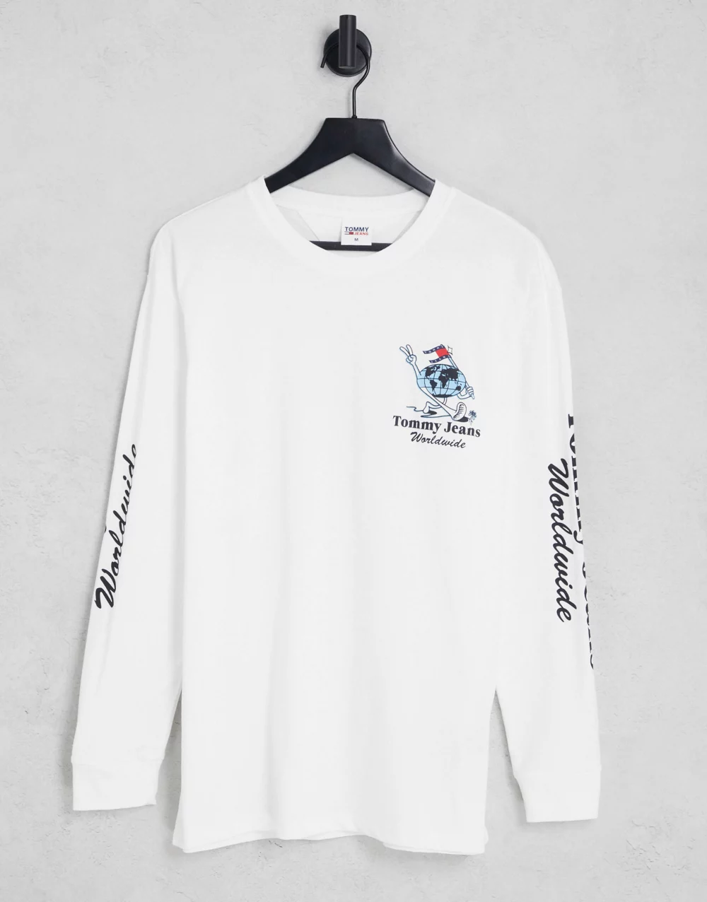 - Tommy Jeans philosotee back print long sleeve top relaxed fit in white