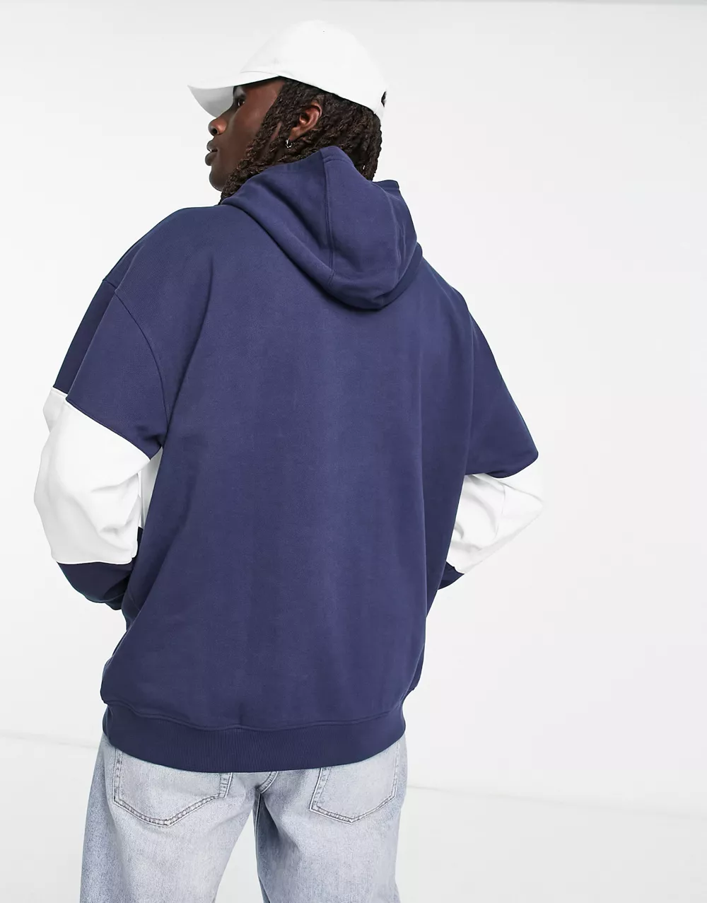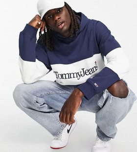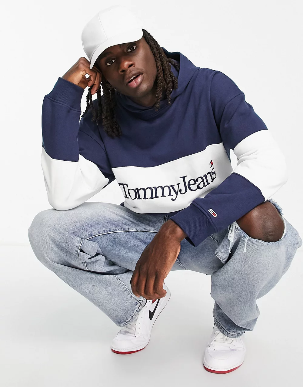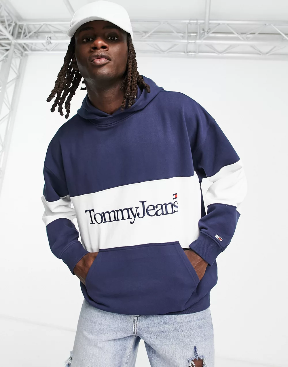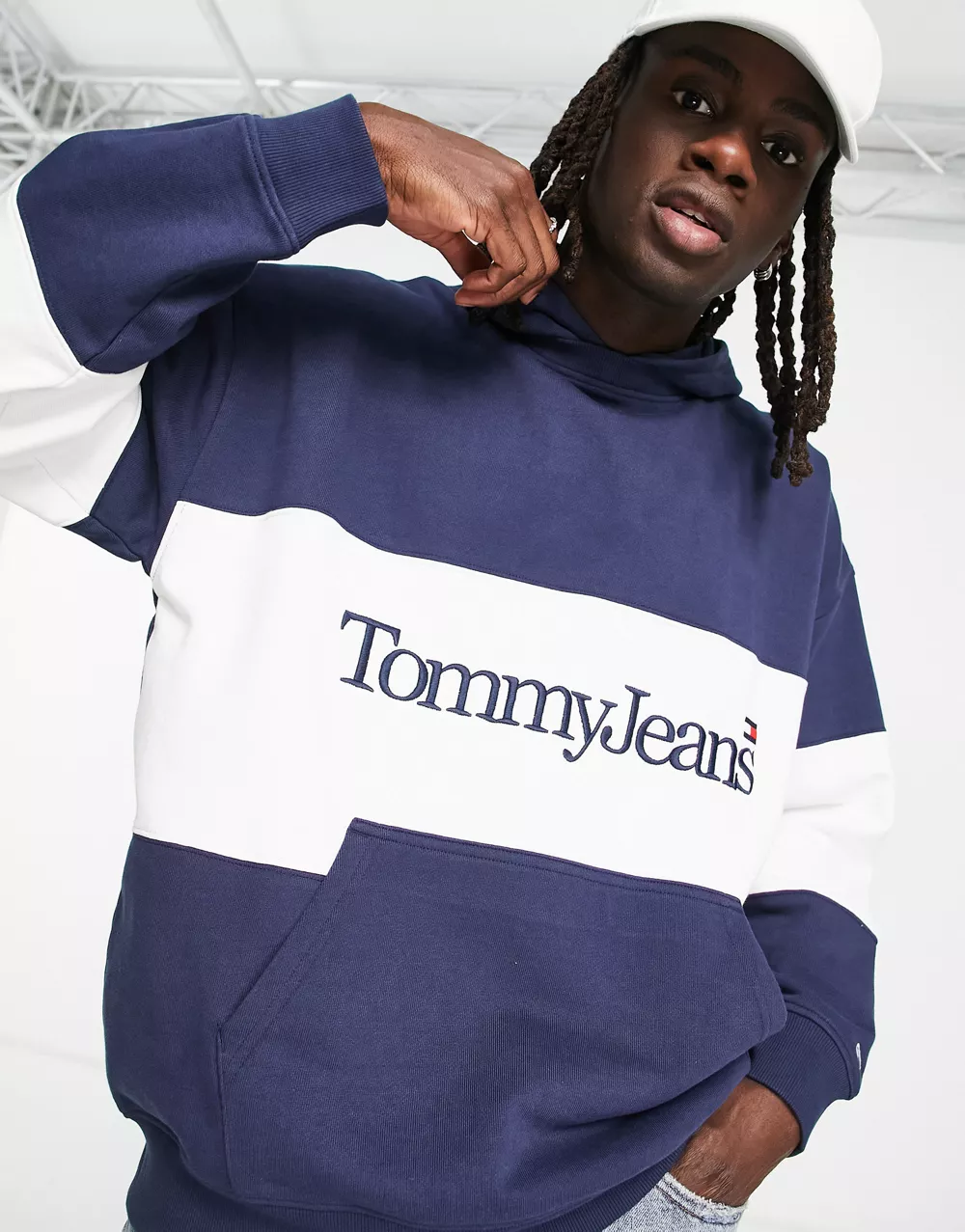 - Tommy Jeans skater fit serif linear logo colourblock hoodie in navy