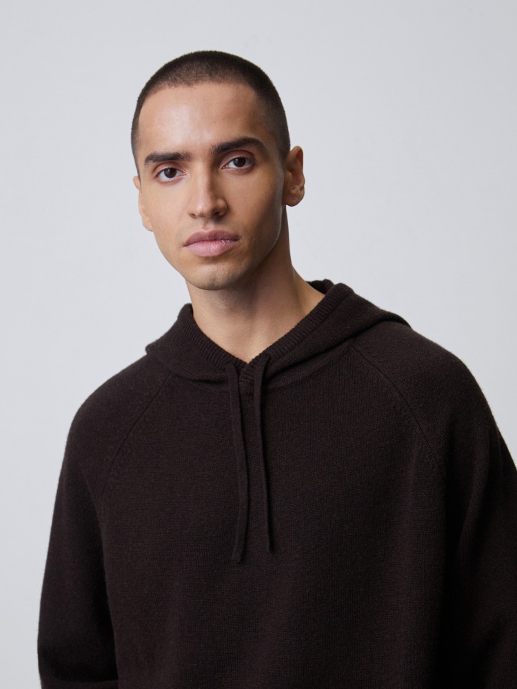 Вязаное худи — расслабленная версия джемпера, альтернатива спортивным толстовкам. Худи связали из шерсти мериноса, которую сделали еще мягче и нежнее с помощью волокон кашемира. Эта теплая и слегка пушистая нить отличается природной эластичностью: если вы храните худи на полке, складки на нем быстро разглаживаются, а само оно хорошо сохраняет форму. При трении о шершавые поверхности трикотаж может скатываться — в таком случае, пожалуйста, удаляйте пилли с помощью машинки по уходу за шерстью.