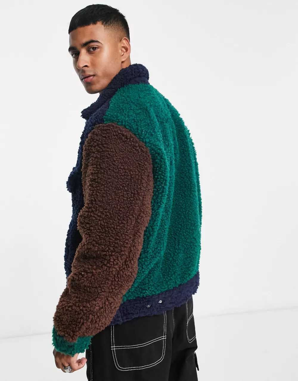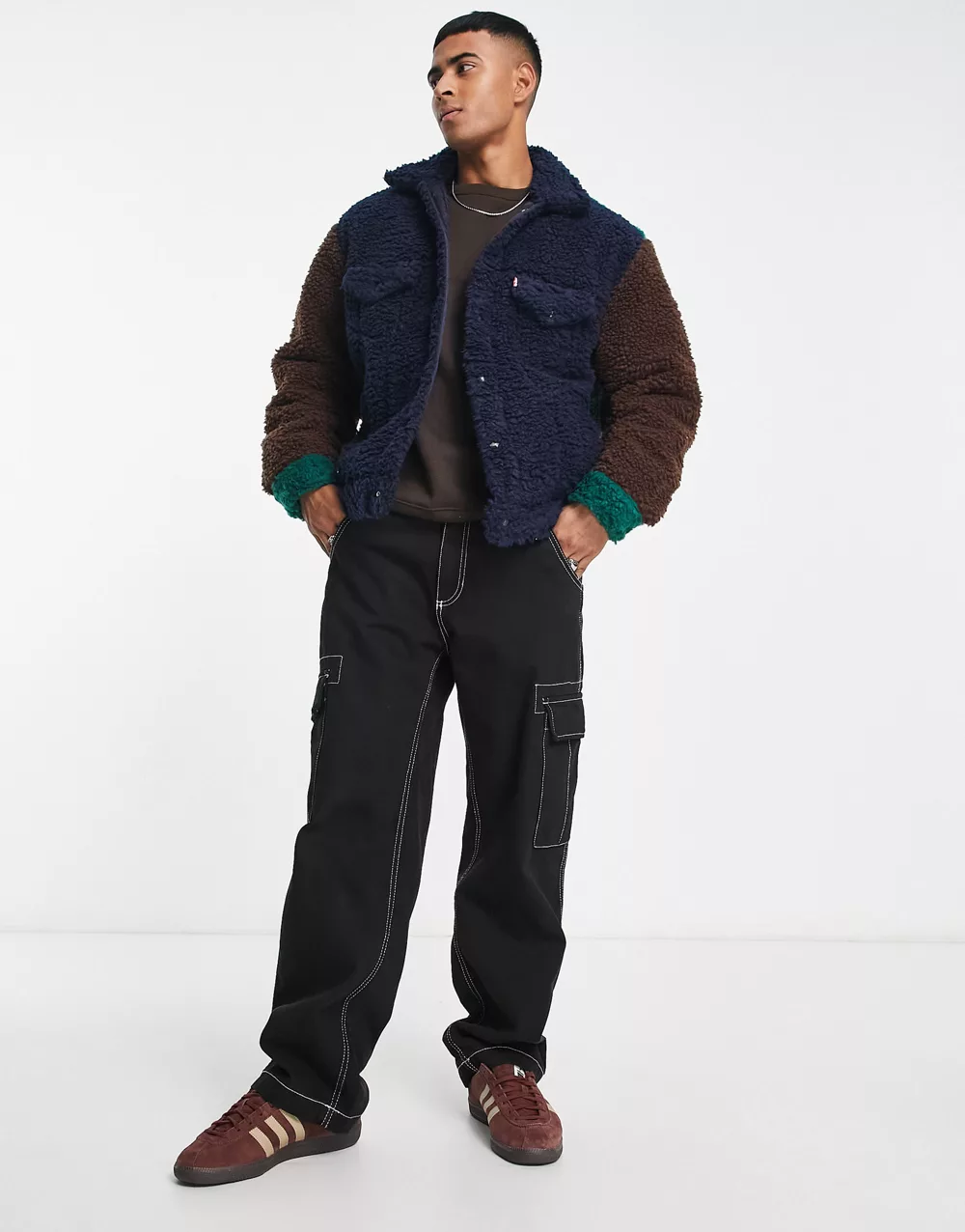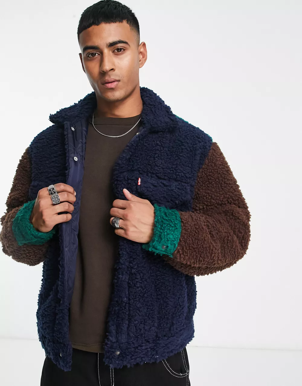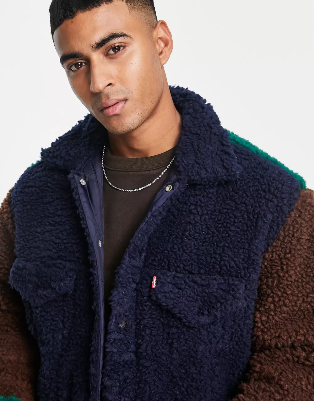- Levi's sherpa trucker jacket in colour block navy brown green with pockets